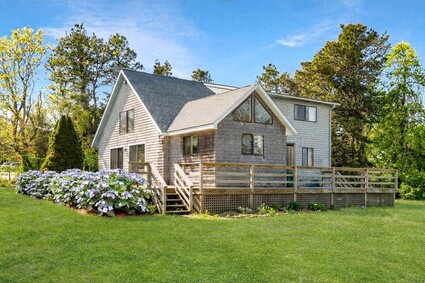 Just a few blocks to historic Edgartown Village from this updated beach house in desirable Edgartown Estates. The open living area features decorative wood beams, a wood stove, designer tile flooring, and sliding doors to an expansive wraparound Trex deck (2018), creating seamless indoor-outdoor living. The expanded kitchen (2018) includes granite countertops, stainless steel appliances, ample storage, and natural light. Three bedrooms include a private primary suite with renovated en-suite bath, and comfortable guest accommodations. The finished lower-level bonus room with floating Pergo flooring is ideal for recreation or secure owner storage. Outdoor amenities include a classic Vineyard outdoor shower, storage shed, Belgian Block driveway accents, and mature landscaping. A four-bedroom septic system allows for future expansion. Offered turnkey, ideal for year-round enjoyment or strong seasonal rental income, all convenient to Edgartown Village, bike paths, and South Beach.