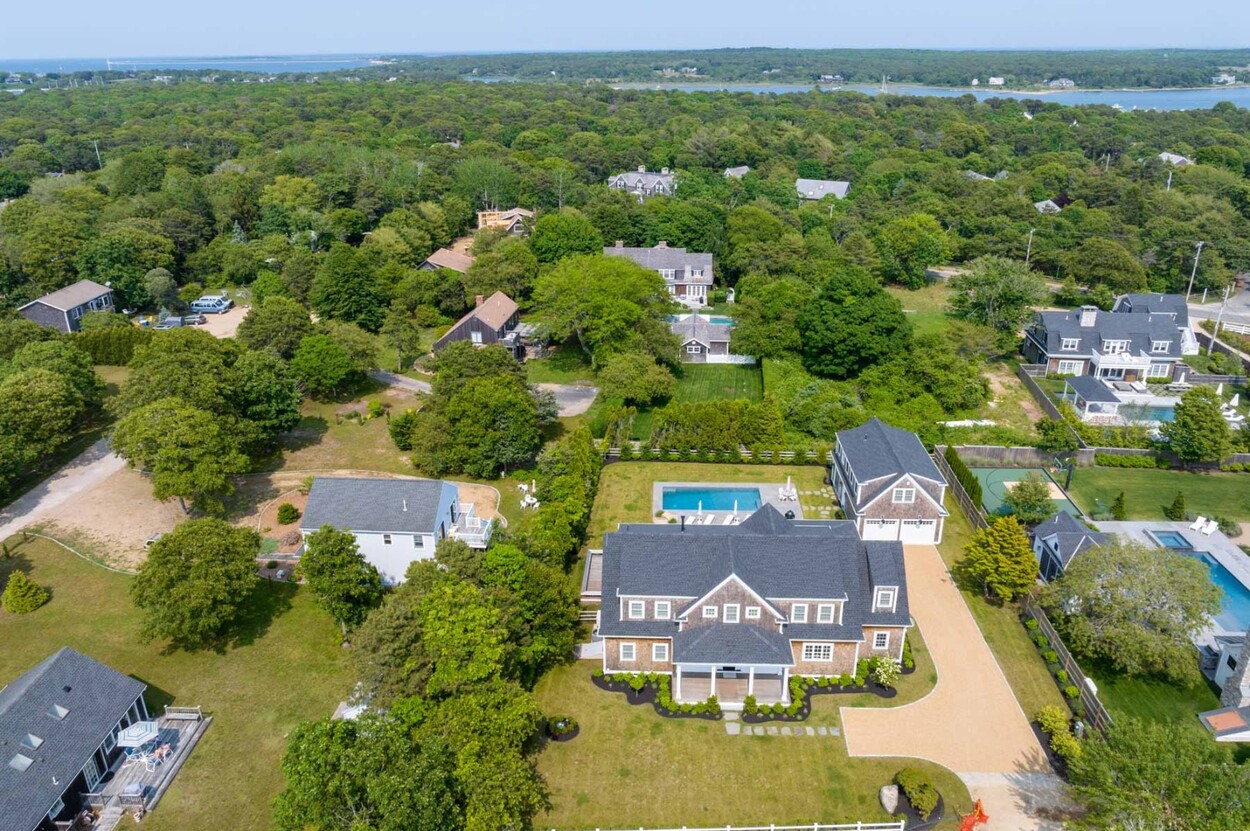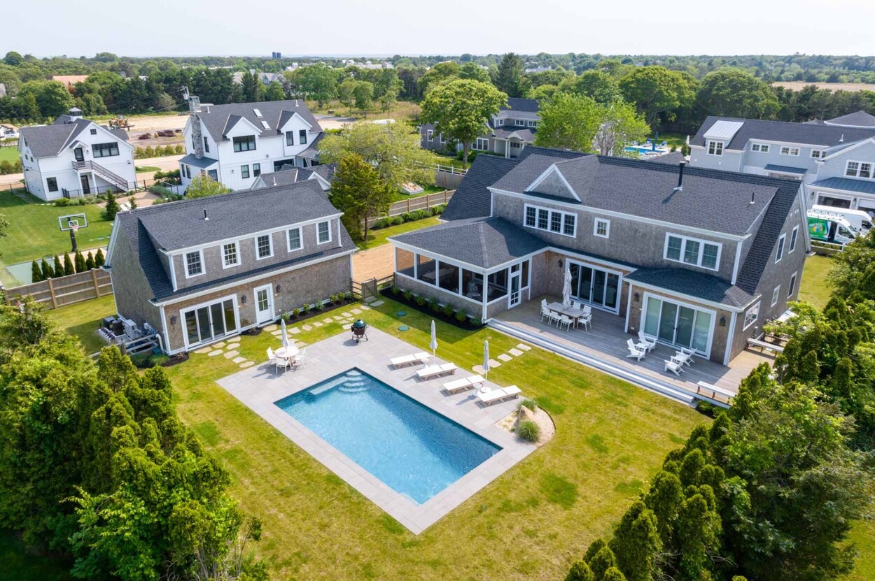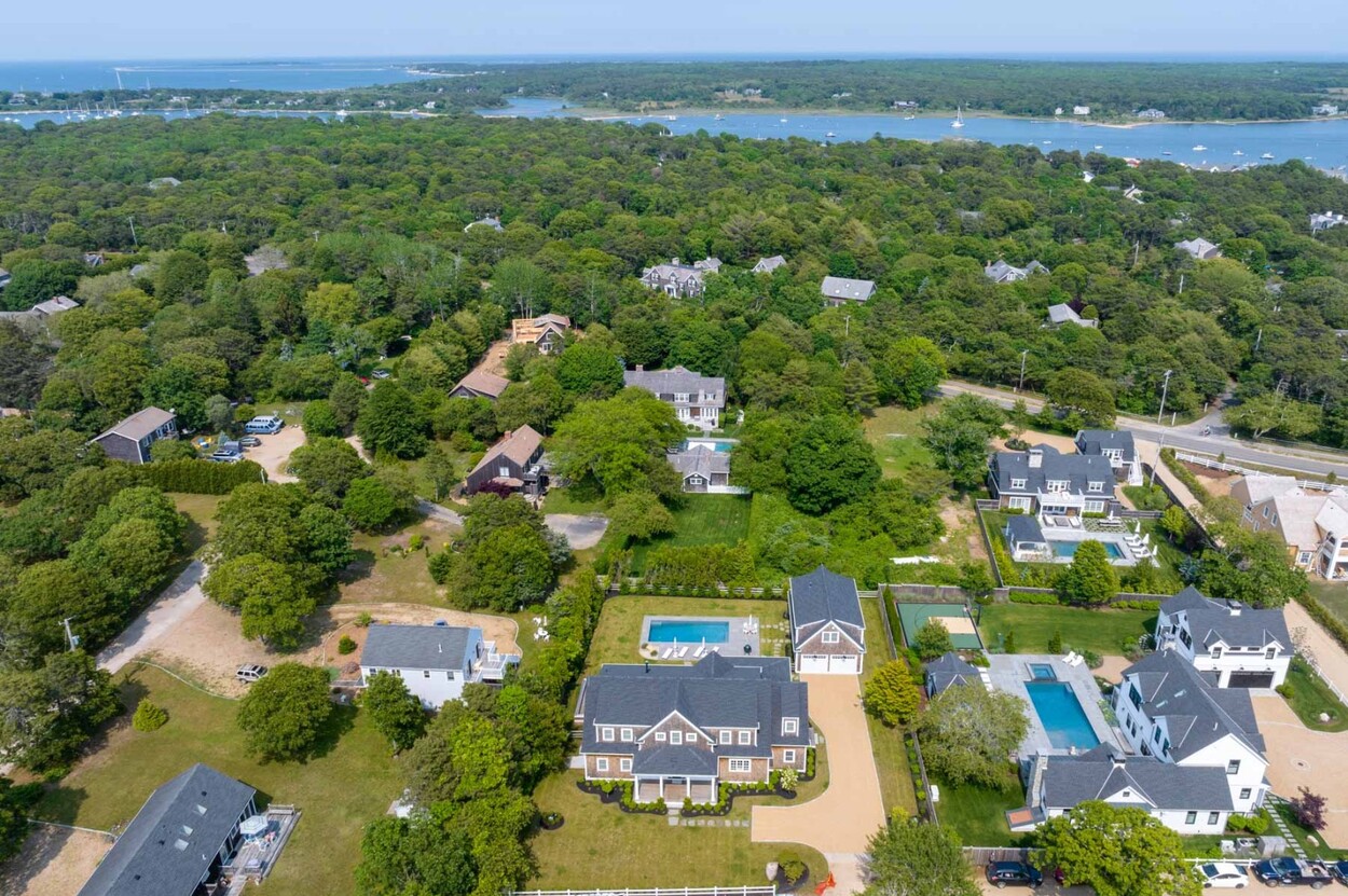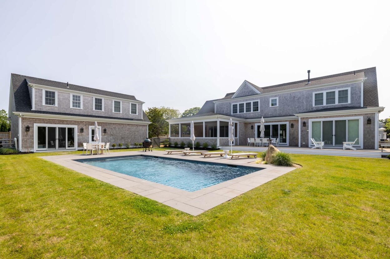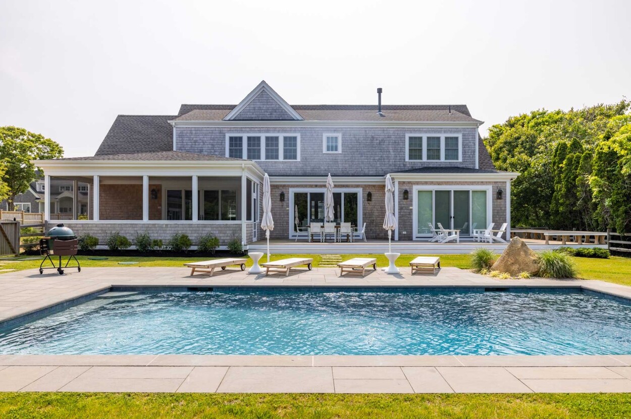 KATAMA COMPOUND WITH POOL - TURNKEY. In an enclave of luxury homes in Katama, this 2021-built 5 bedroom, 5 bathroom property with three half-baths is being delivered turnkey with fine furnishings and artwork. The home has everything the modern buyer wants, including two primary bedroom suites (one upstairs, one downstairs), all bedrooms with ensuite bathrooms, two laundry rooms, detached guest quarters, high-end music system, a beautiful pool area, the list goes on. In addition to the 4700-sf main house with 4 ensuite bedrooms there is a Carriage House with a bedroom suite upstairs. In 3 years time this detached bedroom can be converted into full guest apartment by converting unfinished space into a living room and kitchen. The Carriage House also includes a poolhouse with half bath and a 2-car garage.