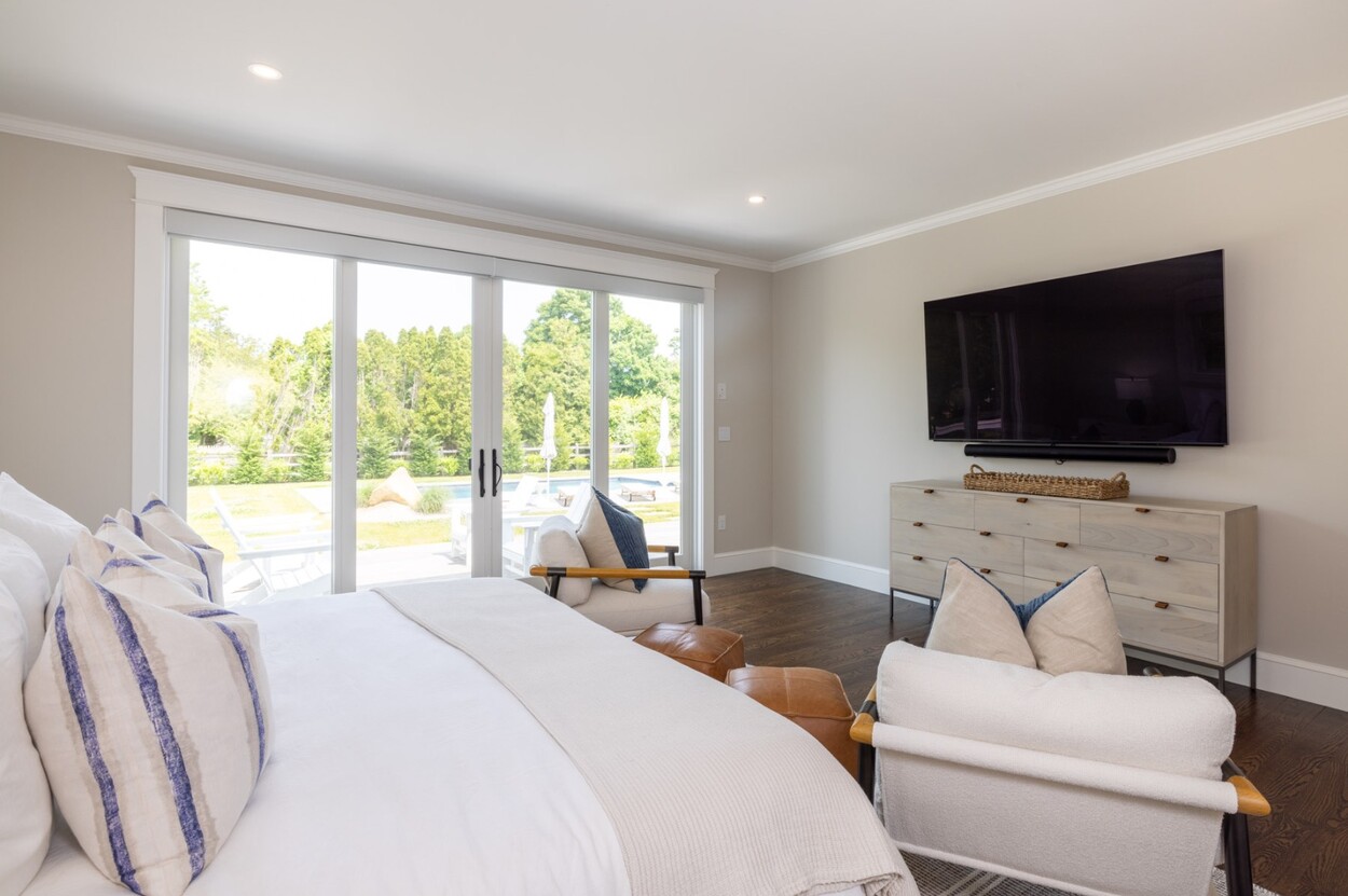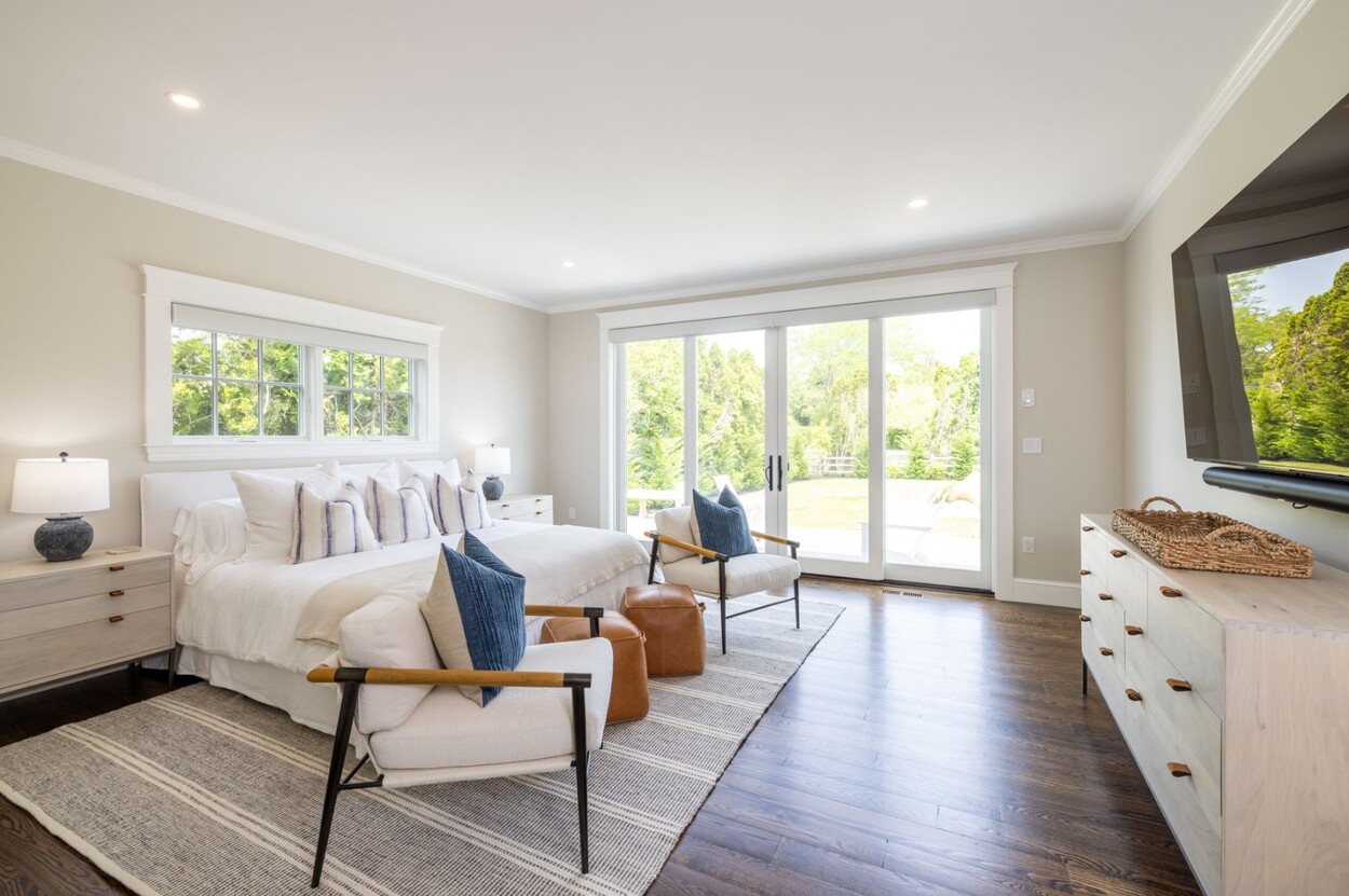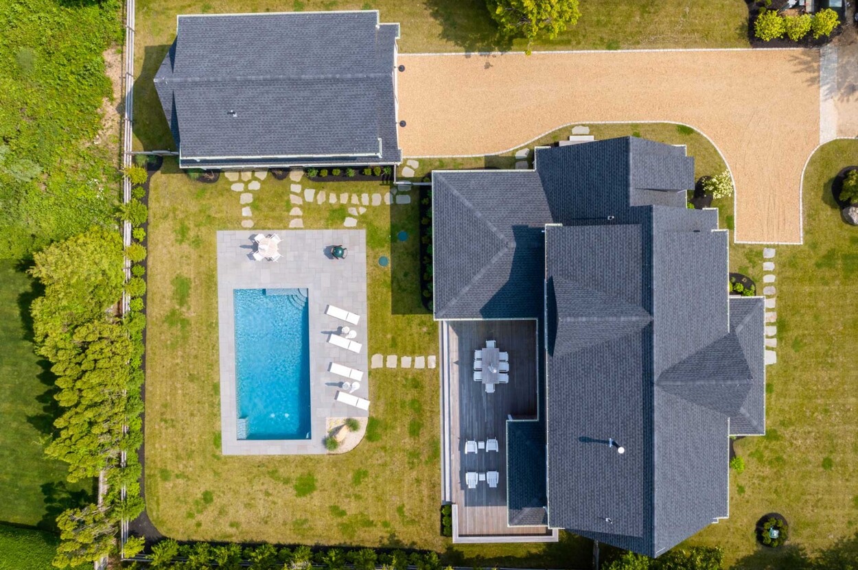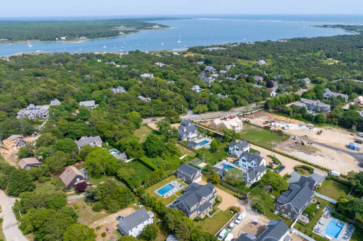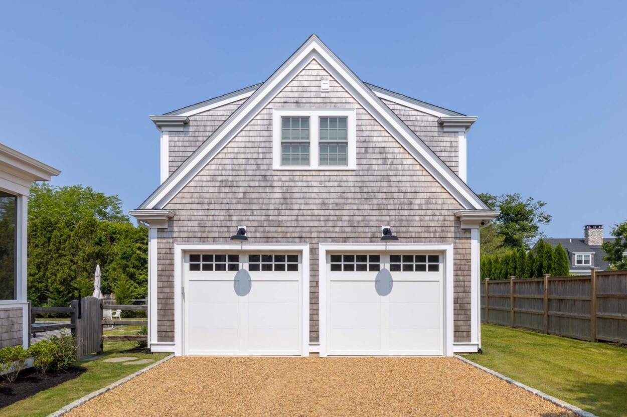 KATAMA COMPOUND WITH POOL - TURNKEY. In an enclave of luxury homes in Katama, this 2021-built 5 bedroom, 5 bathroom property with three half-baths is being delivered turnkey with fine furnishings and artwork. The home has everything the modern buyer wants, including two primary bedroom suites (one upstairs, one downstairs), all bedrooms with ensuite bathrooms, two laundry rooms, detached guest quarters, high-end music system, a beautiful pool area, the list goes on. In addition to the 4700-sf main house with 4 ensuite bedrooms there is a Carriage House with a bedroom suite upstairs. In 3 years time this detached bedroom can be converted into full guest apartment by converting unfinished space into a living room and kitchen. The Carriage House also includes a poolhouse with half bath and a 2-car garage.