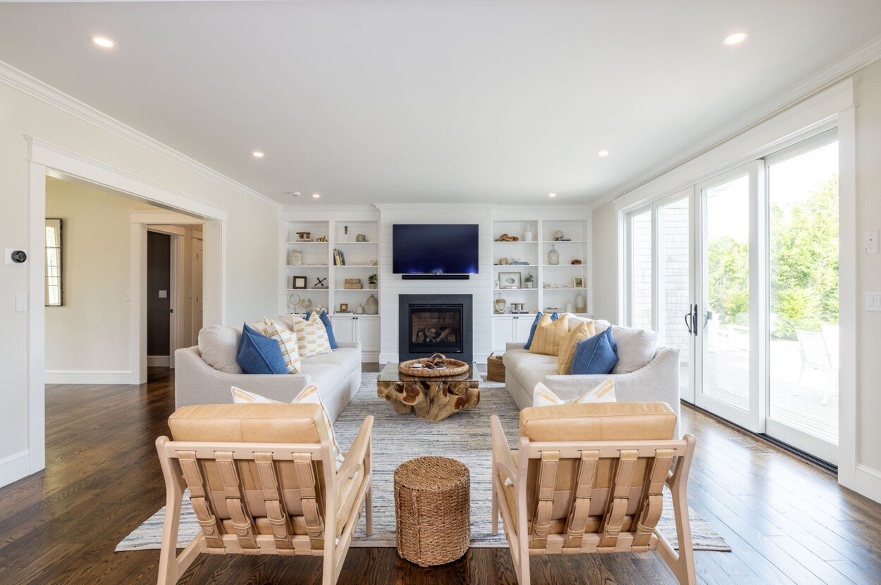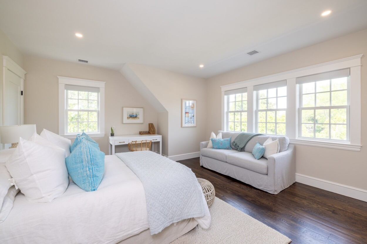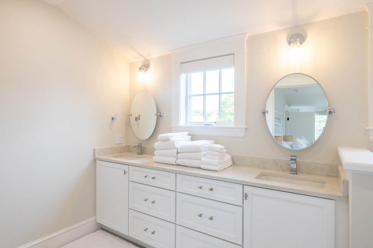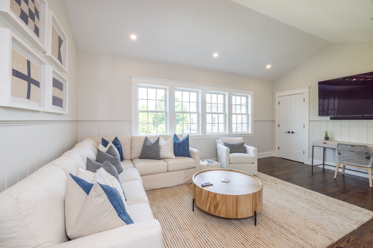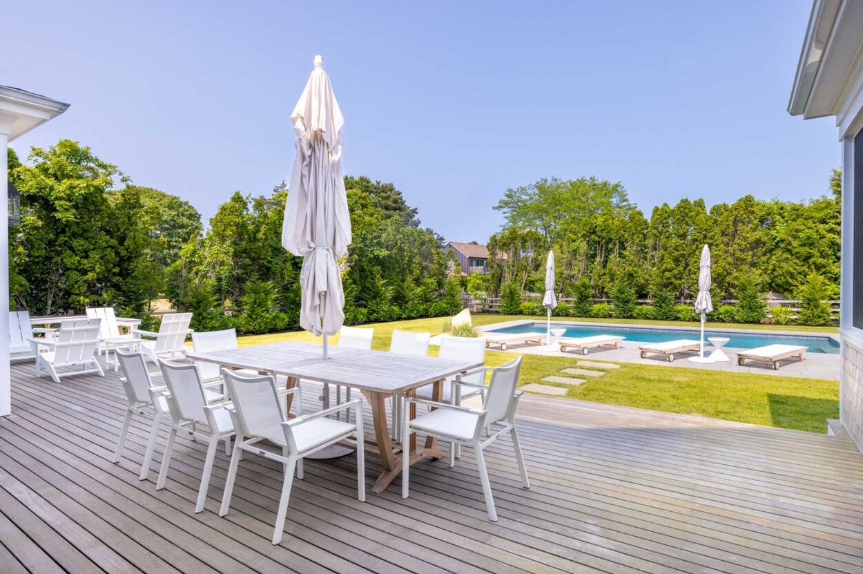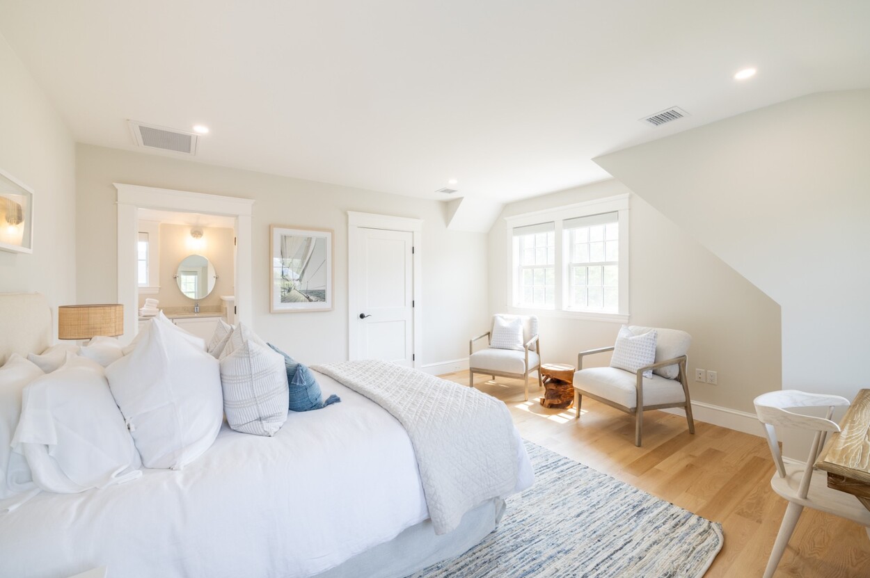 KATAMA COMPOUND WITH POOL - TURNKEY. In an enclave of luxury homes in Katama, this 2021-built 5 bedroom, 5 bathroom property with three half-baths is being delivered turnkey with fine furnishings and artwork. The home has everything the modern buyer wants, including two primary bedroom suites (one upstairs, one downstairs), all bedrooms with ensuite bathrooms, two laundry rooms, detached guest quarters, high-end music system, a beautiful pool area, the list goes on. In addition to the 4700-sf main house with 4 ensuite bedrooms there is a Carriage House with a bedroom suite upstairs. In 3 years time this detached bedroom can be converted into full guest apartment by converting unfinished space into a living room and kitchen. The Carriage House also includes a poolhouse with half bath and a 2-car garage.