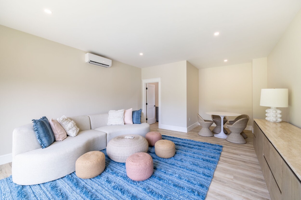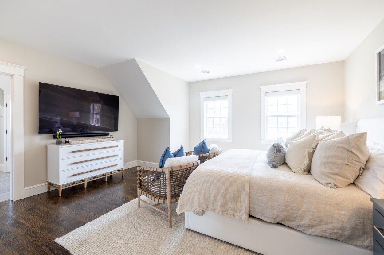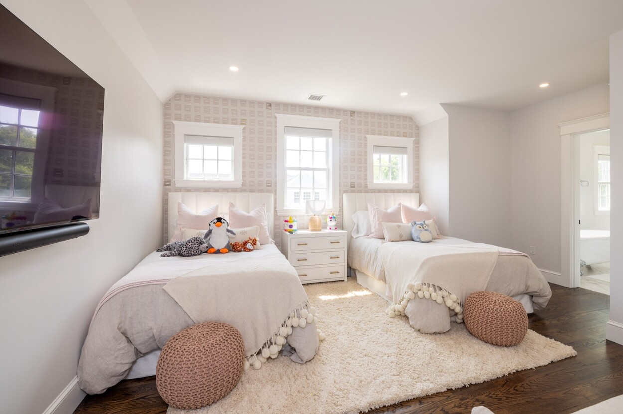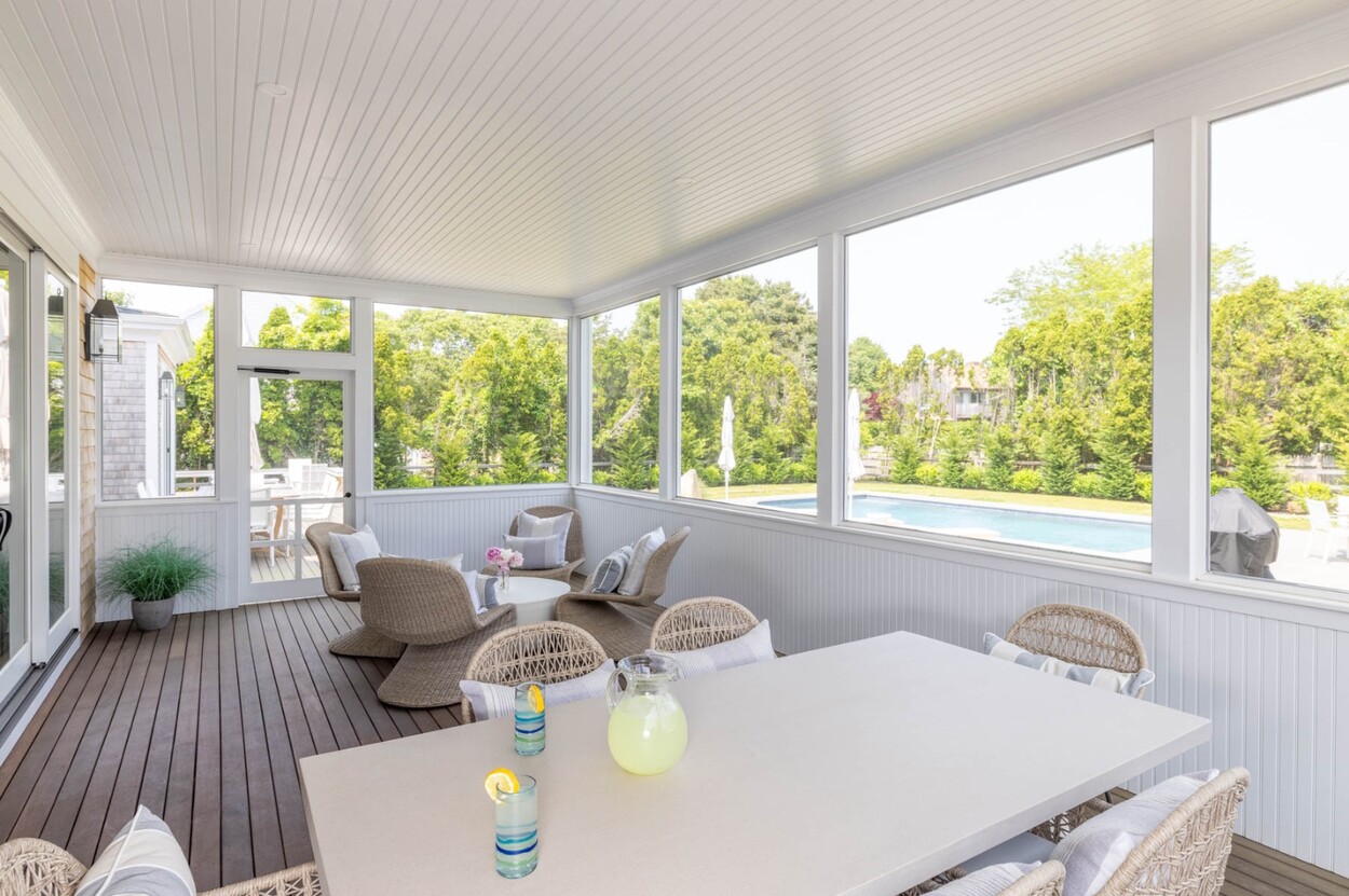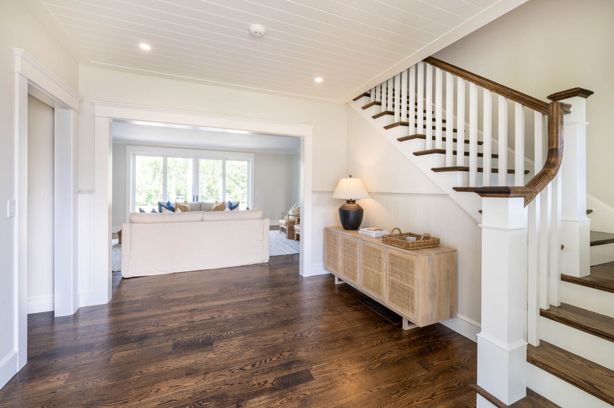 KATAMA COMPOUND WITH POOL - TURNKEY. In an enclave of luxury homes in Katama, this 2021-built 5 bedroom, 5 bathroom property with three half-baths is being delivered turnkey with fine furnishings and artwork. The home has everything the modern buyer wants, including two primary bedroom suites (one upstairs, one downstairs), all bedrooms with ensuite bathrooms, two laundry rooms, detached guest quarters, high-end music system, a beautiful pool area, the list goes on. In addition to the 4700-sf main house with 4 ensuite bedrooms there is a Carriage House with a bedroom suite upstairs. In 3 years time this detached bedroom can be converted into full guest apartment by converting unfinished space into a living room and kitchen. The Carriage House also includes a poolhouse with half bath and a 2-car garage.