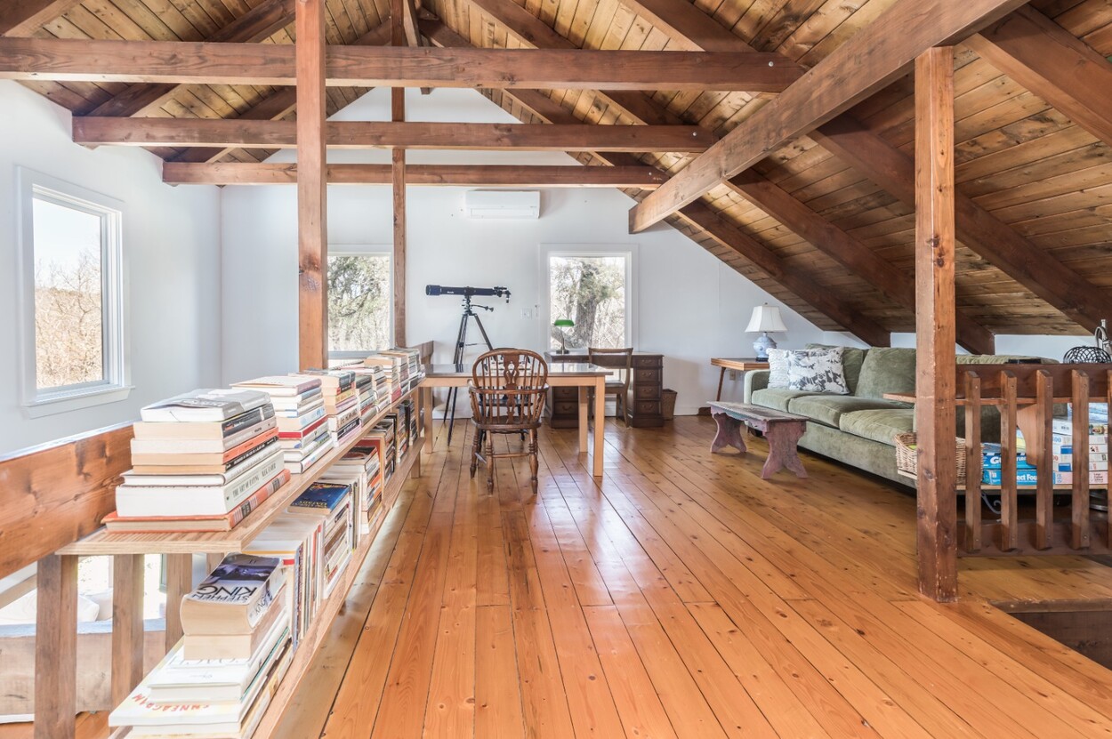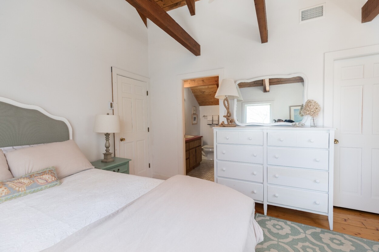 The main level boasts a kitchen fitted with high-end appliances and opens to the dining room, deck, and airy living room with exposed beams, a gas fireplace, and large windows throughout, offering an abundance of natural light. The first-floor primary has an ensuite bath, a walk-in closet with generous shelving, and direct access to the deck.