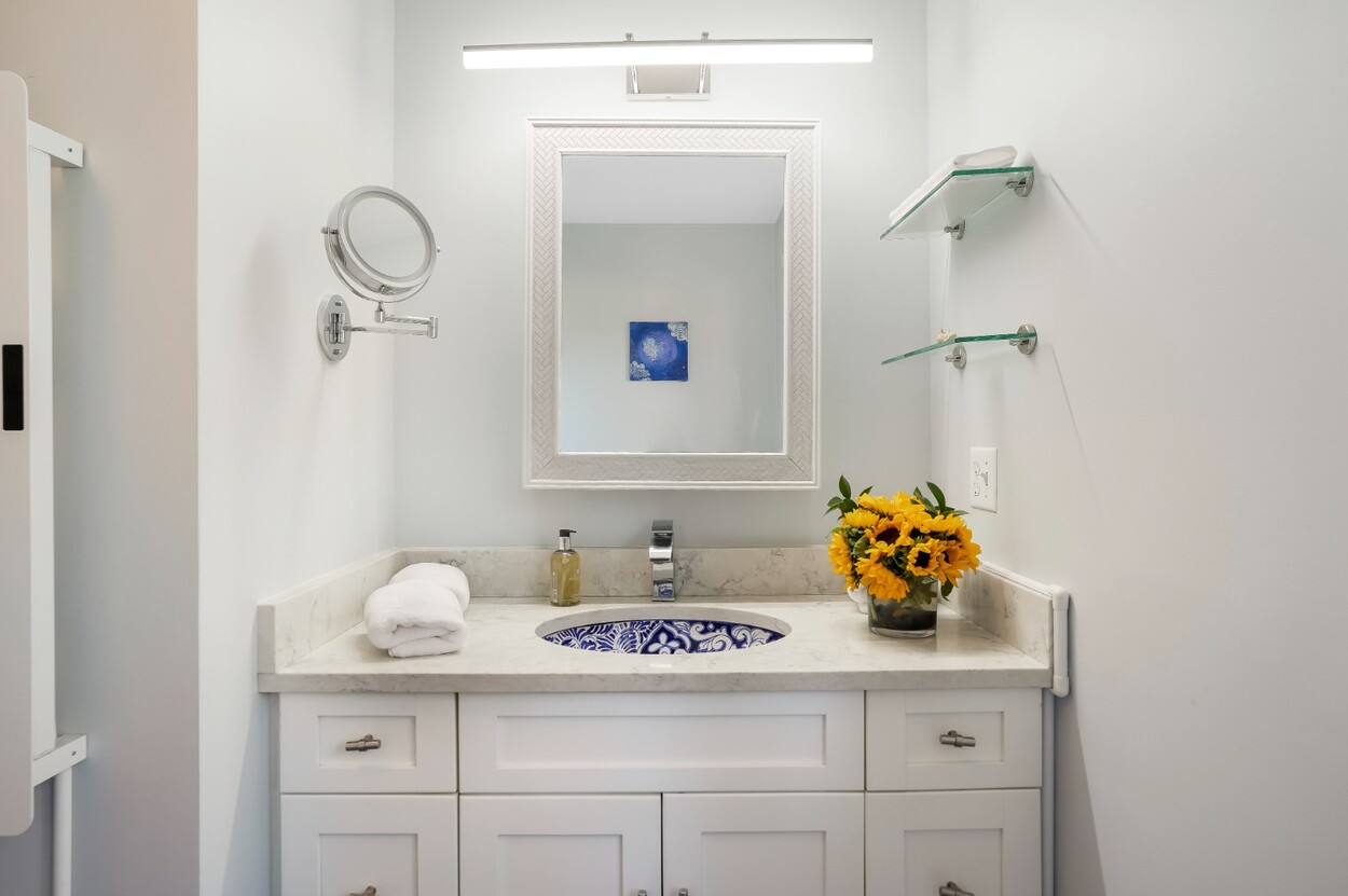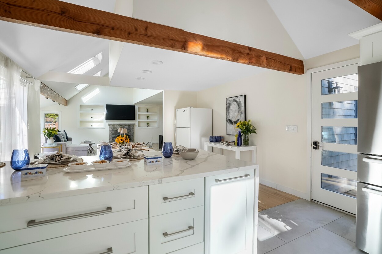 The light-filled kitchen has been updated with quartz countertops, stainless steel appliances, and an induction stove — perfectly suited for both everyday meals and entertaining. A separate laundry room with high-efficiency washer/dryer and built-in cabinetry adds convenience.