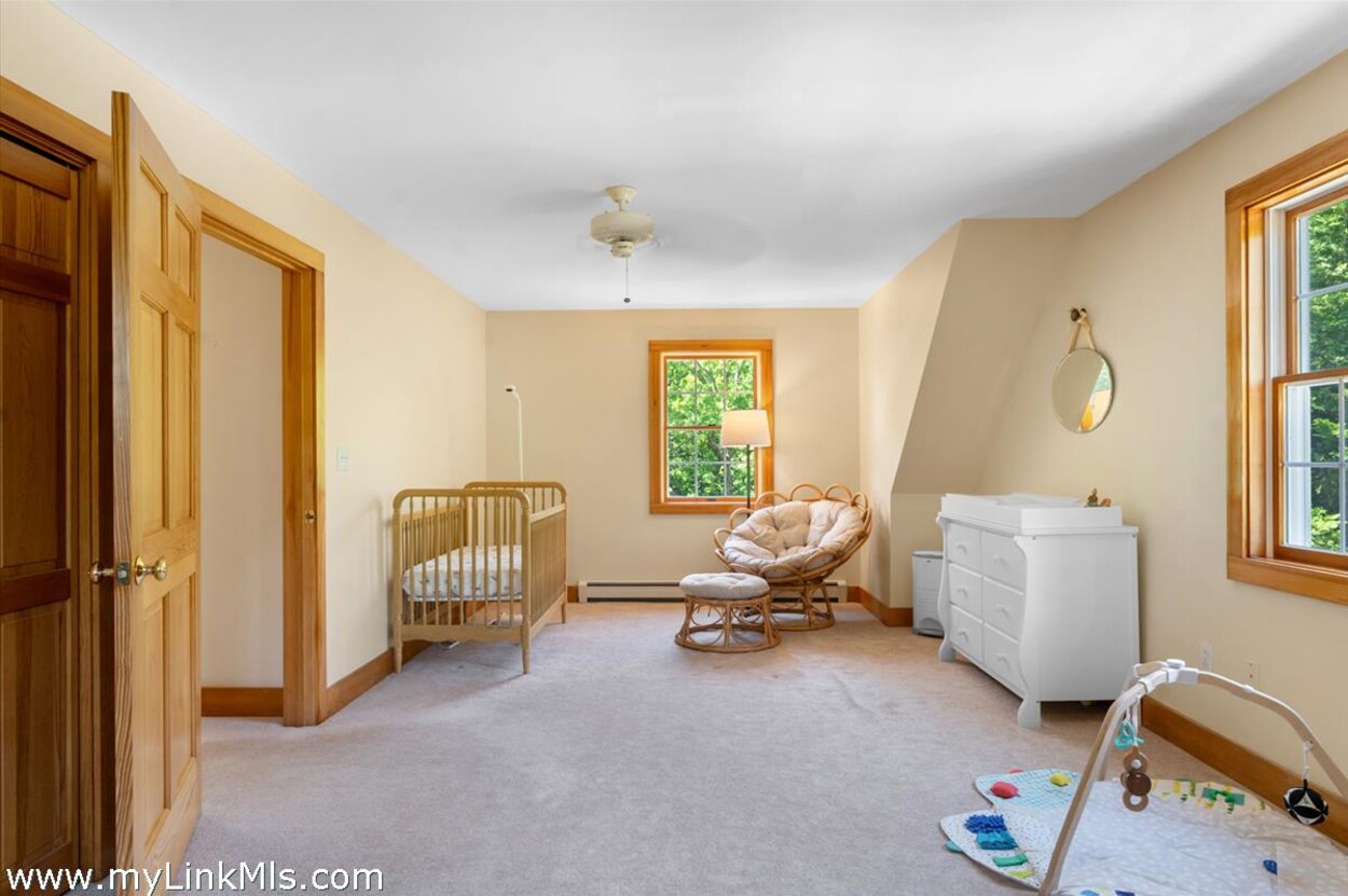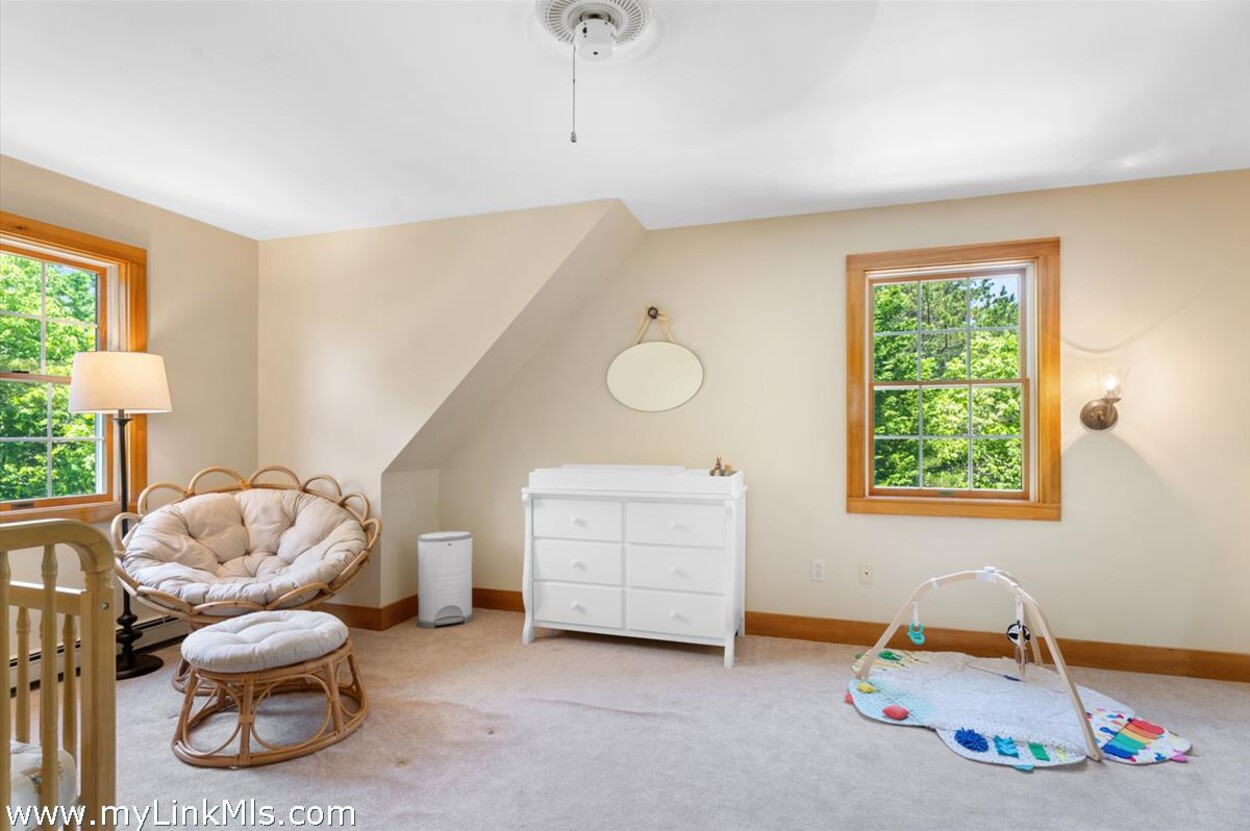 The bright, open interior features a living and dining area with a wood-burning fireplace, a kitchen with a center island, and sliding doors that open to a spacious back deck—ideal for outdoor entertaining. The first floor includes a bedroom and a full bathroom, while the second floor offers two large bedrooms and a shared full bathroom. A full-height, dry basement provides excellent storage and potential for future expansion. The landscaped grounds create a picturesque environment, making it a perfect option for year-round living or rental investment.