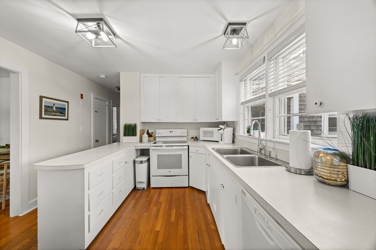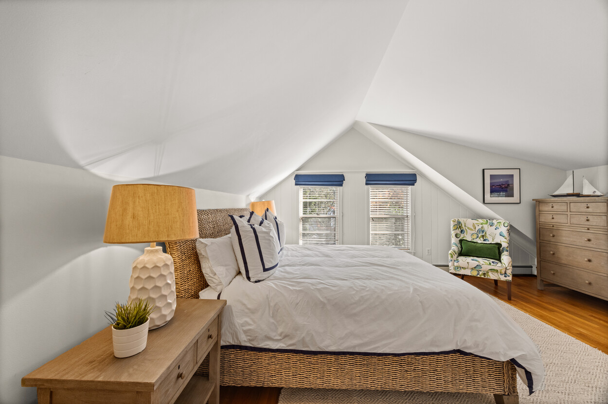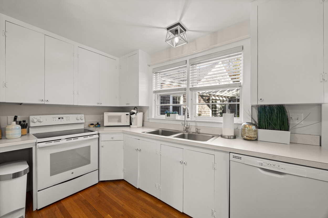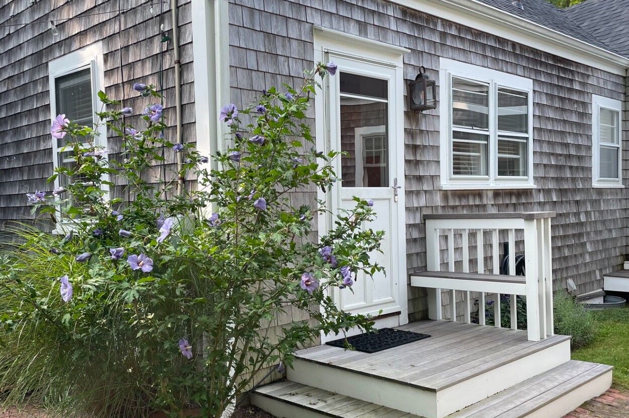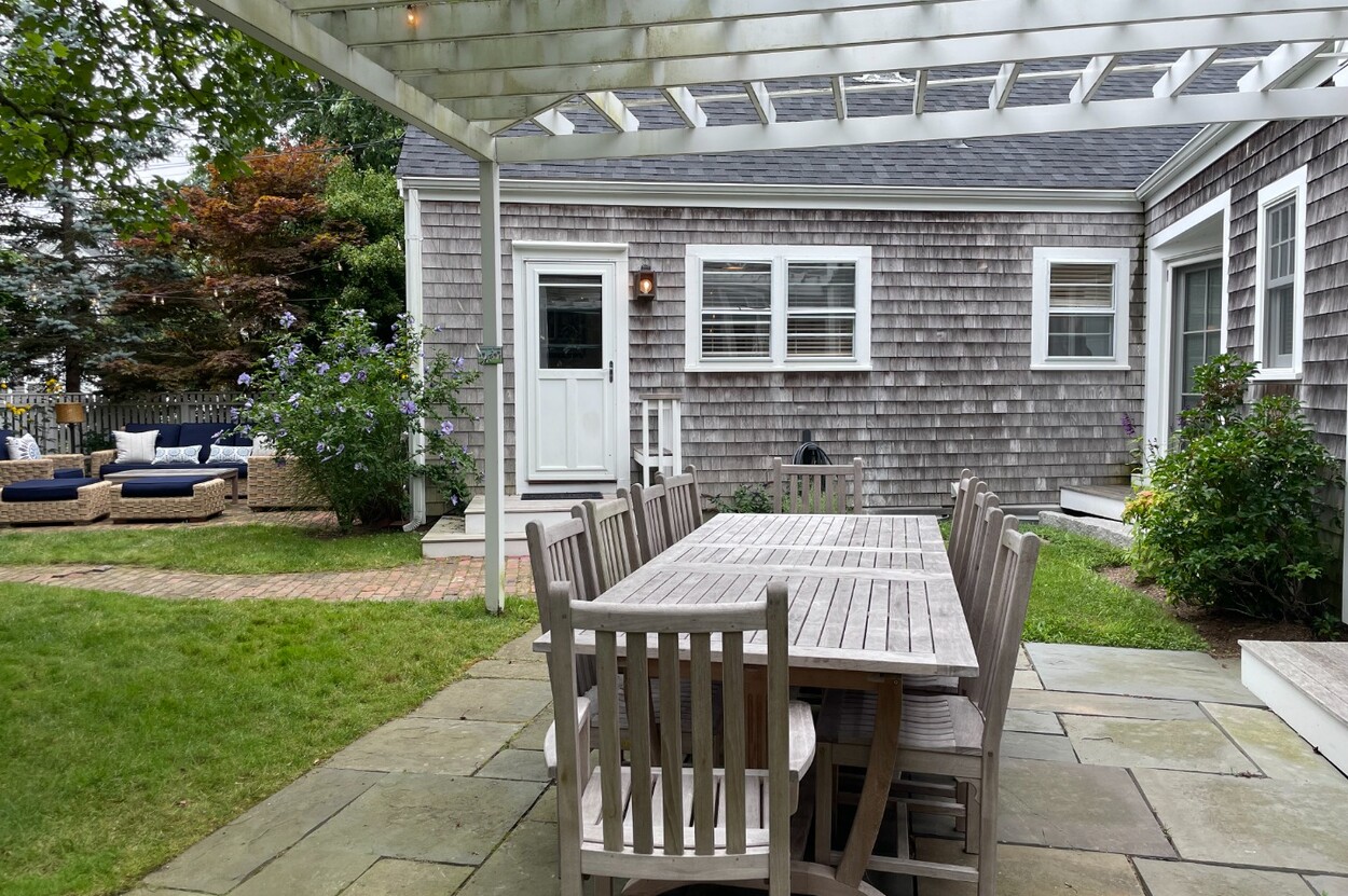Set in the heart of Edgartown Village, this pristine Cape offers an exceptional combination of charm, comfort, and in-town convenience. Just moments from boutique shopping, acclaimed galleries, fine dining, and the scenic harbor, this four-bedroom, three-bath home captures the quintessential Vineyard lifestyle. Two entrances enhance the home’s functionality: a formal front entry leads directly to the inviting living room, while a casual back entrance opens to the bright, cheerful kitchen, complete with a built-in banquette dining area. The outstanding primary wing at the rear of the house features a separate entrance with French doors opening to a pergola patio. The suite boasts a cathedral-ceiling bedroom, a private sitting area, a full bath, and a kitchenette—perfect for extended guests or private retreats. The first floor also includes an additional full bath, a second bedroom, and a convenient laundry room. Upstairs offers a spacious primary bedroom, an additional bedroom, and a full bath.