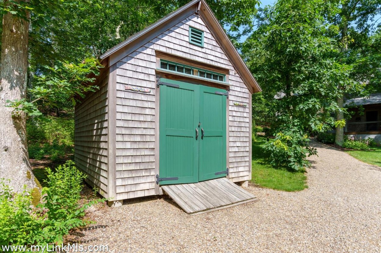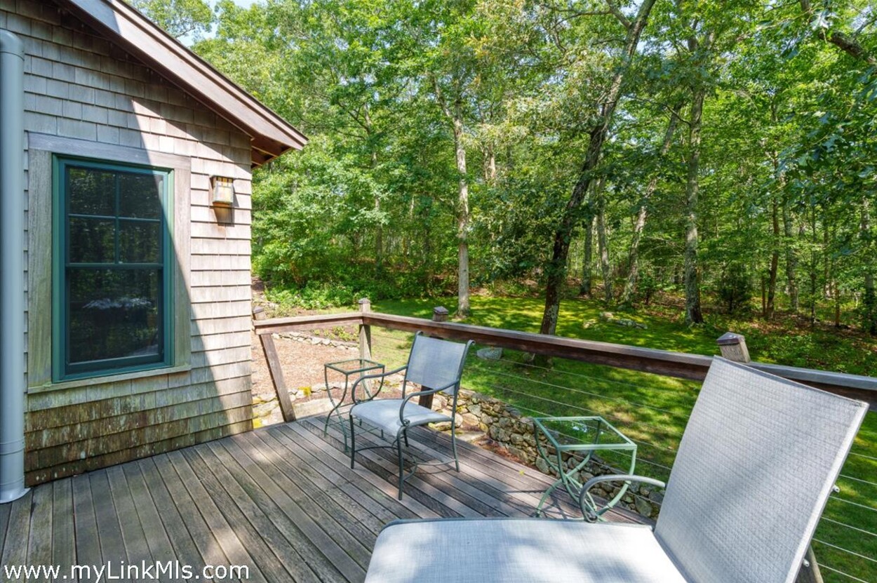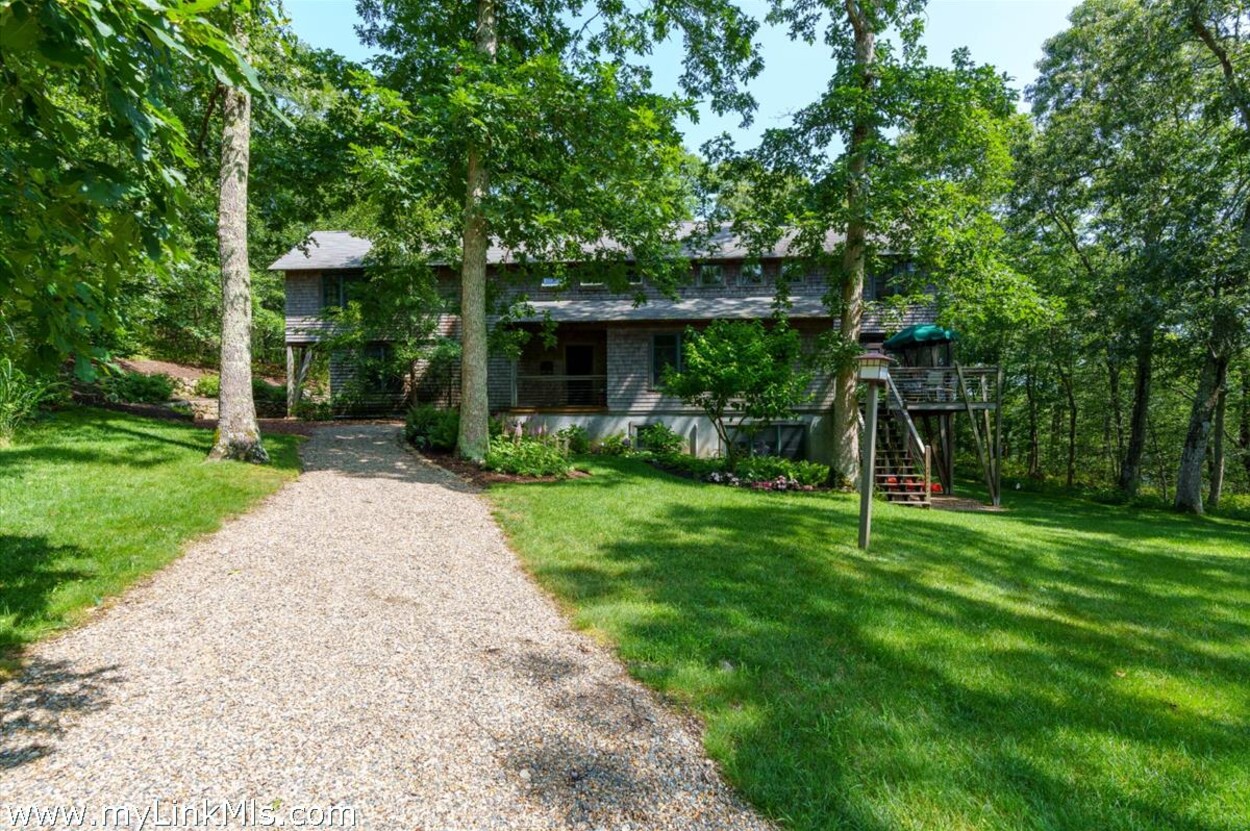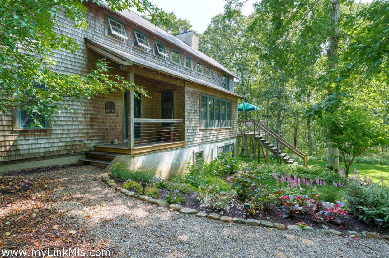 Affectionately referred to as ‘The Treehouse', this property encompasses all the elements of a modern, sophisticated residence while providing the warmth and comfort of a private retreat. Professionally designed by Hutker Architects, this four-bedroom home, with a den/potential fifth bedroom, is sited in a private area, conveniently located with easy access to grocery store, pharmacy, and post office, and also to the island’s most beautiful beach at Lambert’s Cove. This home boasts meticulous attention to detail and exceptional craftsmanship. From the moment you step foot inside, you will notice the open floor plan design that creates a spacious and inviting atmosphere. Each of the four bedrooms has been thoughtfully designed and appointed to provide maximum comfort and privacy. The primary bedroom and ensuite bath and the den are at each end of the upper level, joined by a walkway across the living space. The main level also features a bedroom with ensuite bath, in addition to the large, open kitchen/dining/living space. Two more light-filled bedrooms plus a shared hall bath are located on the above-ground lower level. This is a meticulously maintained home with an open floor plan that is both functional and aesthetically pleasing. The open concept design includes a wood burning fireplace in the living room and a wonderful screened porch with open decks on either side. A back deck includes an outdoor shower.