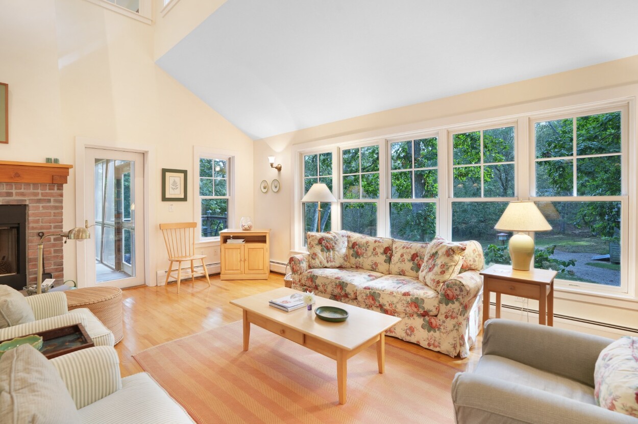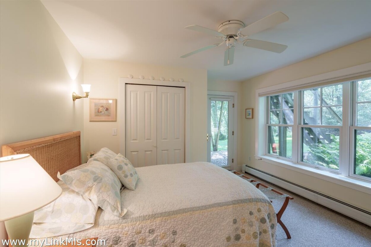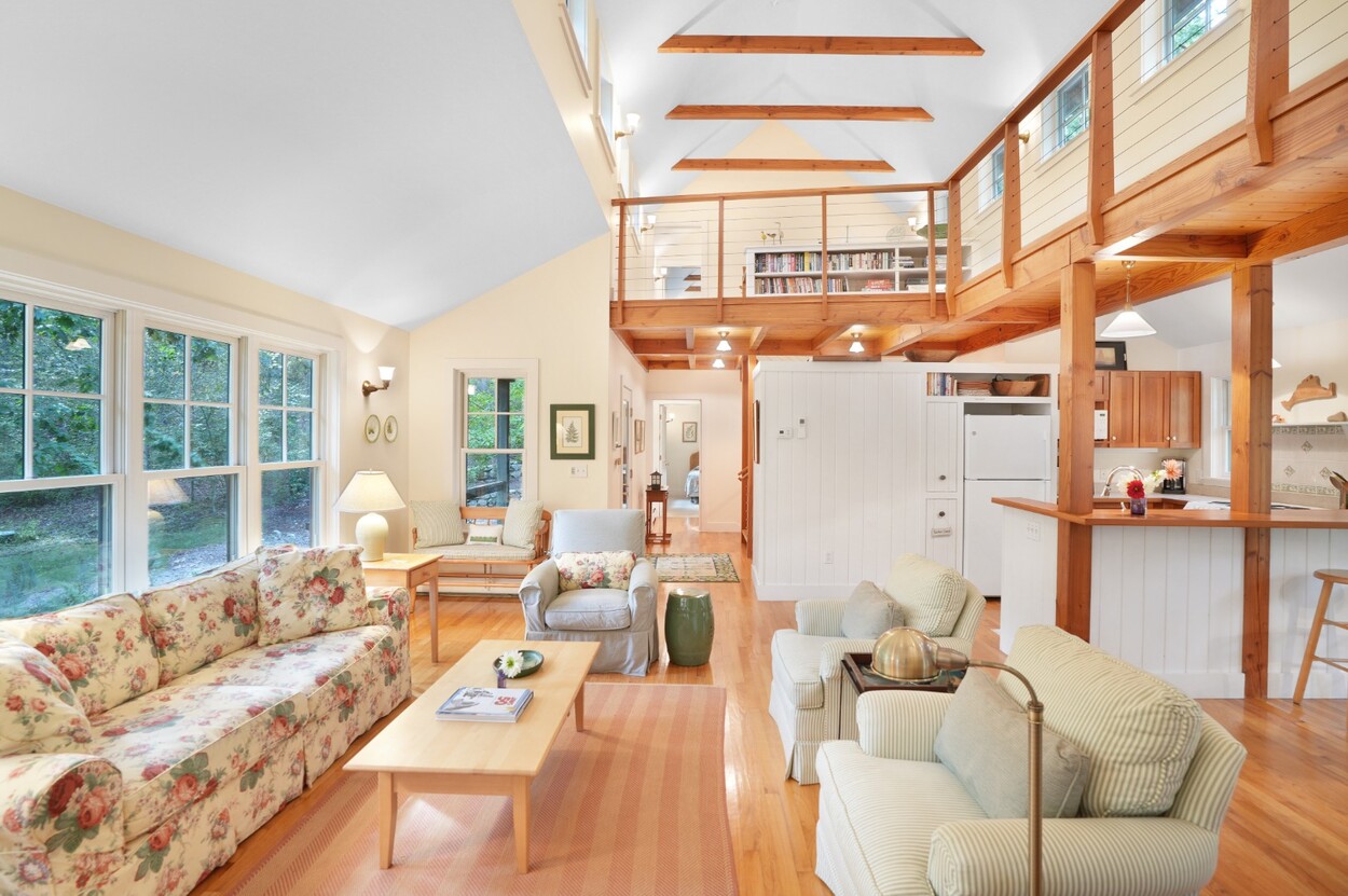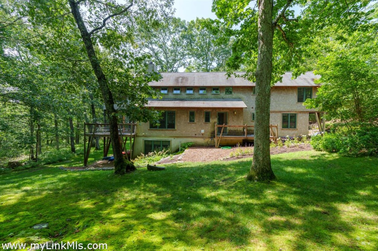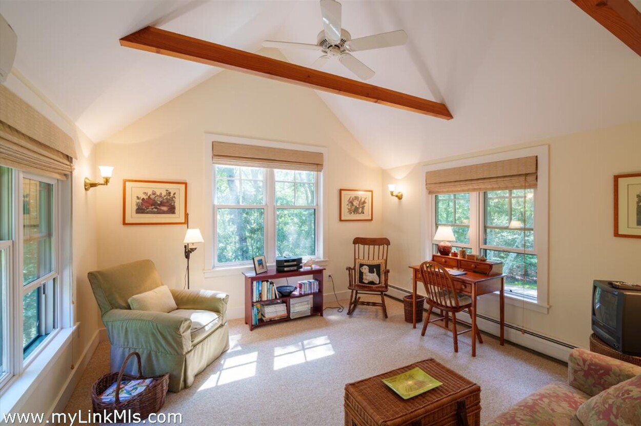 Affectionately referred to as ‘The Treehouse', this property encompasses all the elements of a modern, sophisticated residence while providing the warmth and comfort of a private retreat. Professionally designed by Hutker Architects, this four-bedroom home, with a den/potential fifth bedroom, is sited in a private area, conveniently located with easy access to grocery store, pharmacy, and post office, and also to the island’s most beautiful beach at Lambert’s Cove. This home boasts meticulous attention to detail and exceptional craftsmanship. From the moment you step foot inside, you will notice the open floor plan design that creates a spacious and inviting atmosphere. Each of the four bedrooms has been thoughtfully designed and appointed to provide maximum comfort and privacy. The primary bedroom and ensuite bath and the den are at each end of the upper level, joined by a walkway across the living space. The main level also features a bedroom with ensuite bath, in addition to the large, open kitchen/dining/living space. Two more light-filled bedrooms plus a shared hall bath are located on the above-ground lower level. This is a meticulously maintained home with an open floor plan that is both functional and aesthetically pleasing. The open concept design includes a wood burning fireplace in the living room and a wonderful screened porch with open decks on either side. A back deck includes an outdoor shower.