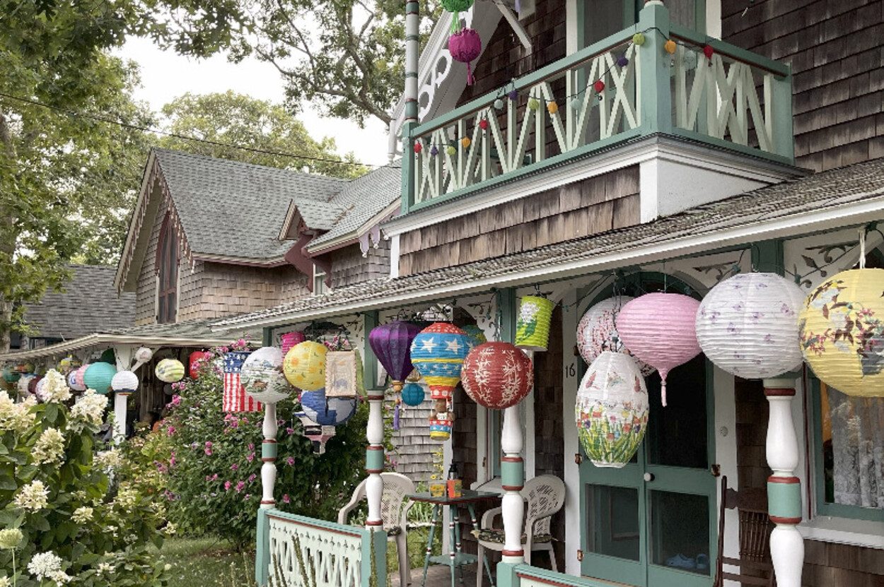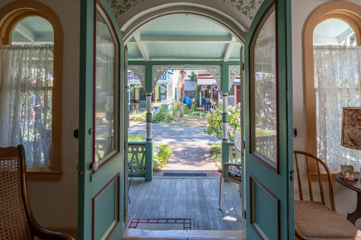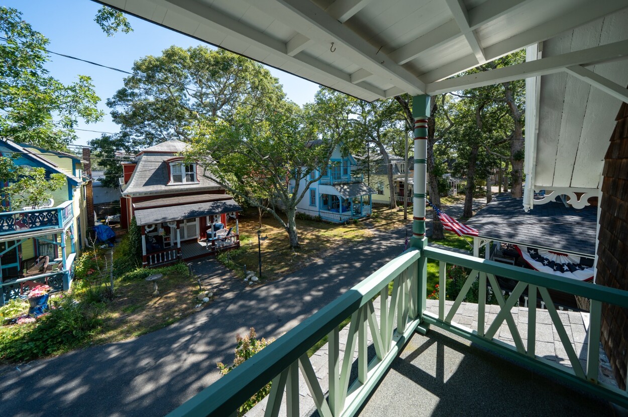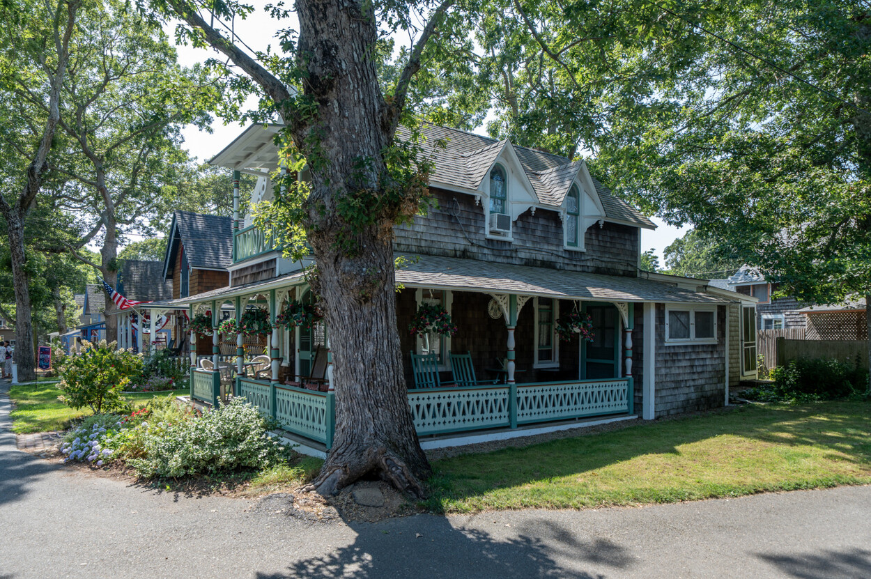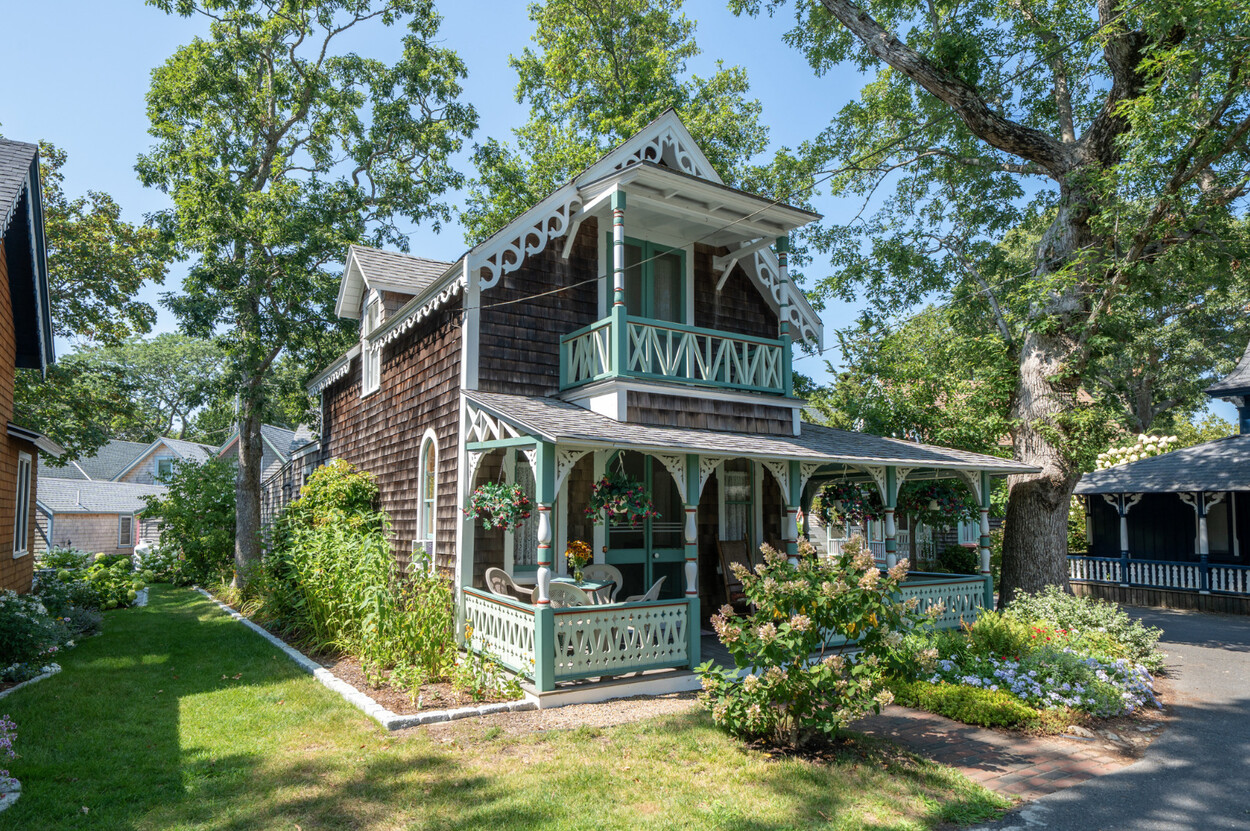 Just steps from the iconic Tabernacle and Trinity Park, this charming cottage is nestled in the heart of the historic Martha's Vineyard Camp Meeting Association—a designated National Historic Landmark District. Surrounded by colorful gardens and picturesque pedestrian walkways, it offers an easy stroll to Oak Bluffs Harbor, beaches, ferries, art galleries, restaurants, and all the vibrant charm of town. This delightful two-bedroom, one full bathroom cottage blends historic character with thoughtful updates, making it an ideal 3-season or extended seasonal retreat. With additional insulation under the house, a buyer could potentially make it suitable for year-round use. An expansive wraparound farmer's porch with classic gingerbread trim invites you to relax and soak in the community’s unique atmosphere. Inside, painted wood-beam ceilings, arched windows, and timeless built-in details enhance the welcoming living spaces. A versatile bump-out area offers flexible use as a guest sleeping nook or office, with direct access to the porch for summer breezes. The dining room provides an inviting space for dinner parties and entertaining, while the kitchen with adjoining laundry and pantry adds convenience and charm. The cottage comfortably sleeps seven, including two bedrooms, a single bed in the bump-out, and a sleep sofa in the living room. The property is partially insulated and features propane forced hot-air heat in the kitchen, bathroom, dining room, and one bedroom, with a new furnace installed in 2019. Additional features include an electric stove, refrigerator, washer, dryer, garbage disposal, 50-gallon propane hot water heater, and approximately 200 sq. ft. of storage. Mature gardens and lawn with irrigation further enhance this special offering. Best of all, the cottage is offered TURNKEY and FULLY FURNISHED, ready for you to enjoy from day one.