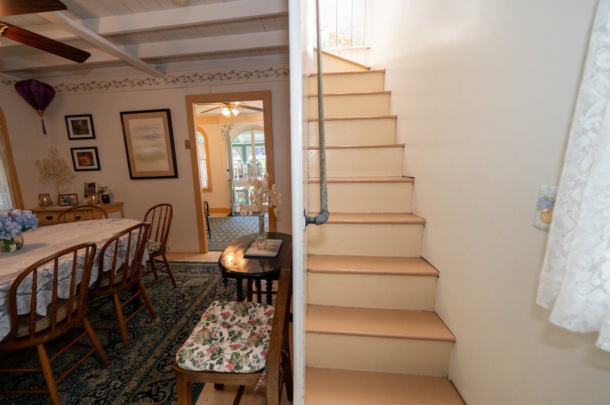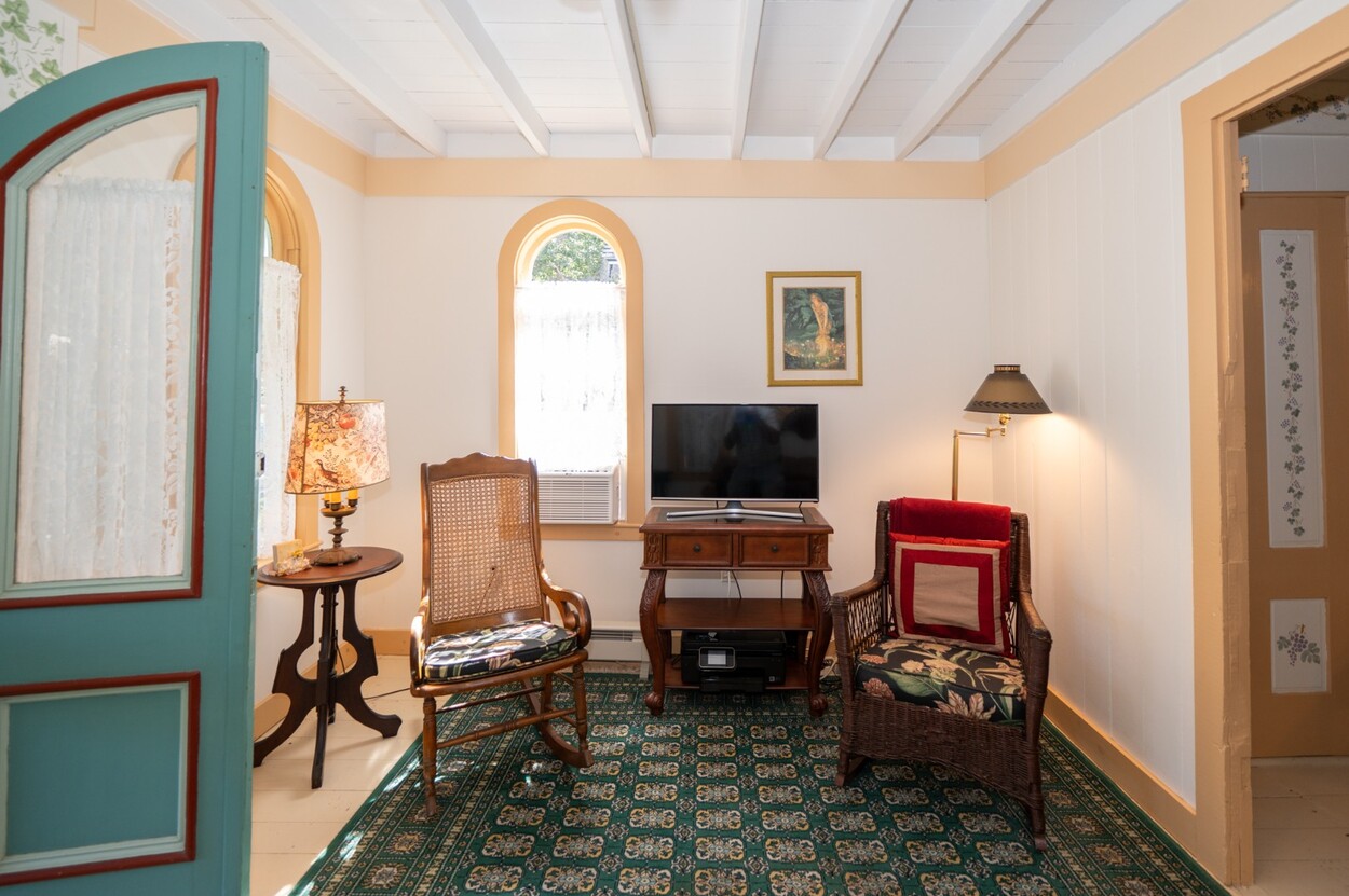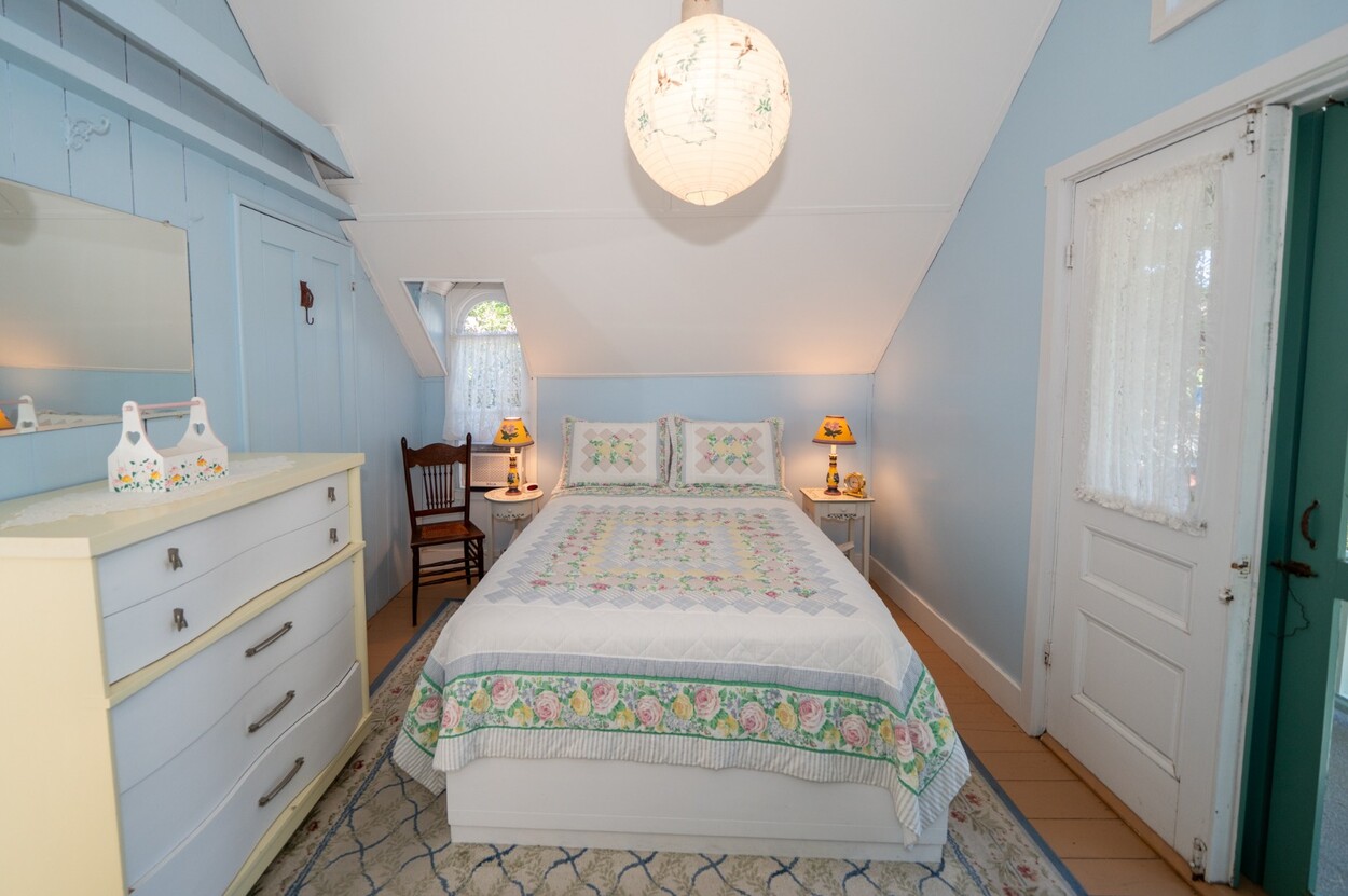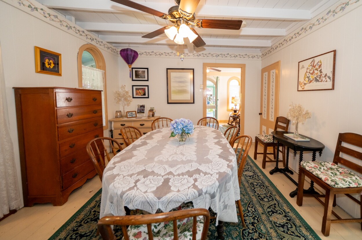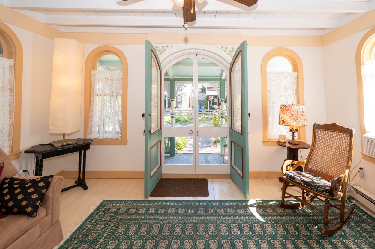 Just steps from the iconic Tabernacle and Trinity Park, this charming cottage is nestled in the heart of the historic Martha's Vineyard Camp Meeting Association—a designated National Historic Landmark District. Surrounded by colorful gardens and picturesque pedestrian walkways, it offers an easy stroll to Oak Bluffs Harbor, beaches, ferries, art galleries, restaurants, and all the vibrant charm of town. This delightful two-bedroom, one full bathroom cottage blends historic character with thoughtful updates, making it an ideal 3-season or extended seasonal retreat. With additional insulation under the house, a buyer could potentially make it suitable for year-round use. An expansive wraparound farmer's porch with classic gingerbread trim invites you to relax and soak in the community’s unique atmosphere. Inside, painted wood-beam ceilings, arched windows, and timeless built-in details enhance the welcoming living spaces. A versatile bump-out area offers flexible use as a guest sleeping nook or office, with direct access to the porch for summer breezes. The dining room provides an inviting space for dinner parties and entertaining, while the kitchen with adjoining laundry and pantry adds convenience and charm. The cottage comfortably sleeps seven, including two bedrooms, a single bed in the bump-out, and a sleep sofa in the living room. The property is partially insulated and features propane forced hot-air heat in the kitchen, bathroom, dining room, and one bedroom, with a new furnace installed in 2019. Additional features include an electric stove, refrigerator, washer, dryer, garbage disposal, 50-gallon propane hot water heater, and approximately 200 sq. ft. of storage. Mature gardens and lawn with irrigation further enhance this special offering. Best of all, the cottage is offered TURNKEY and FULLY FURNISHED, ready for you to enjoy from day one.