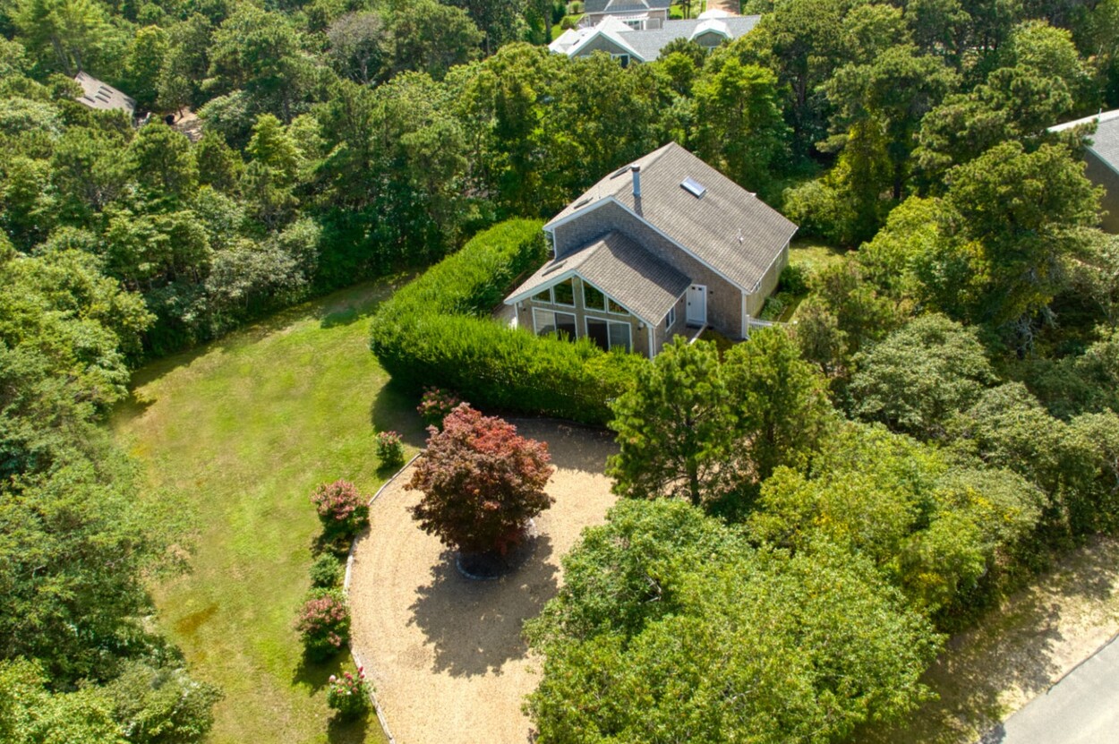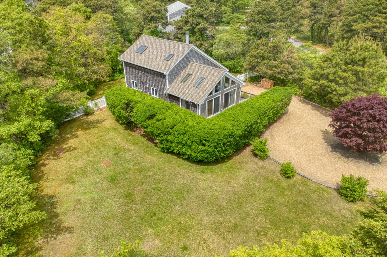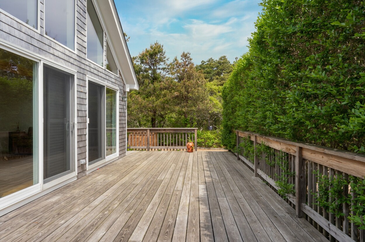 Vacation Getaway in Edgartown Estates - This sunny and welcoming contemporary could be yours! With an open layout, vaulted ceilings, and lots of windows and glass doors, the home feels bright and airy. Step outside to a spacious wrap-around deck—great for relaxing or entertaining. Inside, the living, dining, and kitchen areas flow nicely and are just the right size for gathering. The first floor has three guest bedrooms, while upstairs you’ll find a loft, the primary bedroom suite, and a private balcony. Other features include hardwood floors, air conditioning, a full basement, and an outdoor shower—perfect after a day at the beach. The half-acre lot offers a nice lawn with mature trees and plantings that give privacy from the road and neighbors. The location is excellent, just off the bike path to South Beach or into Edgartown Village. Come take a look!