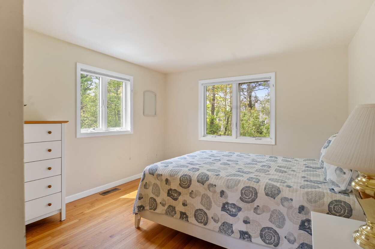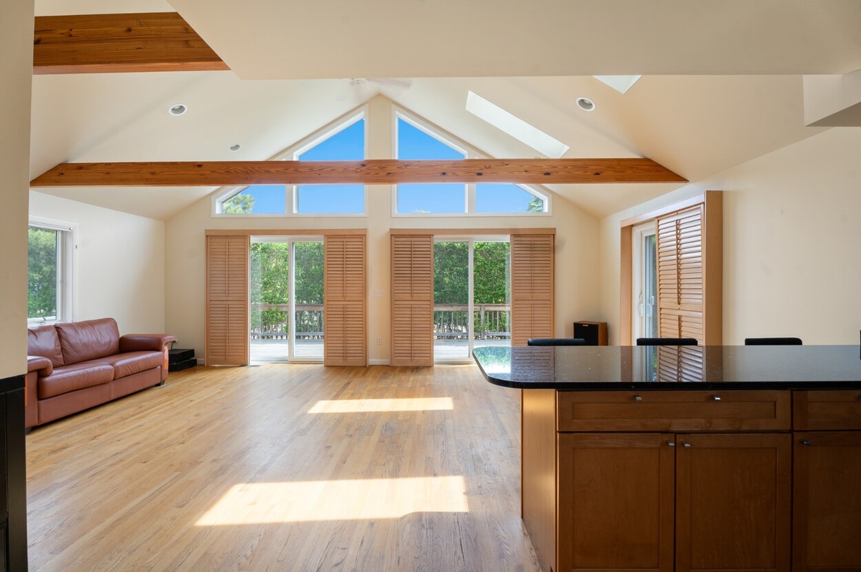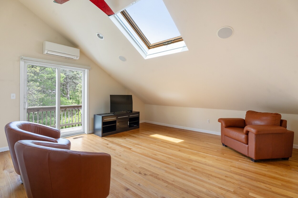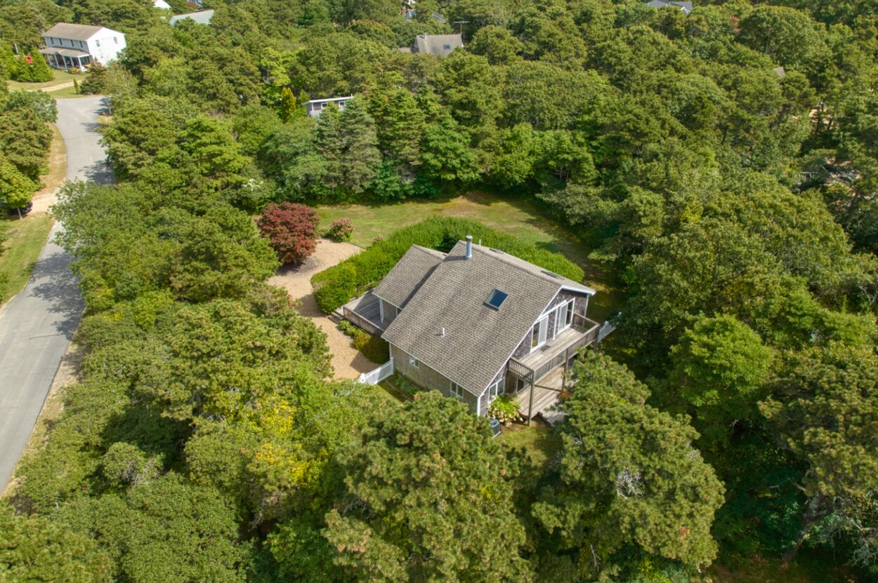Vacation Getaway in Edgartown Estates - This sunny and welcoming contemporary could be yours! With an open layout, vaulted ceilings, and lots of windows and glass doors, the home feels bright and airy. Step outside to a spacious wrap-around deck—great for relaxing or entertaining. Inside, the living, dining, and kitchen areas flow nicely and are just the right size for gathering. The first floor has three guest bedrooms, while upstairs you’ll find a loft, the primary bedroom suite, and a private balcony. Other features include hardwood floors, air conditioning, a full basement, and an outdoor shower—perfect after a day at the beach. The half-acre lot offers a nice lawn with mature trees and plantings that give privacy from the road and neighbors. The location is excellent, just off the bike path to South Beach or into Edgartown Village. Come take a look!