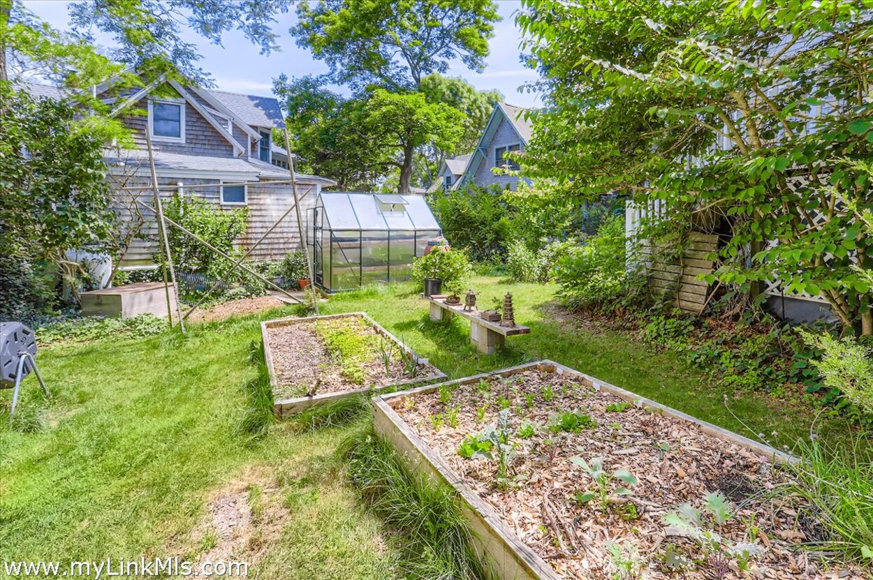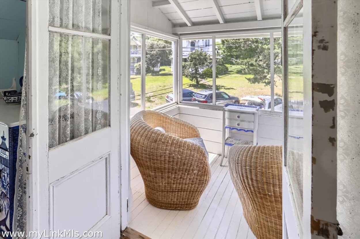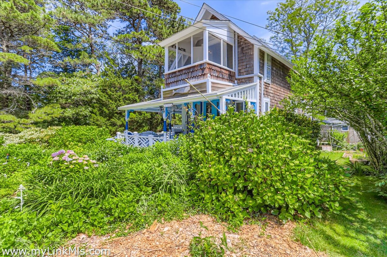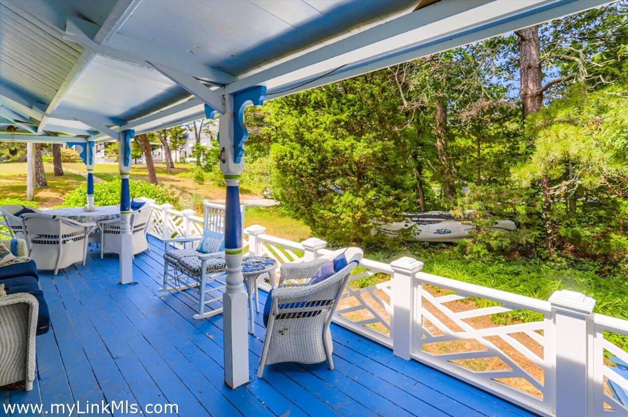 Welcome to this year-round East Chop Victorian Gingerbread home, close to Oak Bluffs Harbor, Jetty Beach, and downtown. The amazing wrap-around porch is perfectly designed for spending lazy summers with friends and family. Many a party has been hosted on this generous porch, made more enticing by an open-plan first floor with a large kitchen, living room, and dining area. The first floor features Victorian charm, featuring a beautiful stained glass window, painted beam ceilings, wainscoting, and built-in shelves. The second floor has 3 bedrooms, each with its own character, including a generous primary bedroom suite with vaulted ceilings, skylights, a walk-in closet, plus a full bathroom and an extra built-in closet. The 2nd bedroom has an open and airy feel with a vaulted ceiling and a screened porch affording views of the neighborhood. The final room has its own private balcony for viewing the backyard garden oasis. The lower level consists of a finished bonus room, laundry, and a full bathroom with tub and storage area. This home and its established gardens have been lovingly maintained, and its location in a delightful neighborhood of highly sought-after East Chop, gives you all that Martha's Vineyard living can offer. Passed Title V Inspection.