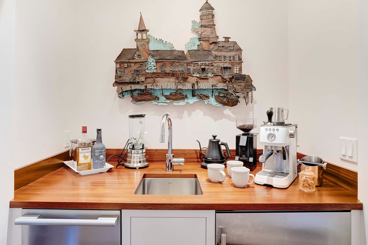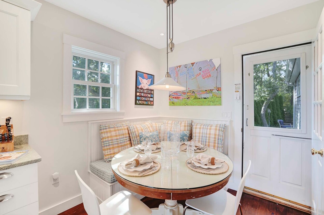 The main floor welcomes you with an inviting living room and a custom bar area complete with wine fridge and dishwasher—perfect for effortless entertaining. The covered porch offers a perfect spot for enjoying al fresco summer dining and relaxation. A sun-filled eat-in kitchen features a Viking gas range, granite countertops with a hint of sea glass green, and a built-in banquette overlooking both the covered front porch and the landscaped backyard. Also on this level, the primary bedroom offers private access to the pool terrace, creating a true indoor–outdoor retreat.