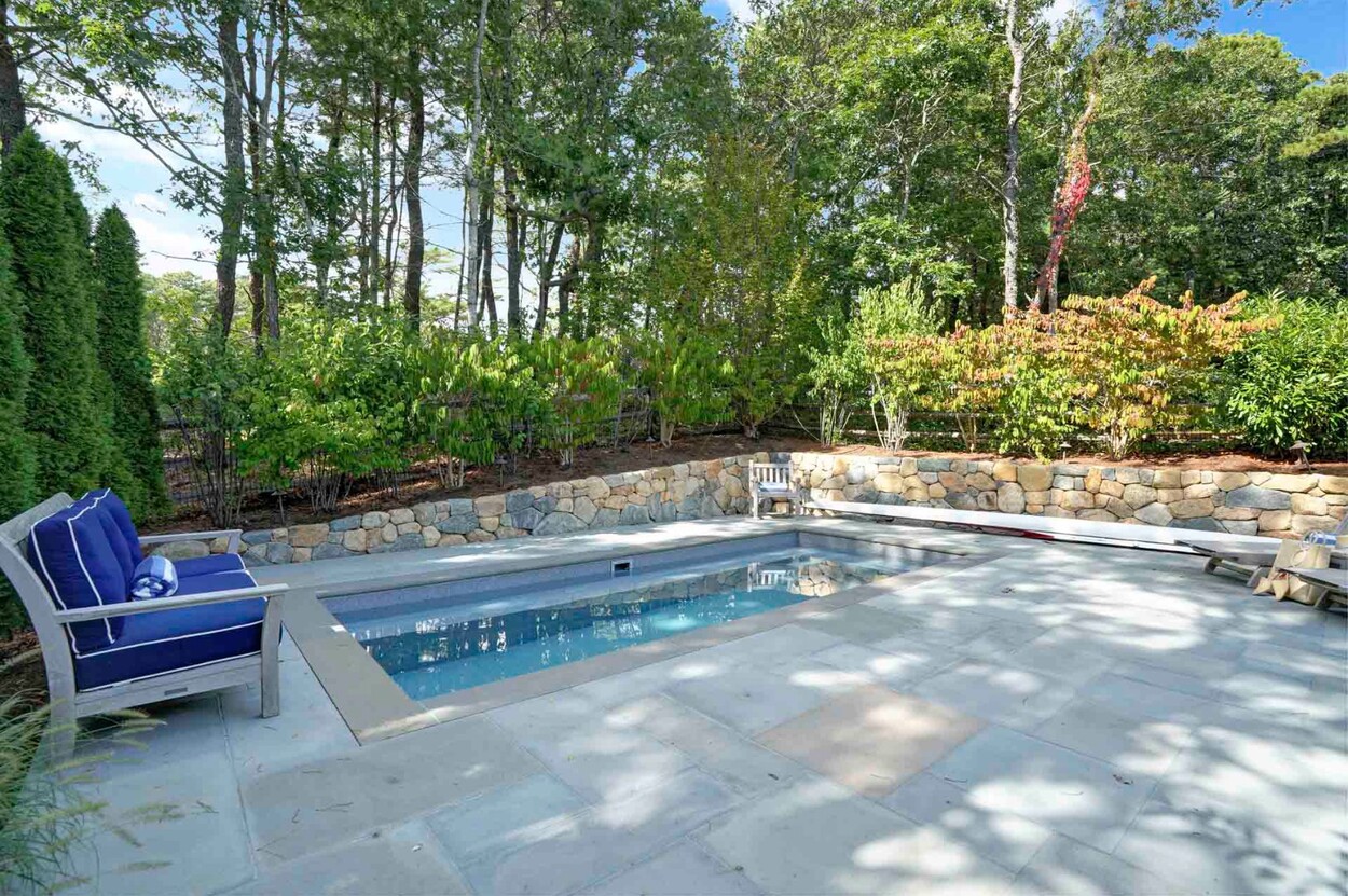 Step outside to your private backyard oasis, where a heated 8x19 saltwater pool is framed by a stone terrace, professionally designed plantings, and evening accent lighting. The setting is equally suited to summer entertaining or quiet relaxation after a day at the beach.