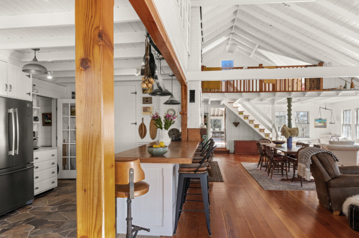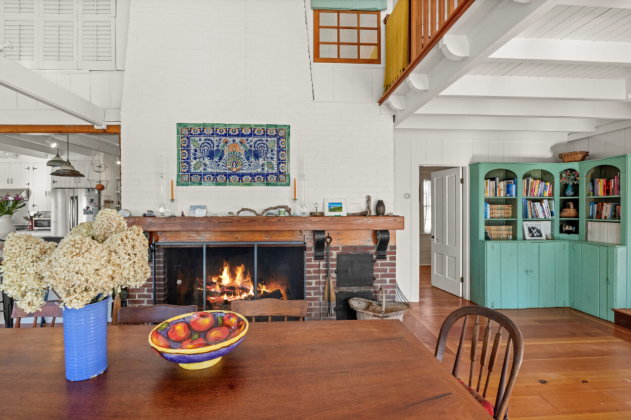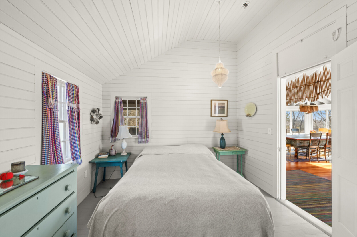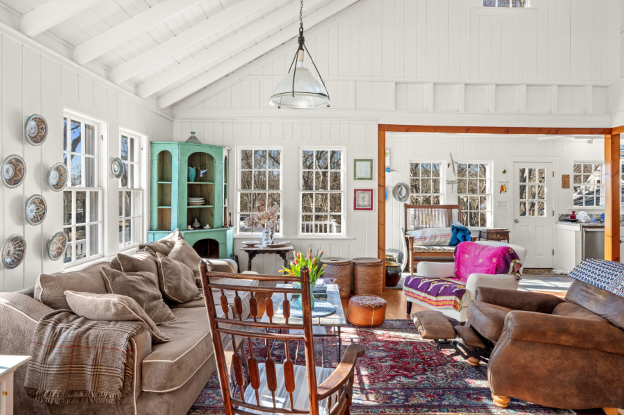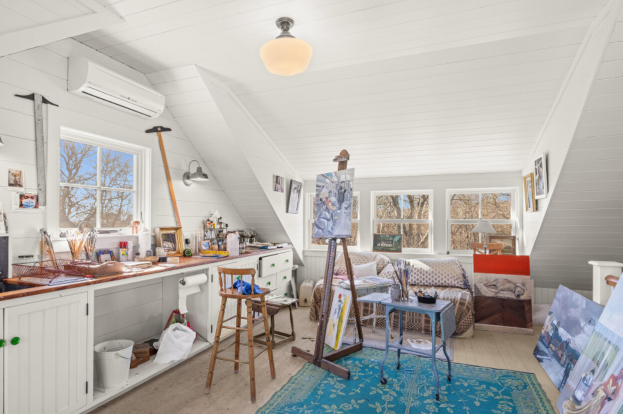 The sunny, light-filled main house showcases an open kitchen and living area anchored by a striking central fireplace—ideal for both everyday year-round living and entertaining. An expanded primary suite wing includes a spacious primary bedroom, full bath, bright office, half bath, and dedicated laundry. A second-story space offers flexibility as an art studio, office, or media room. A classic three-season living room invites relaxed enjoyment of the surrounding landscape, including distant winter waterviews.