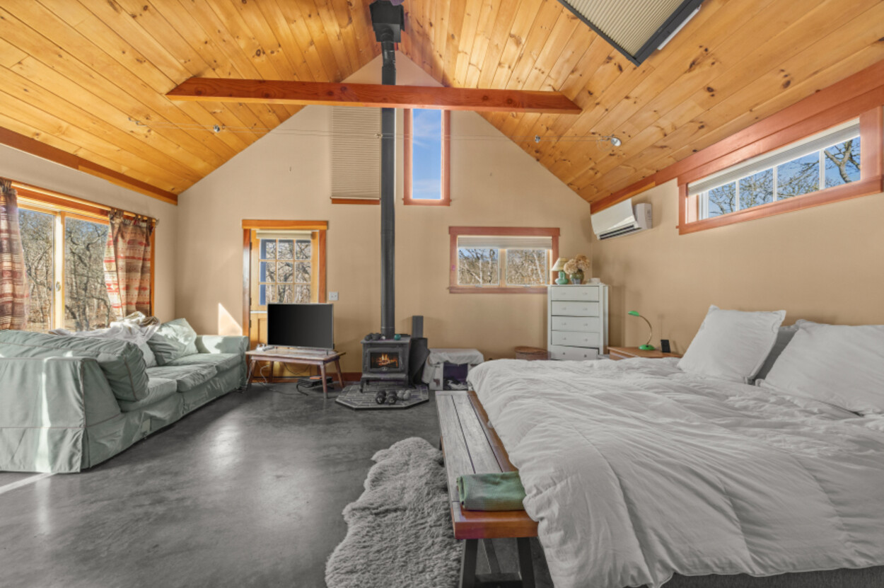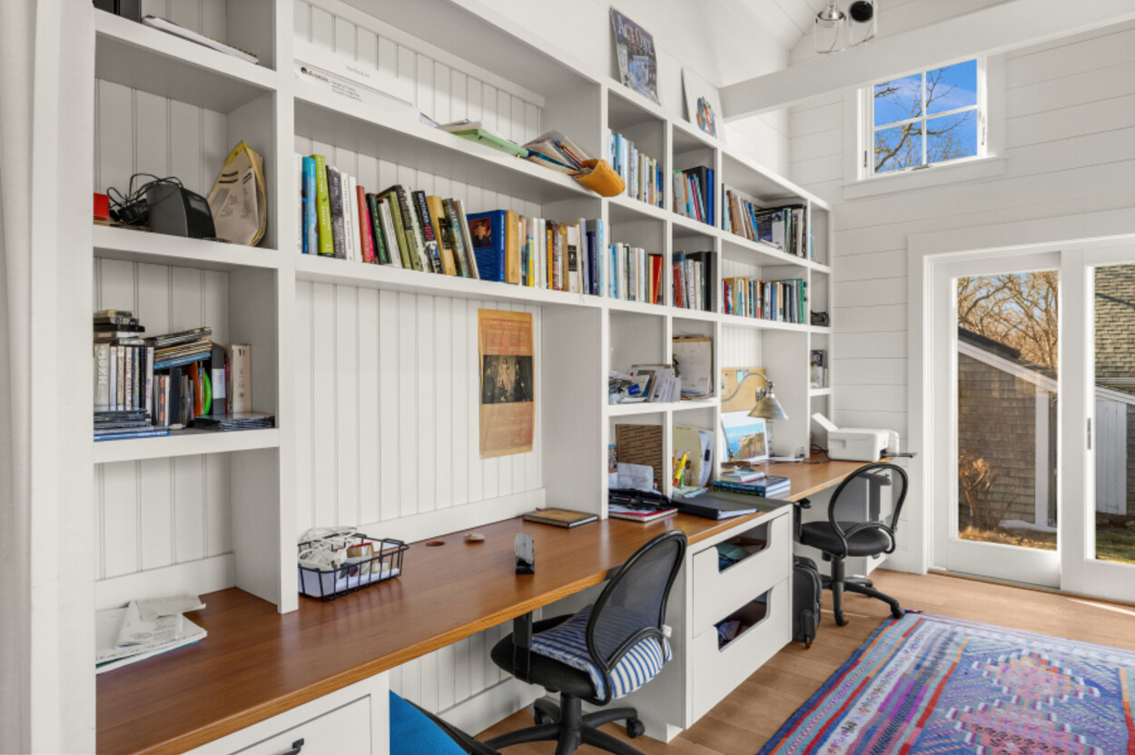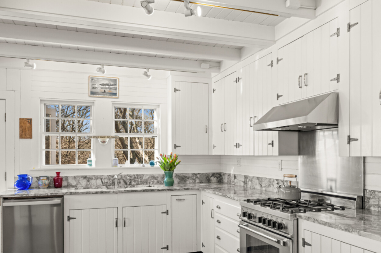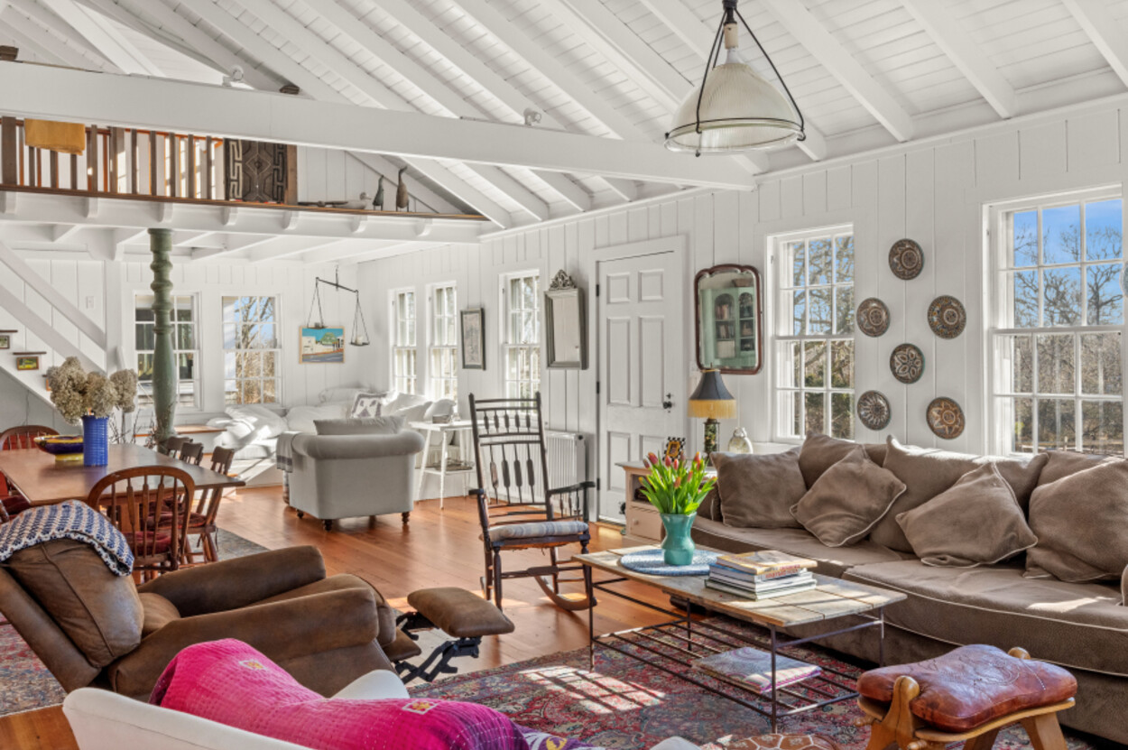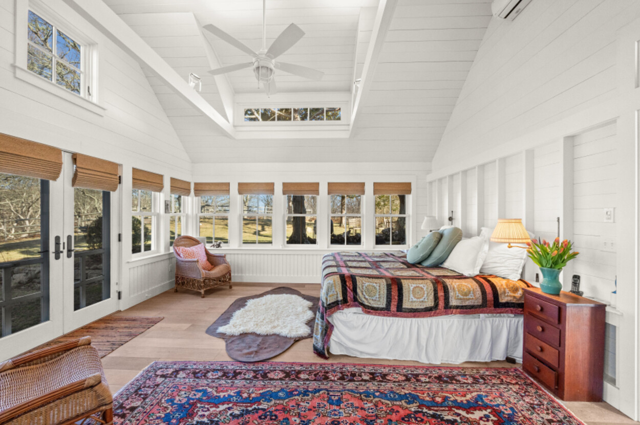 The sunny, light-filled main house showcases an open kitchen and living area anchored by a striking central fireplace—ideal for both everyday year-round living and entertaining. An expanded primary suite wing includes a spacious primary bedroom, full bath, bright office, half bath, and dedicated laundry. A second-story space offers flexibility as an art studio, office, or media room. A classic three-season living room invites relaxed enjoyment of the surrounding landscape, including distant winter waterviews.