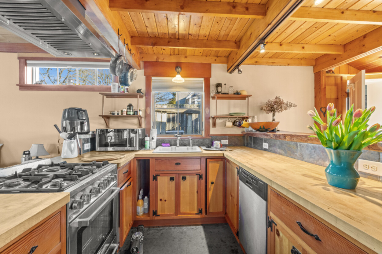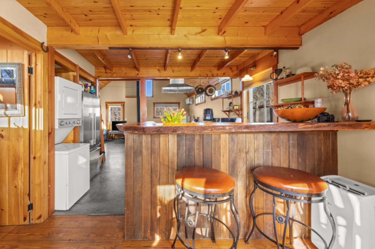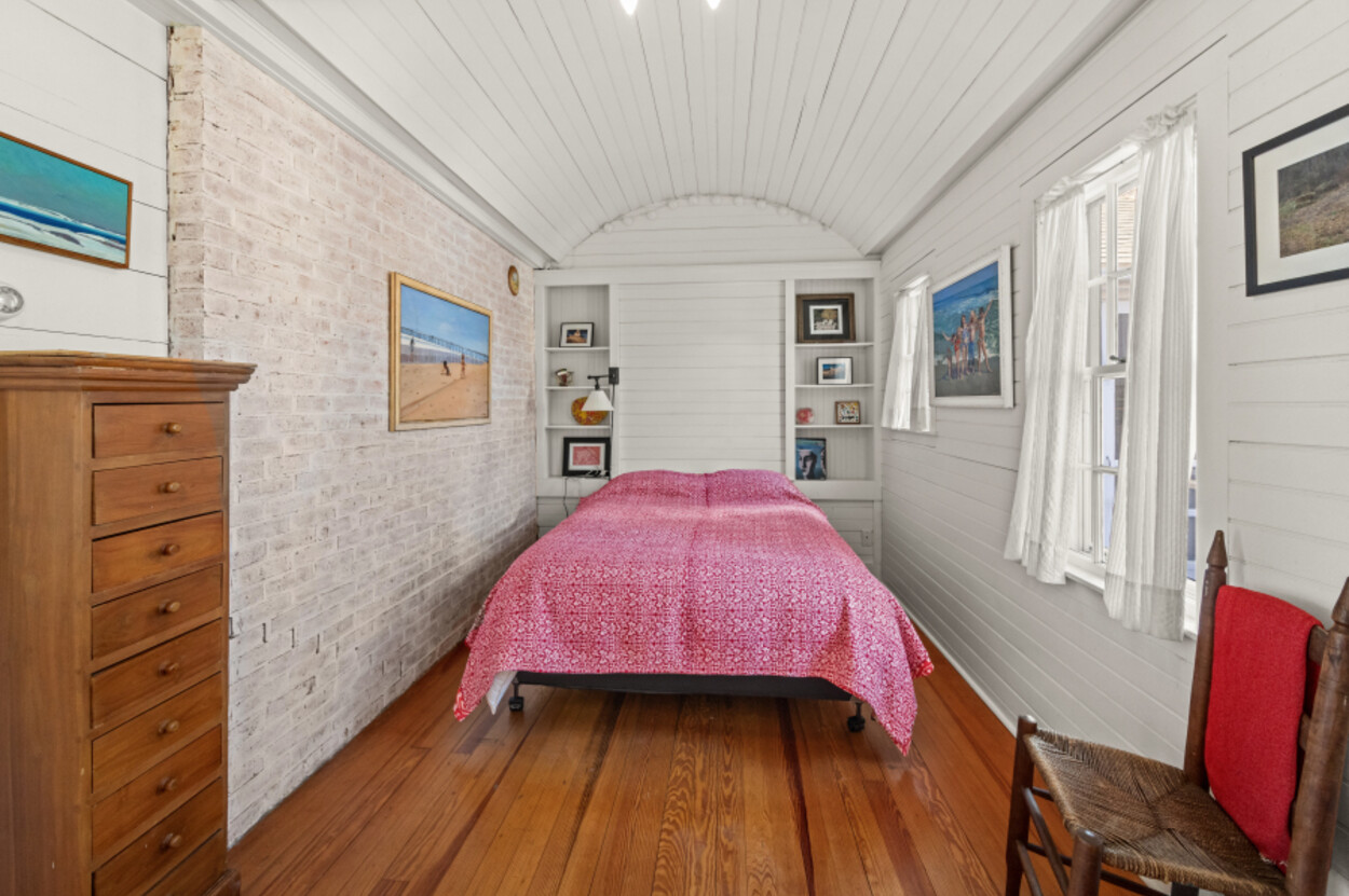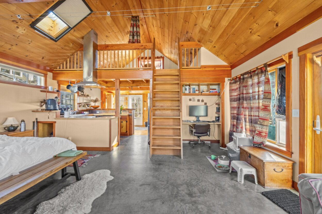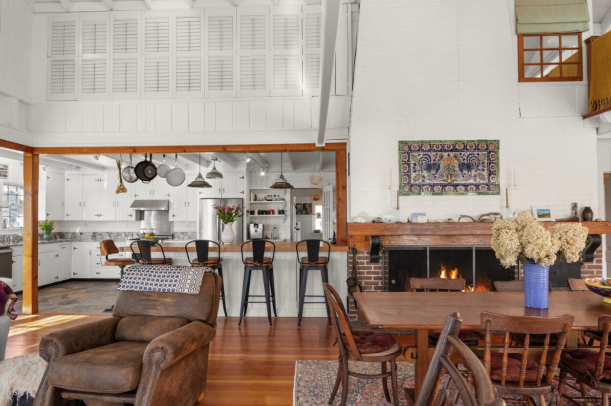 The sunny, light-filled main house showcases an open kitchen and living area anchored by a striking central fireplace—ideal for both everyday year-round living and entertaining. An expanded primary suite wing includes a spacious primary bedroom, full bath, bright office, half bath, and dedicated laundry. A second-story space offers flexibility as an art studio, office, or media room. A classic three-season living room invites relaxed enjoyment of the surrounding landscape, including distant winter waterviews.