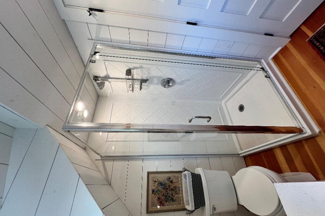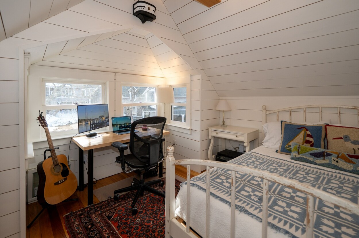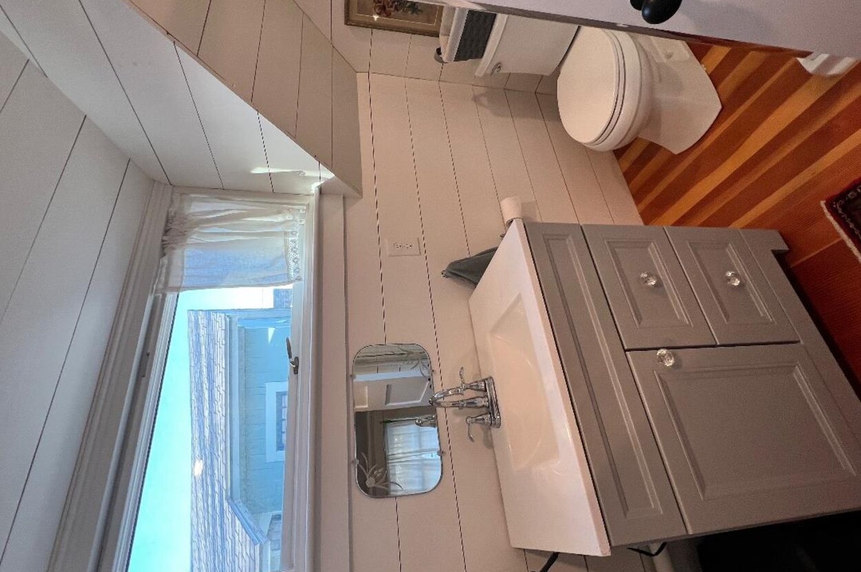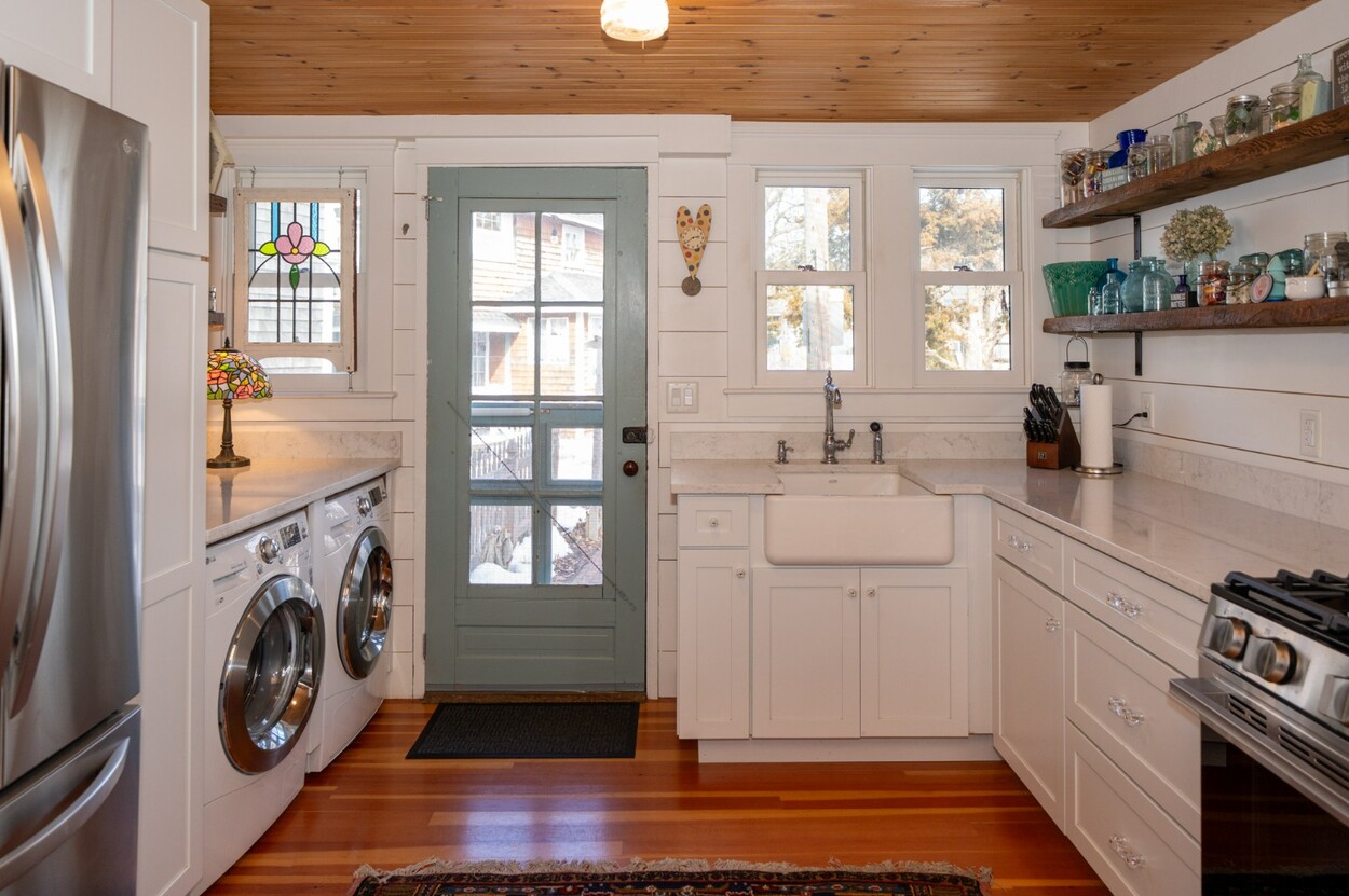 This delightful 3-bedroom, 1-bath home welcomes you with a front porch framed by colorful gardens..an ideal perch for morning coffee or greeting neighbors as they stroll by. Inside, Victorian character blends seamlessly with modern updates, highlighted by stylish shiplap walls, a warm knotty pine ceiling, original impeccable wood flooring, and an abundance of natural light throughout. The renovated kitchen features quartz countertops, a farmhouse sink, stylish accent lighting, and newer energy-efficient appliances ..designed to be as functional as it is beautiful. Replaced wood Marvin windows enhance both efficiency and architectural appeal, while a newer hot water tank and a roof replaced approximately within the last 12 years provide added peace of mind. Energy-efficient heat pumps deliver both air conditioning and heat for comfortable year-round living.