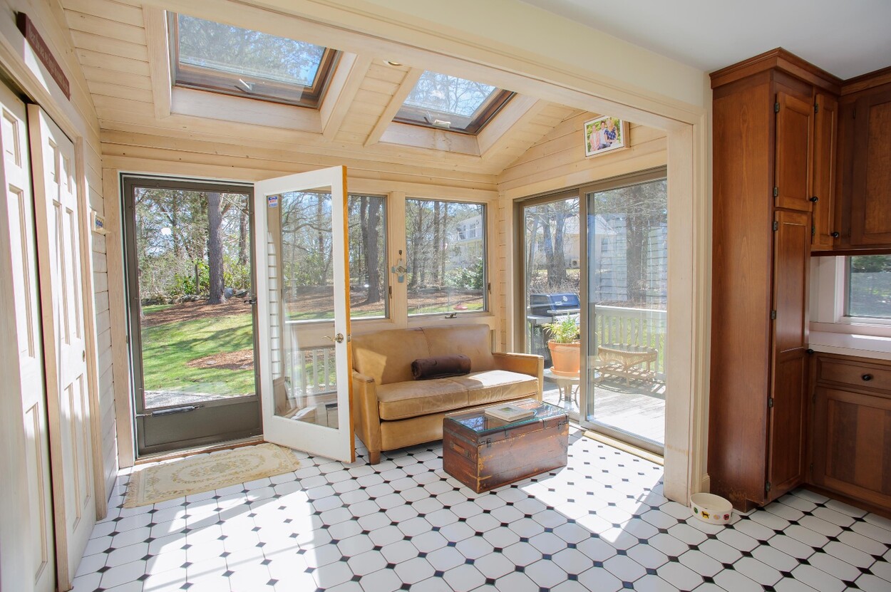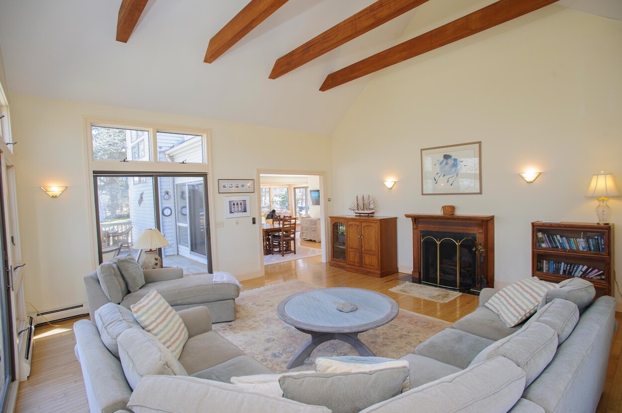 Set on a gentle rise overlooking the Lagoon, the home is filled with natural light and offers beautiful water views. A bright sitting room welcomes you and flows easily into the kitchen and dining area. The dining room opens to a large deck, perfect for outdoor dining or simply enjoying the view. The cathedral living room is filled with glass and natural light, with a fireplace and sliders to the deck that create an easy indoor outdoor feel.