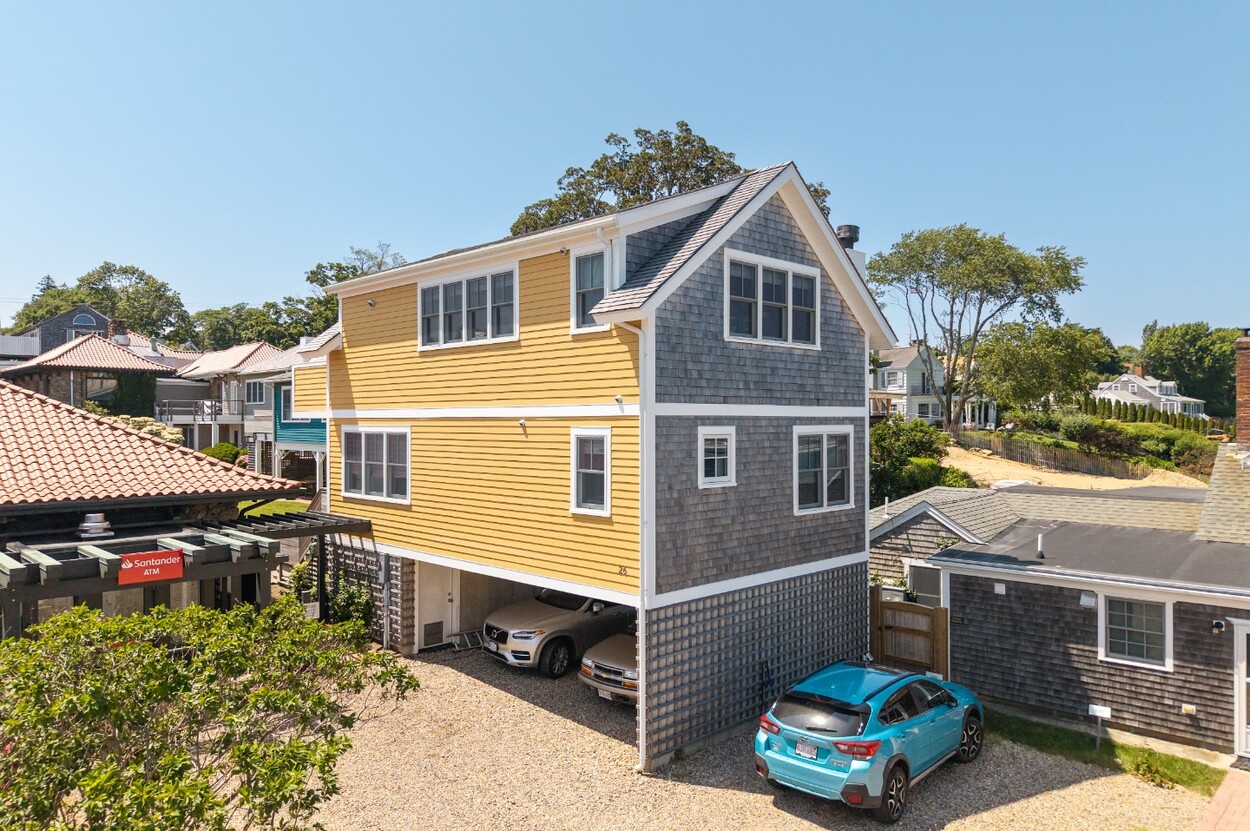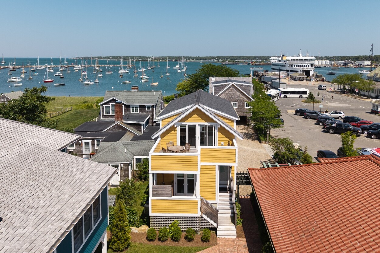 Waterview Condo in the Heart of Downtown Vineyard Haven. Experience the best of in-town living with this newly built, thoughtfully designed 2-bedroom condo offering beautiful harbor views and luxurious modern finishes. The first level welcomes you with a primary suite featuring a full bath with a tub/shower combination and direct access to a private deck complete with an outdoor shower—perfect after a day at the beach. Also on this level is a comfortable guest bedroom with peaks of the harbor, a stylish full tile bath with a glass-enclosed shower, a cozy living area, and washer/dryer for convenience. Upstairs, cathedral ceilings and a gas fireplace create an inviting open-concept living space. The gourmet kitchen is outfitted with sleek Bosch appliances, a large center island ideal for entertaining, and an adjoining dining area. Enjoy panoramic water views of the harbor, passing ferry boats, and Vineyard Sound from the entire second floor, or step out onto your private deck—perfect for alfresco dining or morning coffee. Just steps from your door, a private path leads to the association’s sandy harbor beach, where you can store your kayak or launch your boat. This condo also includes a dedicated parking space and an enclosed storage area under the house—ideal for bikes, beach gear, or seasonal items. With easy access to downtown shops, restaurants, ferry terminal, and local beaches, this condo offers the ultimate combination of luxury, convenience, and island charm. A rare opportunity for carefree coastal living on Martha’s Vineyard.