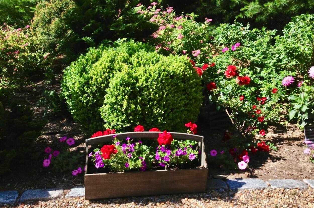 Upgrades to the original plans include forced hot air with propane heat and air conditioning, a gas stove, an alarm system, and Andersen sliding doors. Outside, the owners added 24 White Pine trees to enhance privacy, and the property features Belgian Block pavers, a flagstone walkway, and a large planting bed with a bird bath.