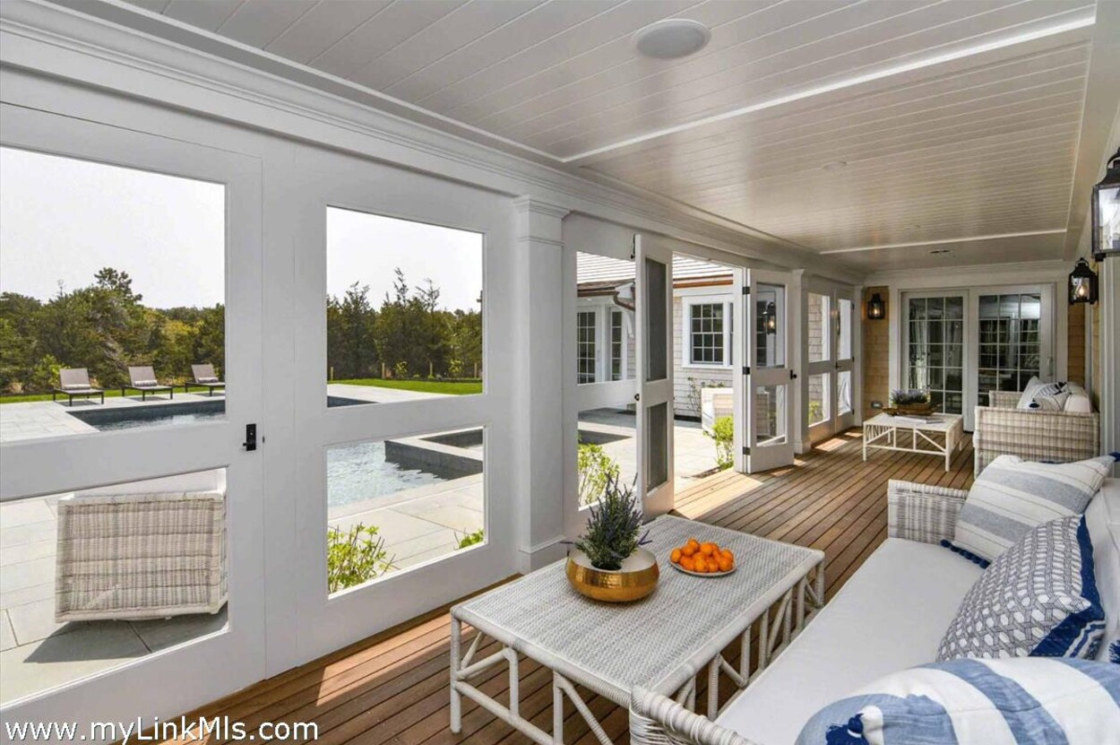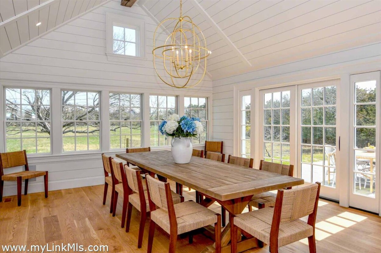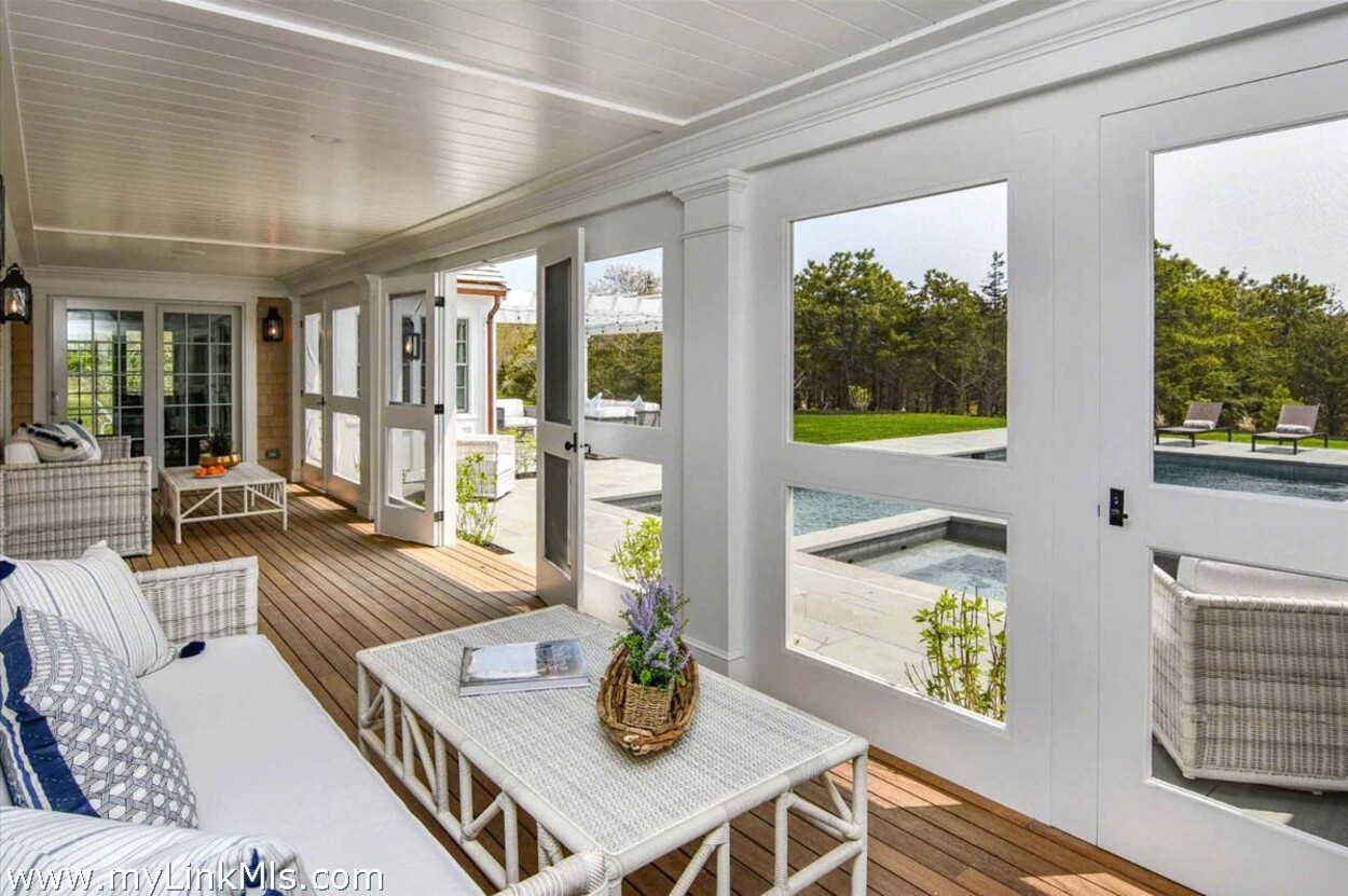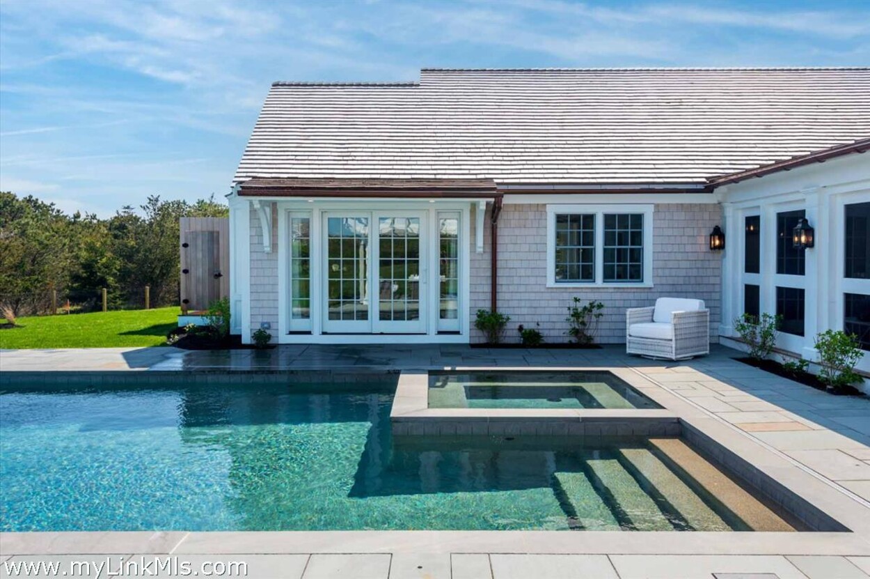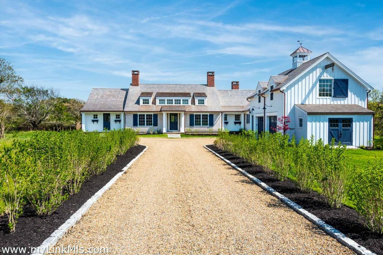 LUXE COASTAL RETREAT IN KATAMA. Sited at the end of a long private drive, amid a bucolic 1.5-acre meadow setting and lush perennial gardens, this elegant coastal retreat, designed by noted architect Patrick Ahearn, offers the epitome of luxurious living in Katama. The home’s timeless and charming character is highlighted by thoughtful, top-notch architectural details and styling throughout. There are vaulted ceilings in every room of the house with custom millwork and paneling, antique rough hewn beams adding charm and character. In addition, the well-designed floor plan features multiple living areas that open out to a central courtyard with bluestone terrace, an outdoor wood-burning fireplace and an 18'x36' gunite swimming pool with built-in whirlpool spa. The property is ideally located near South Beach, with the sounds of the ocean nearby. Furnishings, artwork and accessories are available separately for a turnkey and move-in ready purchase opportunity.