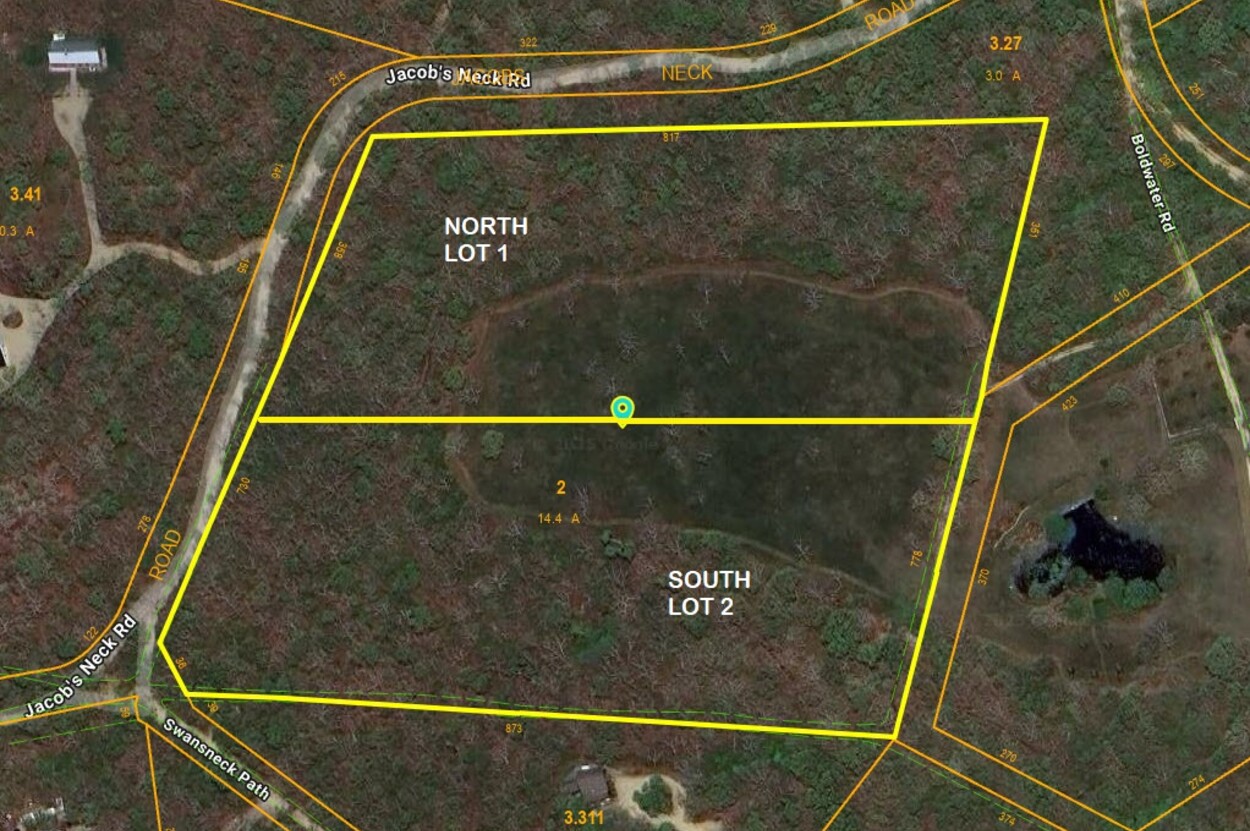 Build your dream home on the special 7.2 acre North lot 1 private wooded property with 1/2 ownership in the beautiful 4.5 acre meadow in the grand Boldwater Association(BWA) on the glorious Edgartown Great Pond with approx. 3,000 ft of private barrier beach. BWA is 40 homesites on 450 acres with 150 acres of conservation abutting another 1,500 acres of conservation and a few large estates - all convenient to town and airport. BWA amenities also include 2 tennis/pickleball courts and a boat launch which are both nearby. EDGARTOWN PLANNING BOARD APPROVED ON 10/22/25 A SUBDIVISION OF THE 14+ ACRE PROPERTY INTO TWO 7+ ACRE LOTS - North lot 1 and South lot 2. The lots can be purchased together for $4,950,000 or separately for $2,490,000. Both lots enjoy full BWA membership rights and privileges. The 2 lots will split ownership of the 4.5 acre meadow if sold separately. (see approved subdivision plan in DOCUMENTS)