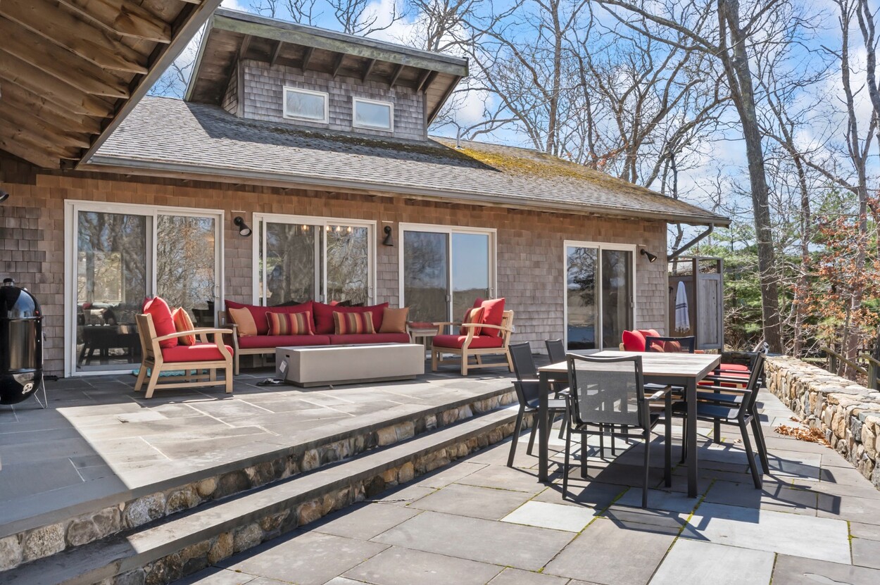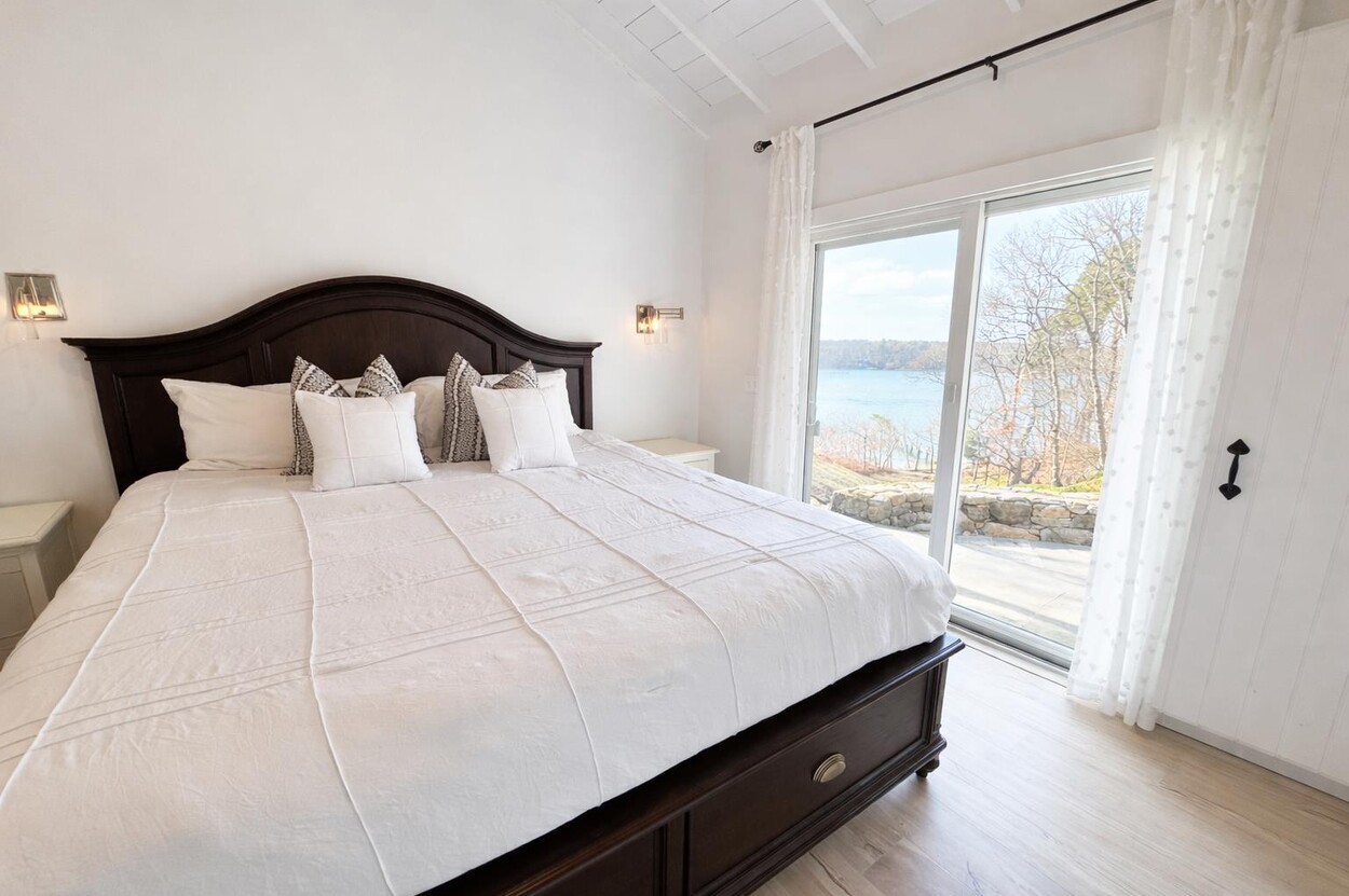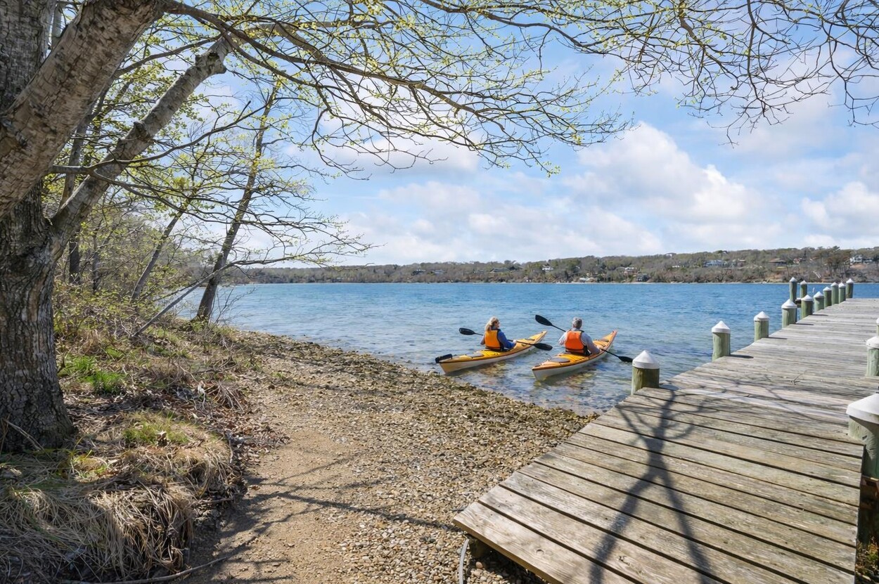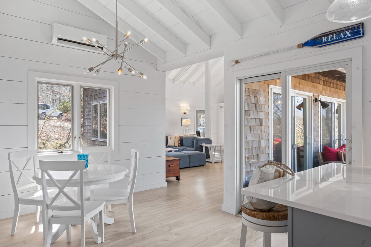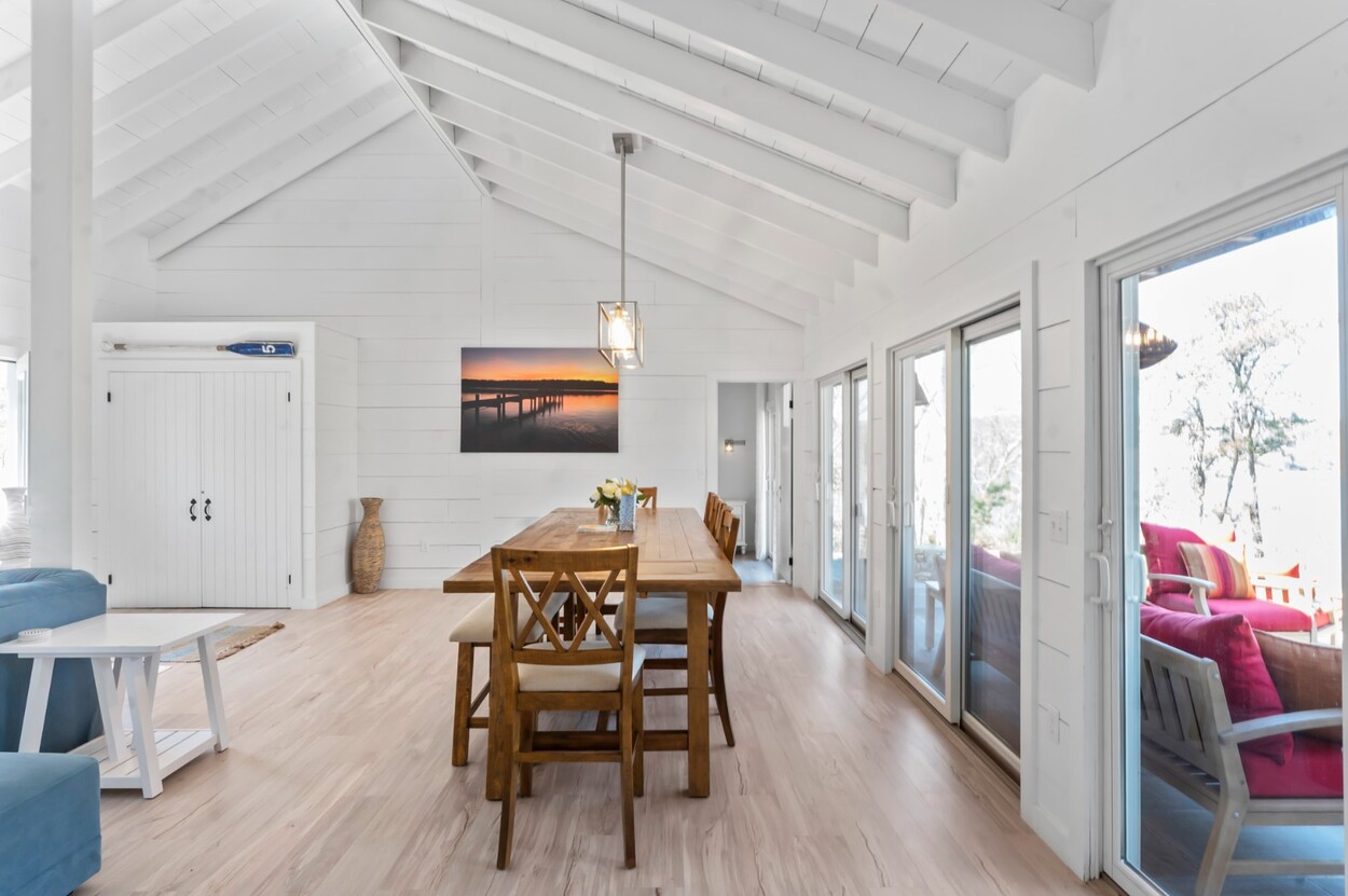 Your Vineyard summer begins the moment you arrive. Fully furnished, renovated waterfront retreat offers 175' of private shorefront on Lagoon Pond — one of Martha's Vineyard's most coveted settings. Taken to the studs in 2022 and reimagined by architect Ramsay Gourd, this bright coastal escape features soaring vaulted ceilings, white shiplap, and painted beams. Glass sliders open to bluestone terraces where water views take center stage. The open kitchen offers custom cabinetry, stainless appliances, and a table for casual dining - perfect for summer entertaining. The primary suite includes a tiled ensuite, loft, and separate entrance to patio and beach path. Two additional bedrooms with cathedral ceilings share a glass-shower bath. Outside: mahogany shower, rolling lawns, and hydrangea beds complete the quintessential Vineyard setting. Turnkey and move-in ready — even the kayaks are included. Strong rental history with 2026 leases in place. 4-bedroom septic. Lot is elevated out of flood plain with sweeping views west toward the stunning sunsets over Lagoon Pond.