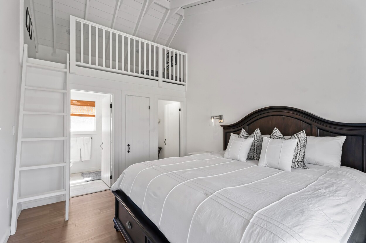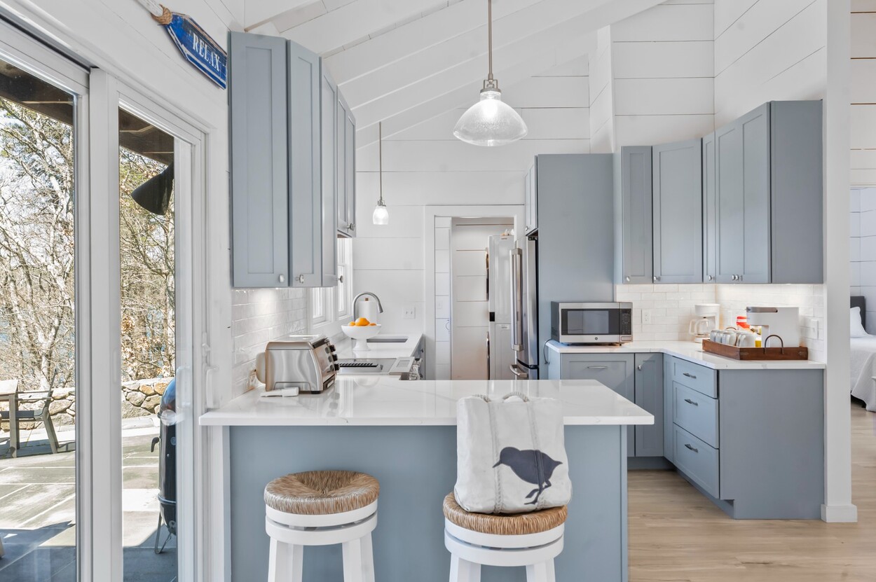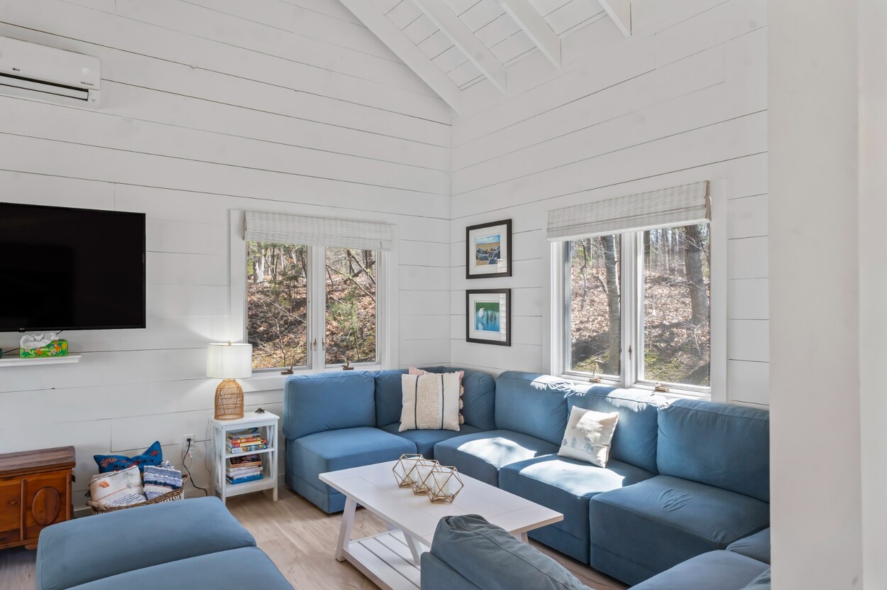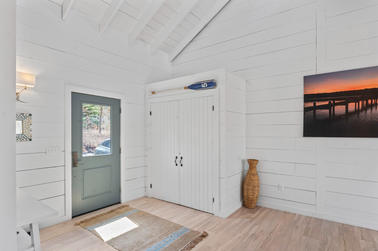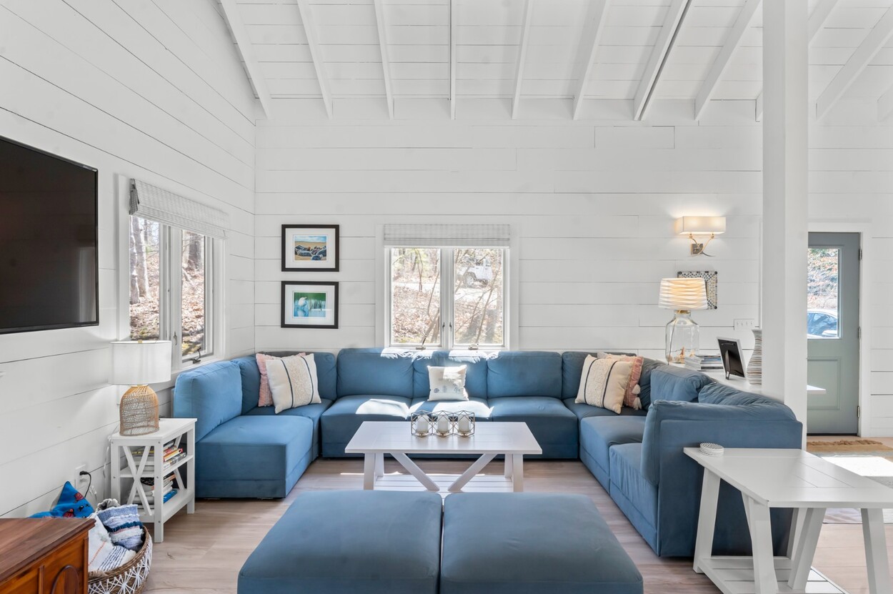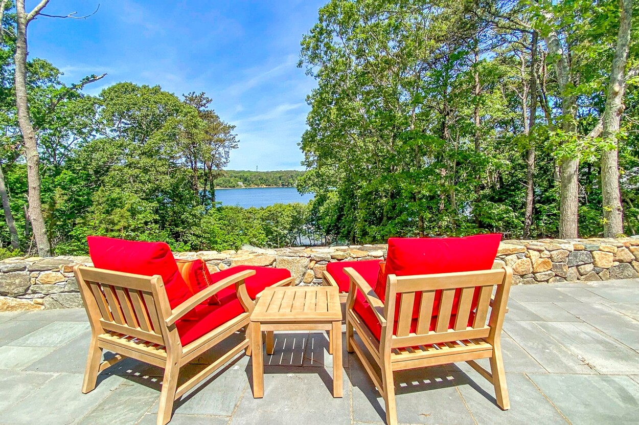Your Vineyard summer begins the moment you arrive. Fully furnished, renovated waterfront retreat offers 175' of private shorefront on Lagoon Pond — one of Martha's Vineyard's most coveted settings. Taken to the studs in 2022 and reimagined by architect Ramsay Gourd, this bright coastal escape features soaring vaulted ceilings, white shiplap, and painted beams. Glass sliders open to bluestone terraces where water views take center stage. The open kitchen offers custom cabinetry, stainless appliances, and a table for casual dining - perfect for summer entertaining. The primary suite includes a tiled ensuite, loft, and separate entrance to patio and beach path. Two additional bedrooms with cathedral ceilings share a glass-shower bath. Outside: mahogany shower, rolling lawns, and hydrangea beds complete the quintessential Vineyard setting. Turnkey and move-in ready — even the kayaks are included. Strong rental history with 2026 leases in place. 4-bedroom septic. Lot is elevated out of flood plain with sweeping views west toward the stunning sunsets over Lagoon Pond.