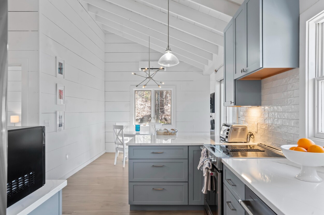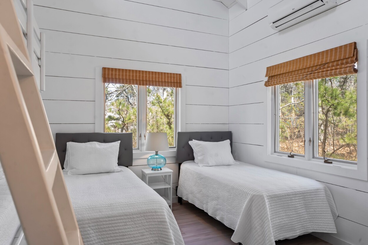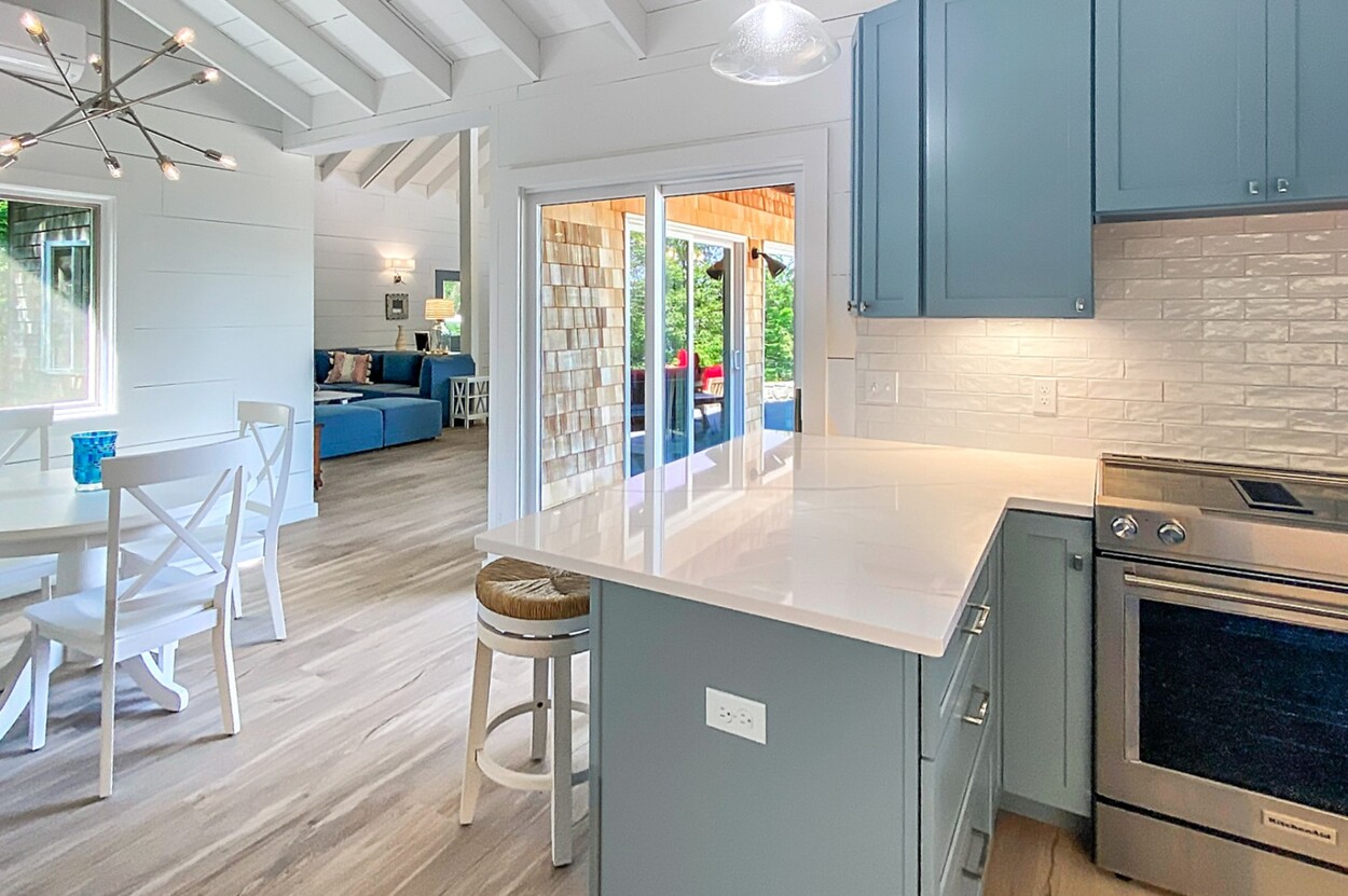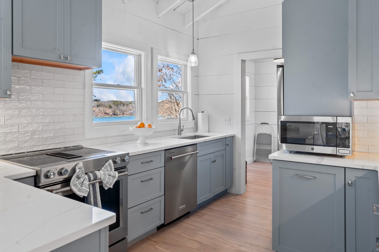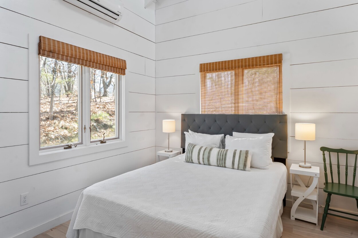 Your Vineyard summer begins the moment you arrive. Fully furnished, renovated waterfront retreat offers 175' of private shorefront on Lagoon Pond — one of Martha's Vineyard's most coveted settings. Taken to the studs in 2022 and reimagined by architect Ramsay Gourd, this bright coastal escape features soaring vaulted ceilings, white shiplap, and painted beams. Glass sliders open to bluestone terraces where water views take center stage. The open kitchen offers custom cabinetry, stainless appliances, and a table for casual dining - perfect for summer entertaining. The primary suite includes a tiled ensuite, loft, and separate entrance to patio and beach path. Two additional bedrooms with cathedral ceilings share a glass-shower bath. Outside: mahogany shower, rolling lawns, and hydrangea beds complete the quintessential Vineyard setting. Turnkey and move-in ready — even the kayaks are included. Strong rental history with 2026 leases in place. 4-bedroom septic. Lot is elevated out of flood plain with sweeping views west toward the stunning sunsets over Lagoon Pond.