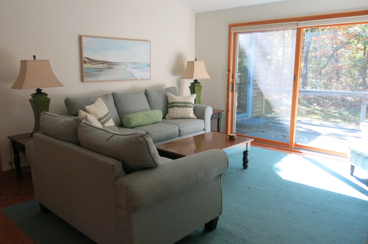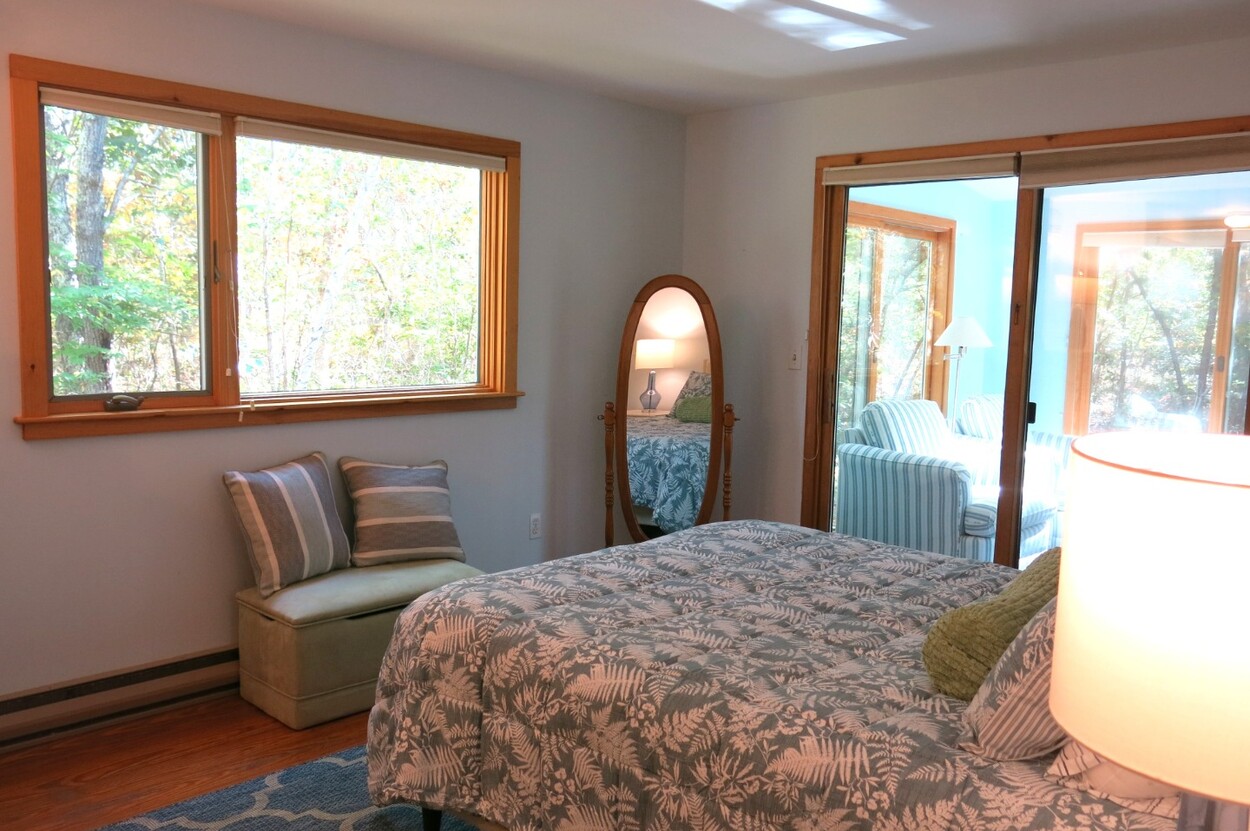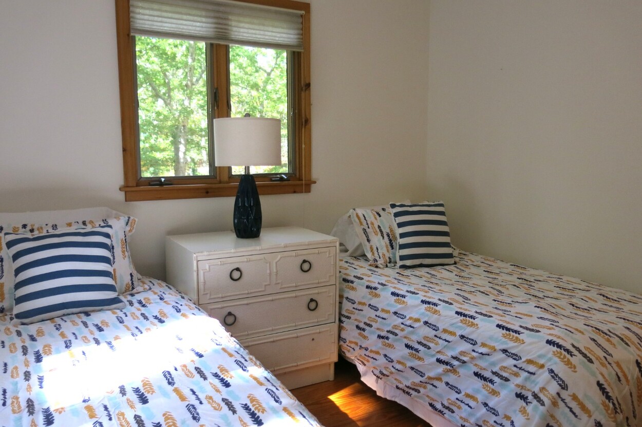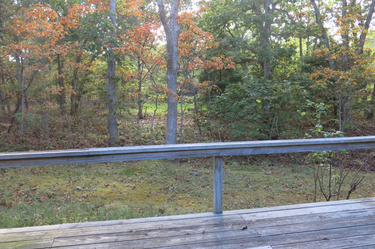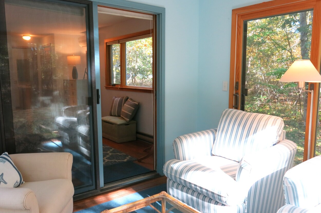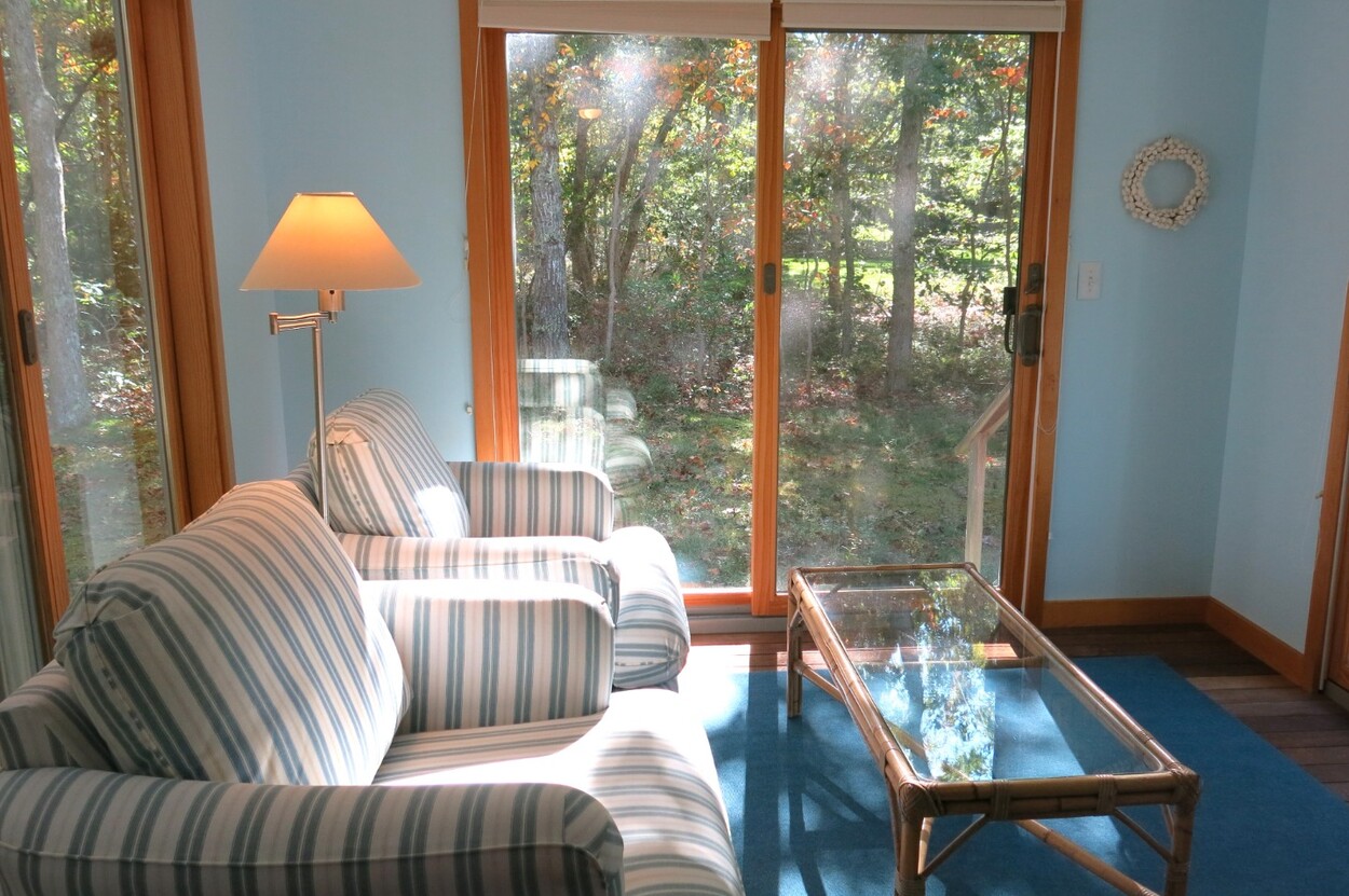 One level living! This ranch-style home has a great layout and some sweet, unexpected features. The living spaces are opened up to each other allowing the wall of sliders in the living room to flood the rooms with light - and these sliders give access out to the deck with serene views of the woodlands beyond; where Stoney Hill Path bounds the entire south side of the property. The primary suite is at one end of the home and has been expanded by the addition of a 3-season sunroom that also offers access out to the deck. At the far end of the house are the two guest bedrooms and their shared bath. The living room and all of the bedrooms have hardwood floors, the home is offered nicely furnished - and the full basement offers opportunities for additional living spaces. Great location just a hop, skip and jump to North Tisbury amenities or down-town Vineyard Haven.