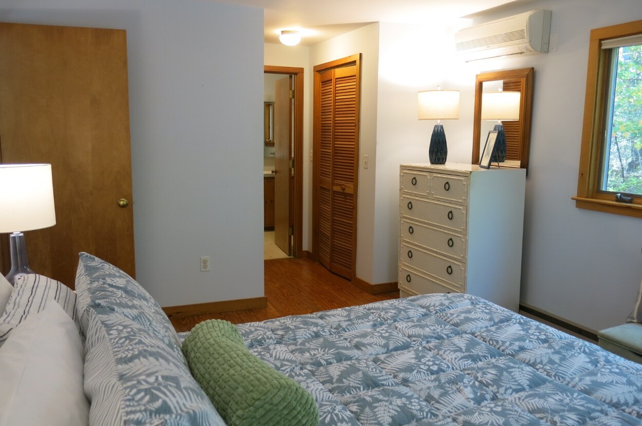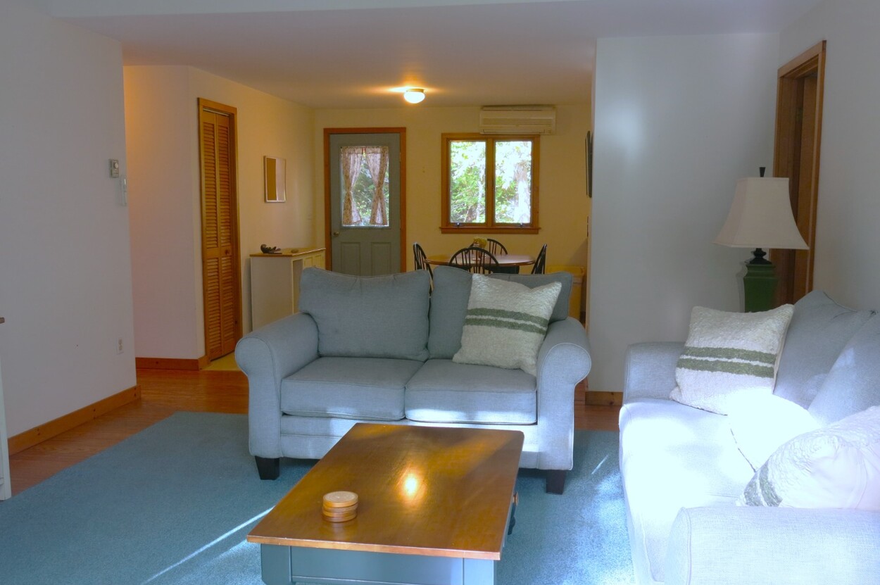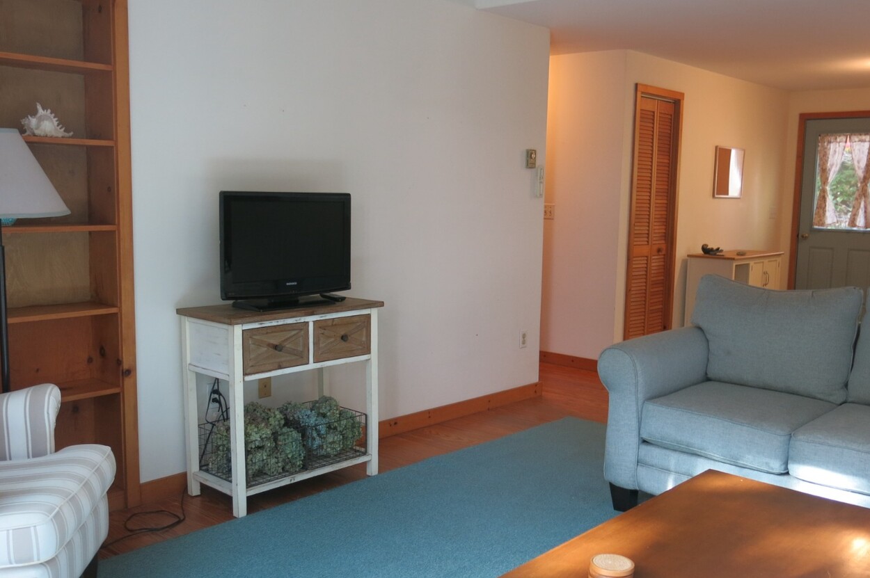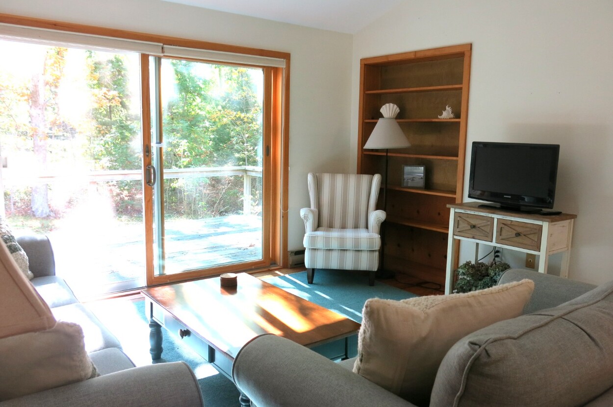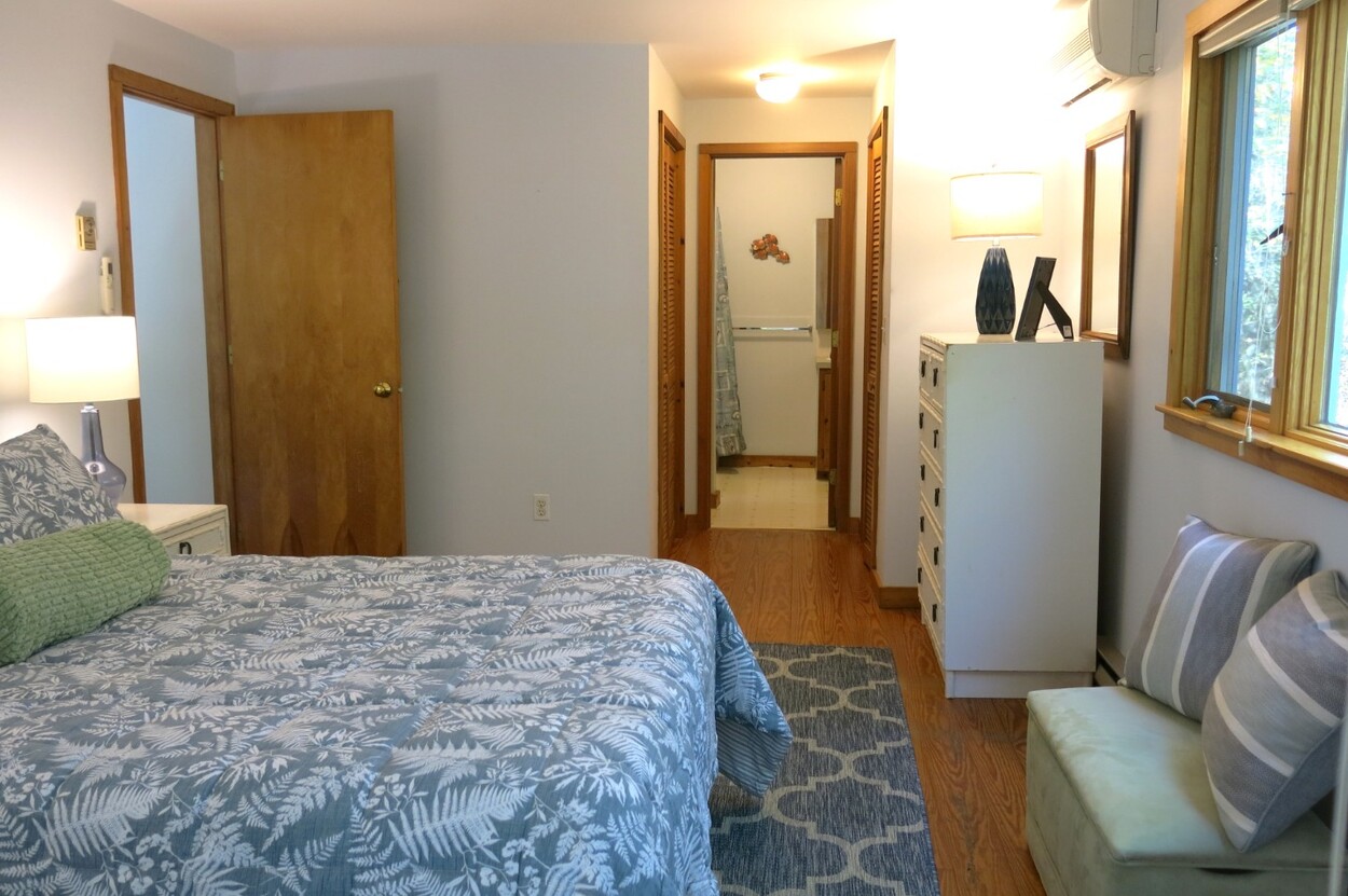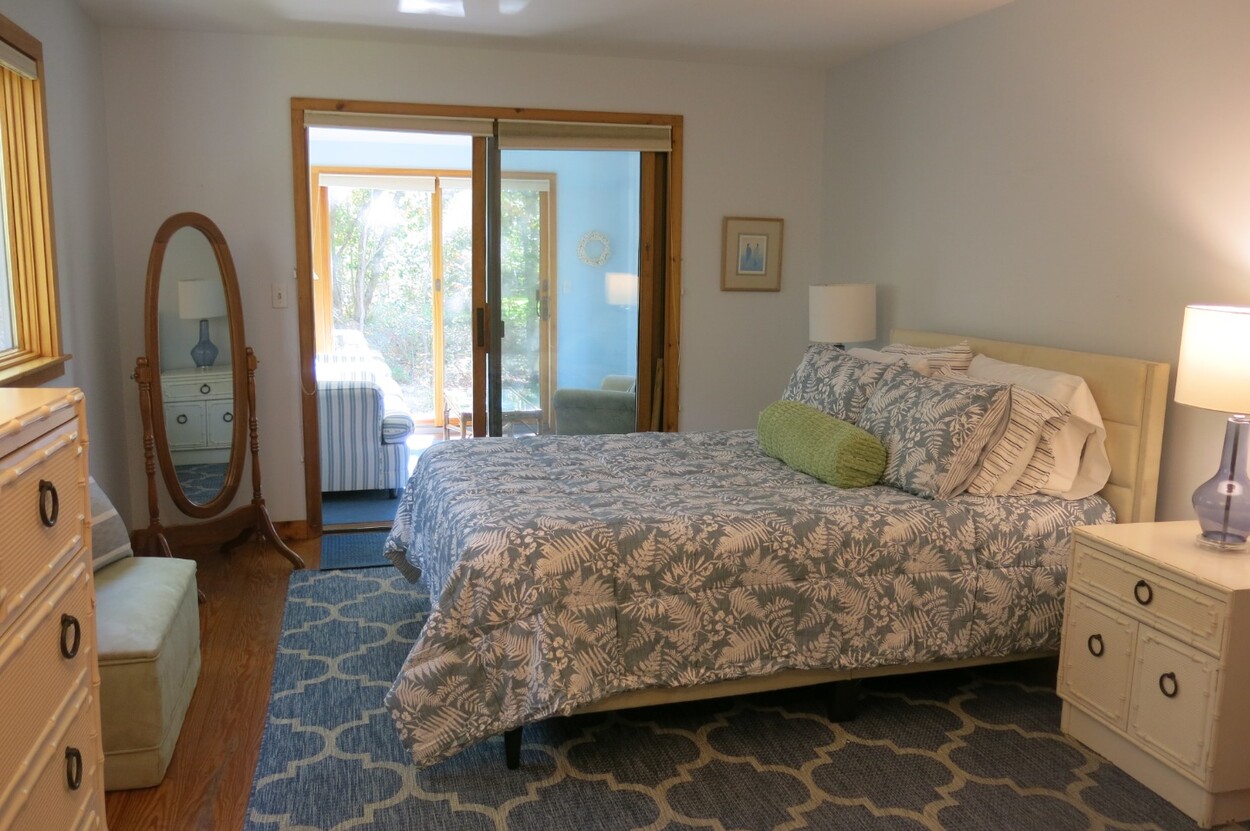 One level living! This ranch-style home has a great layout and some sweet, unexpected features. The living spaces are opened up to each other allowing the wall of sliders in the living room to flood the rooms with light - and these sliders give access out to the deck with serene views of the woodlands beyond; where Stoney Hill Path bounds the entire south side of the property. The primary suite is at one end of the home and has been expanded by the addition of a 3-season sunroom that also offers access out to the deck. At the far end of the house are the two guest bedrooms and their shared bath. The living room and all of the bedrooms have hardwood floors, the home is offered nicely furnished - and the full basement offers opportunities for additional living spaces. Great location just a hop, skip and jump to North Tisbury amenities or down-town Vineyard Haven.