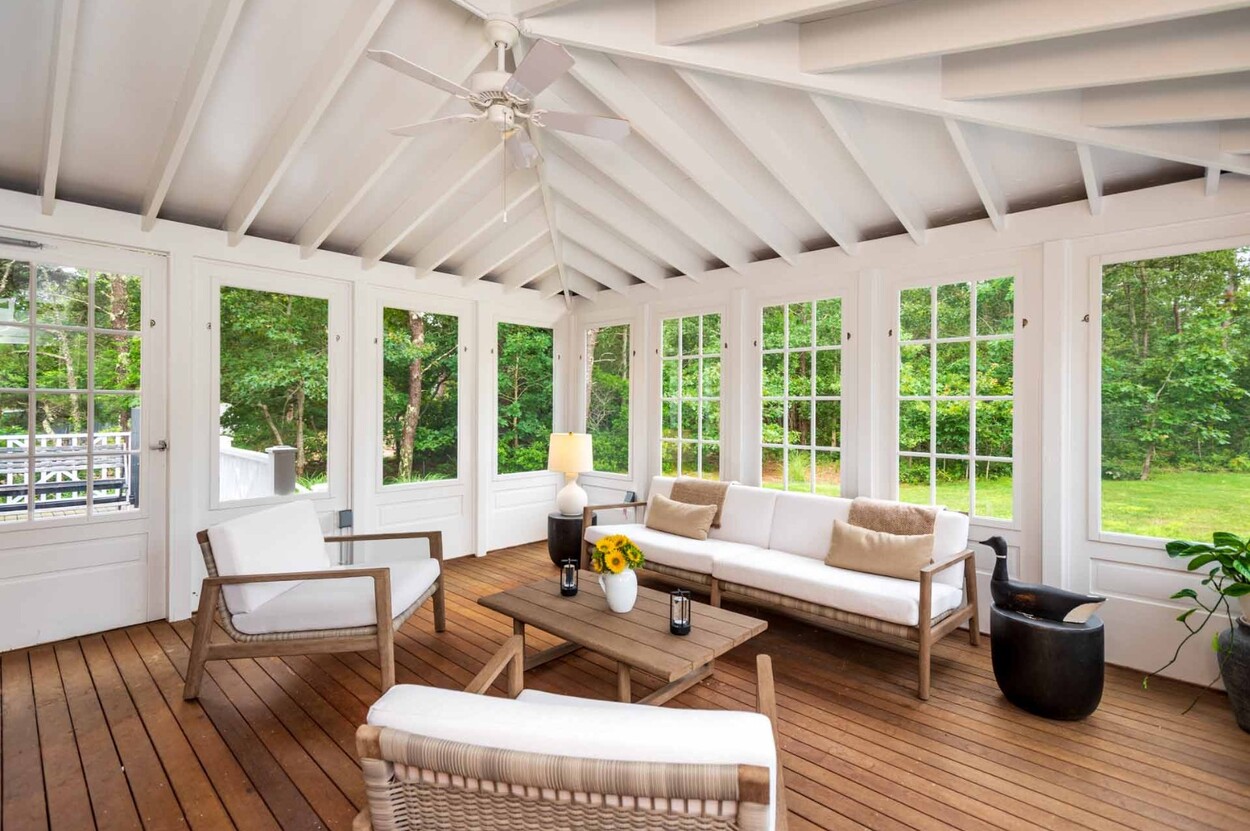 Seamless indoor-outdoor living is a hallmark of the home, with a covered porch perfect for morning coffee, a 16'x14' screened porch for afternoon lounging, an expansive deck for al fresco dining/entertaining -- plus an oversized outdoor shower, and mature landscaping that enhances the sense of privacy and peace.