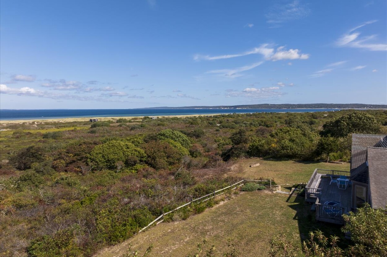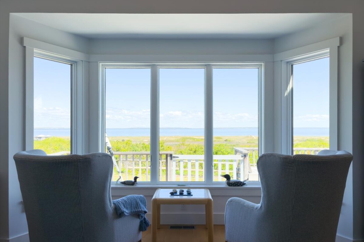Stunning waterview living with an active view that will never disappoint. Wake up every morning to breathtaking 180 degree water views in this beautifully appointed 4-bedroom, 3-bath coastal retreat. Perfectly situated to capture sunrise to sunset vistas, this home offers a blend of summer vibes with year-round living amenities. Step inside to find an open-concept living space filled with natural light, lofty ceilings, and windows that frame the water views from all angles. The kitchen is clean, open and well designed with a large island—ideal for entertaining. The spacious primary suite has a full bath and private office which opens to the screened-in porch. On the main living level, there are two additional bedrooms that share a full bath. The lower level is partially finished with a living area with ocean views, doors to the lawn and outdoor shower as well as a bedroom and full bath.