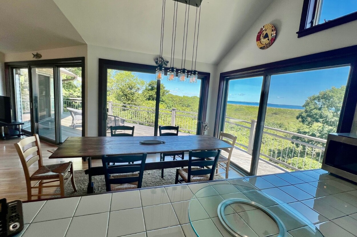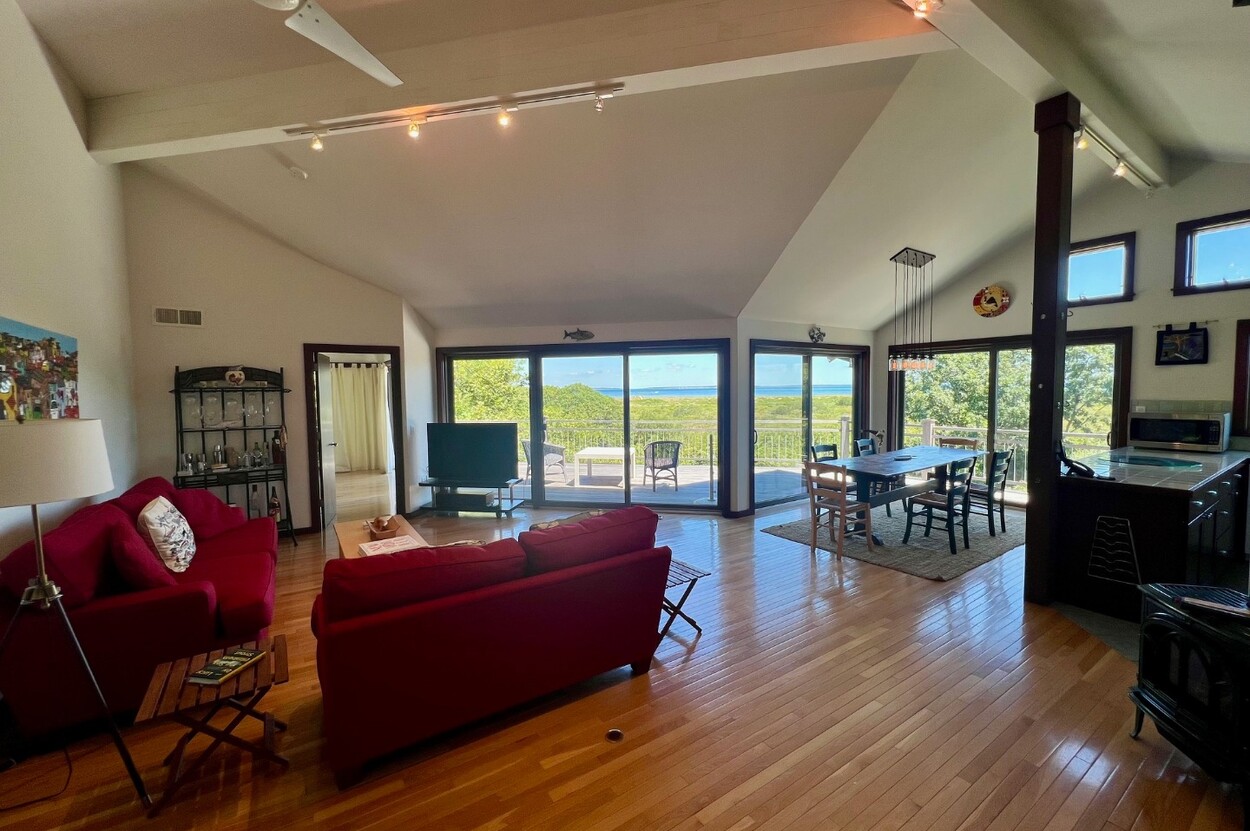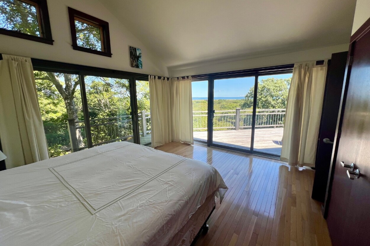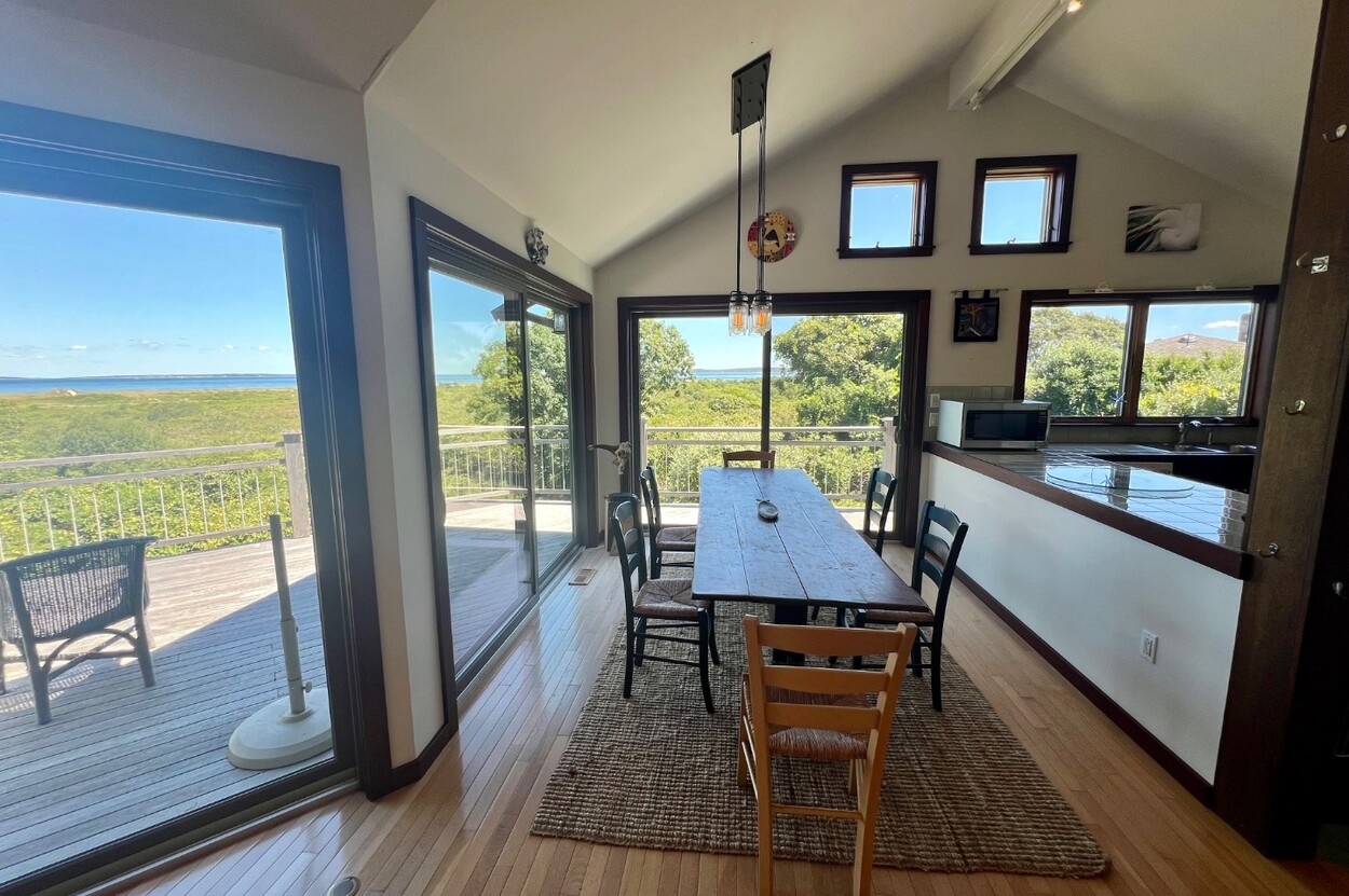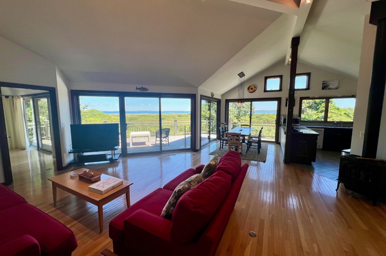 Spacious contemporary set high off Lighthouse Road with unobstructed, amazing water views of the Vineyard Sound and Elizabeth Islands. Open concept design with soaring ceilings and modern architecture. A retreat for all seasons this house is fully insulated, heated and has central air. A center island in the kitchen ensures the cook of the family does not miss out on the amazing sunsets. Ground level offers family room and gym space or just nice getaway with privacy. Access to Philbin Beach, Lobsterville Beach and all the perks of Aquinnah residency.