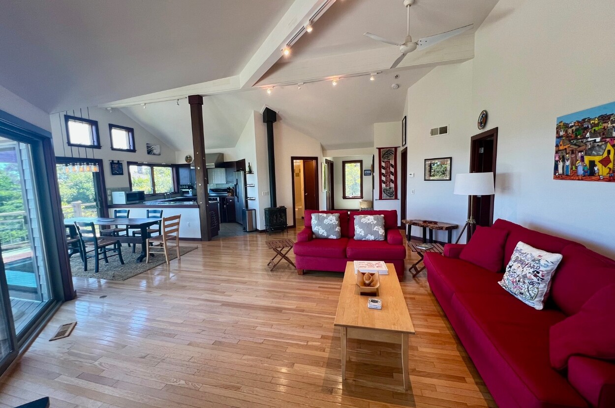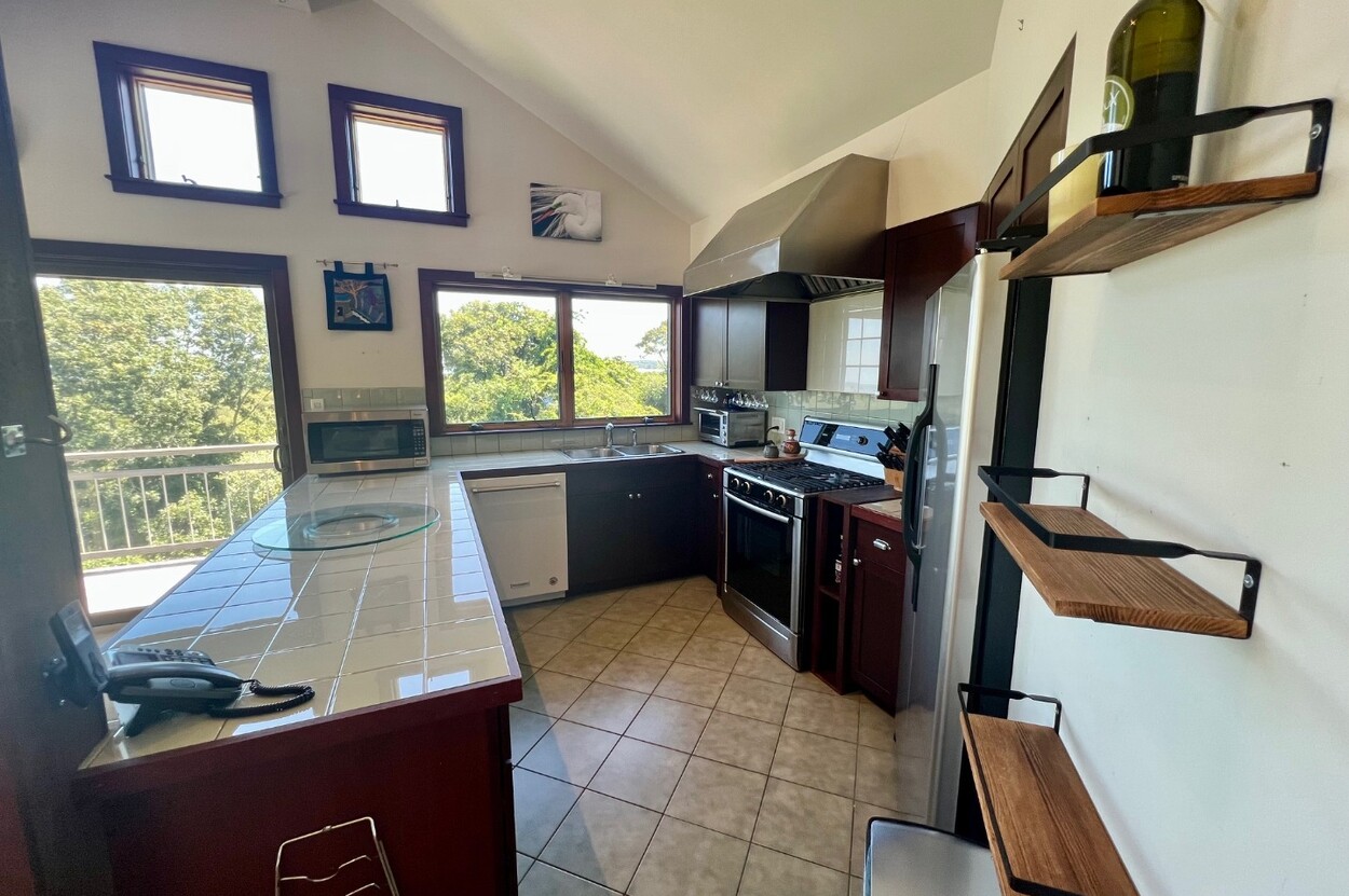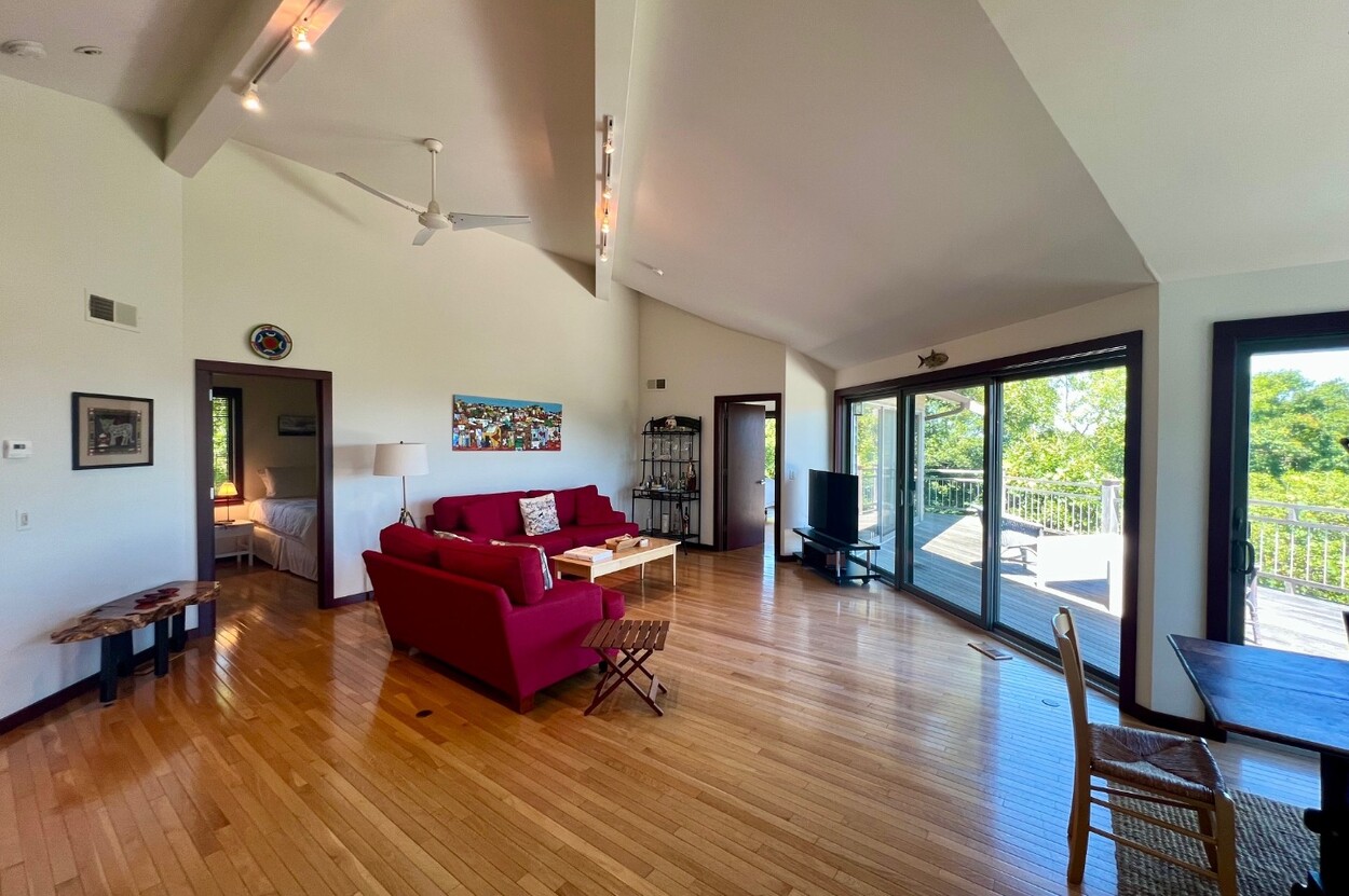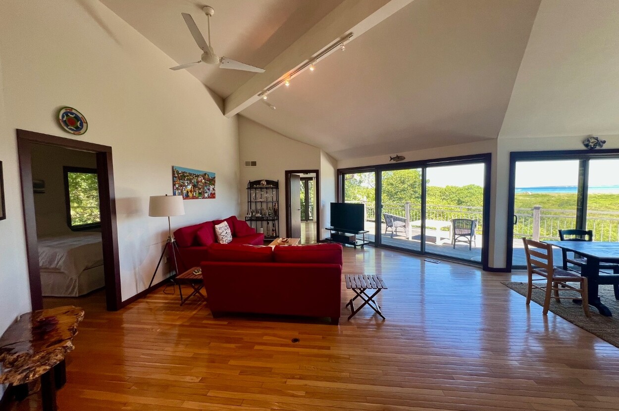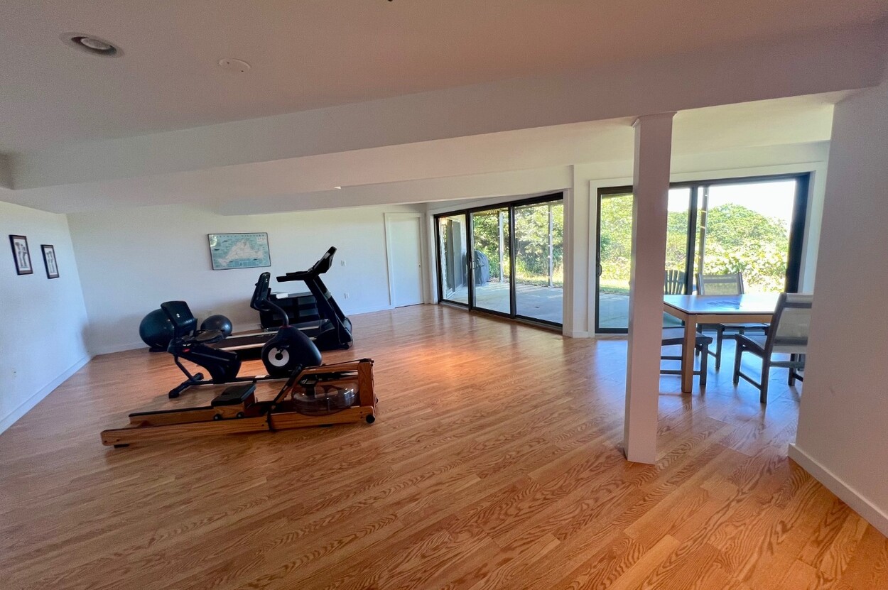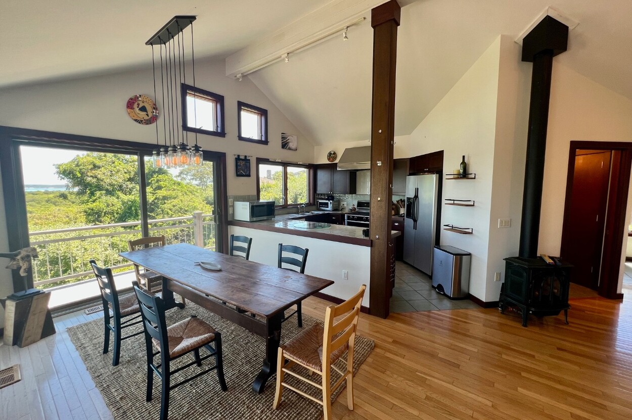 Spacious contemporary set high off Lighthouse Road with unobstructed, amazing water views of the Vineyard Sound and Elizabeth Islands. Open concept design with soaring ceilings and modern architecture. A retreat for all seasons this house is fully insulated, heated and has central air. A center island in the kitchen ensures the cook of the family does not miss out on the amazing sunsets. Ground level offers family room and gym space or just nice getaway with privacy. Access to Philbin Beach, Lobsterville Beach and all the perks of Aquinnah residency.