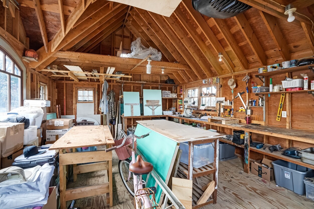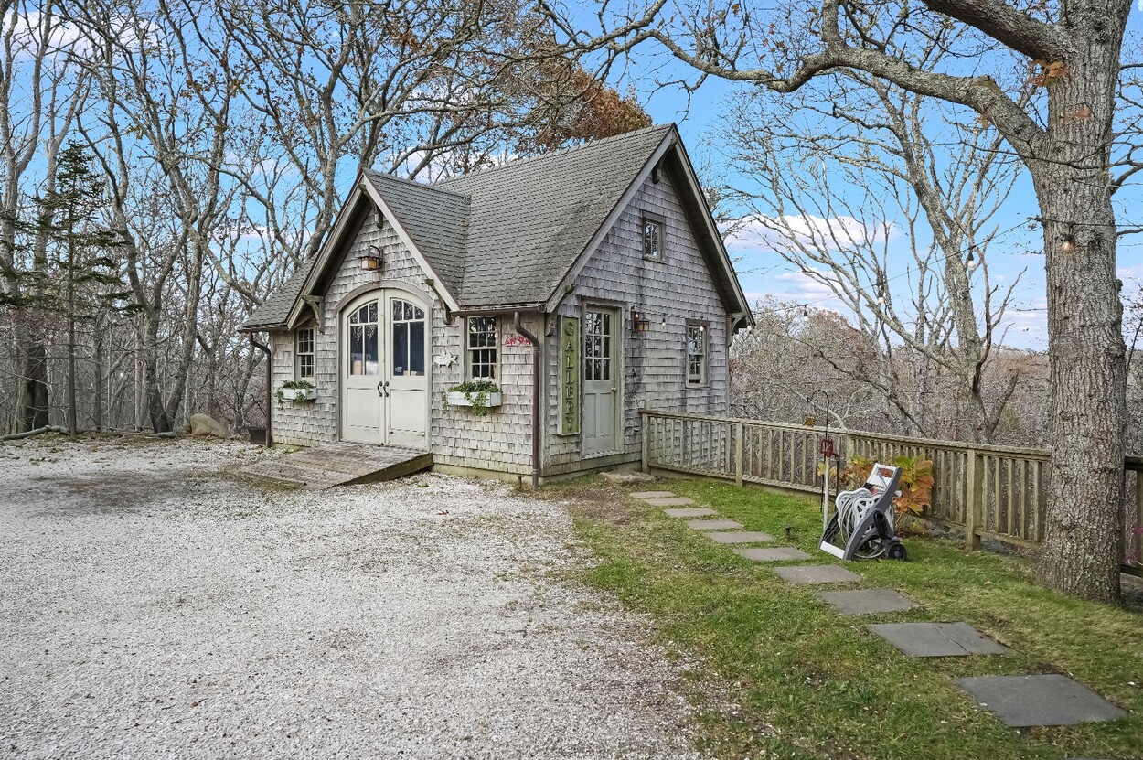 The grounds are a standout: a manicured lawn, extensive custom stonework, garden beds, and multiple outdoor seating areas create a serene Vineyard setting. Tucked toward the rear of the property, the two-level workshop/studio—equipped with plumbing, electricity, and a wood stove—offers incredible potential for creative or practical use. With appropriate permitting and a future septic upgrade, buyers could explore the possibility of converting the studio into an accessory dwelling unit.