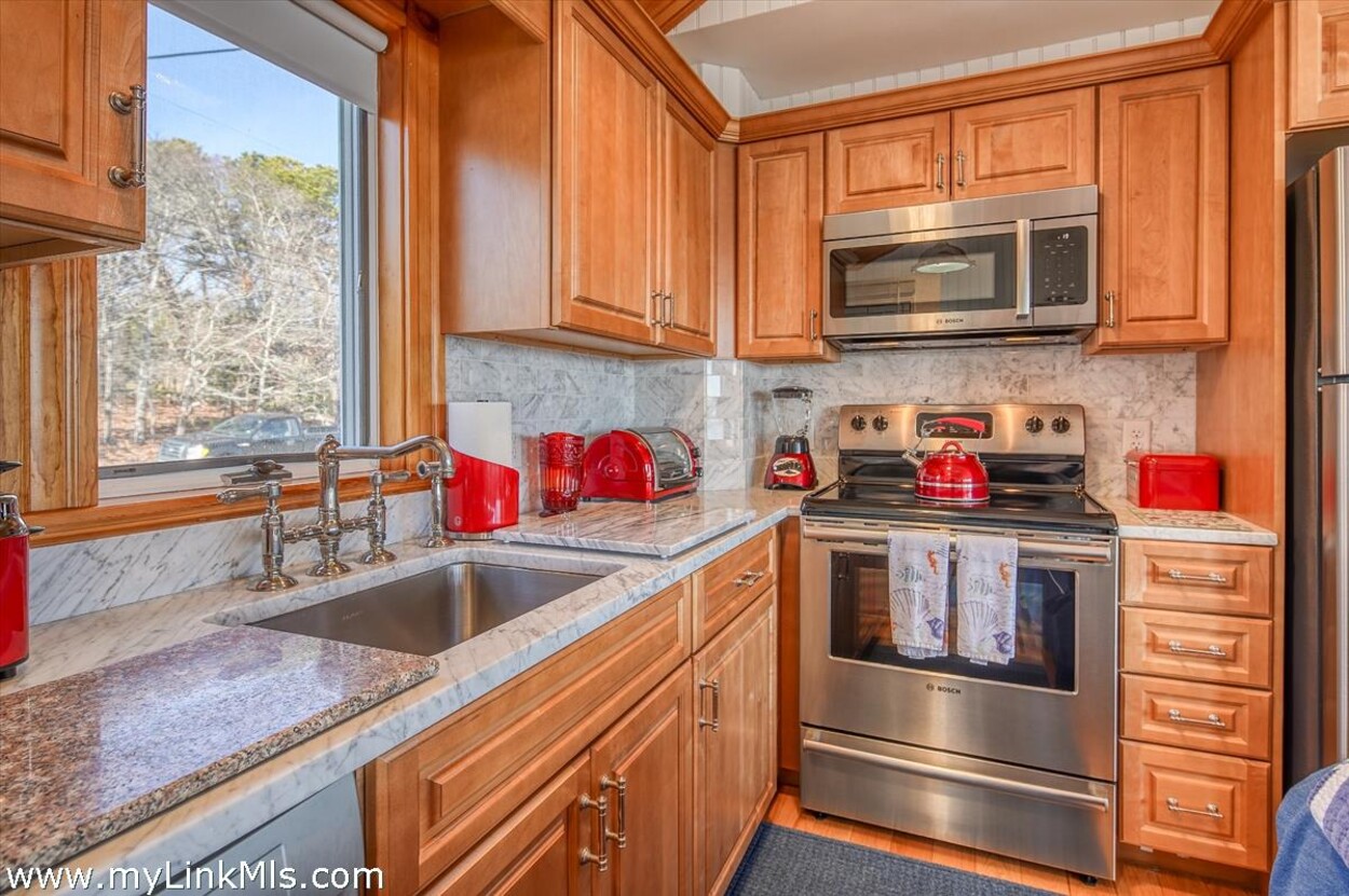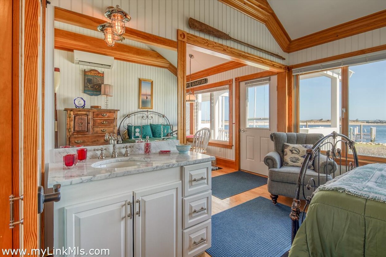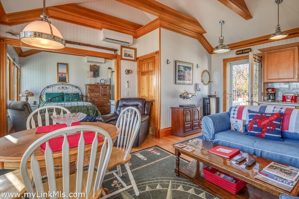 East Chop/Oak Bluffs waterfront -- The ultimate in waterfront living experiences, this 1-bedroom, waterfront condominium unit, the "Captain's Quarters", features outstanding water views of the harbor and sound beyond, private entrance, cathedral ceilings and is just steps from the tennis club, beaches, restaurants, ferries to the mainland and downtown. In pristine condition, the unit includes new kitchen with Bosch appliances, living room, dining area and a private covered front porch over-looking the water. The unit has electric baseboard heat plus mini-split heat/AC. Common areas include private outdoor shower with dressing area, and outdoor patio/grill area. Condominium owners have first option to rent a slip at the 106 ft dock for 8 slips and a 40’ T at the end for a 9th boat. Each condo unit includes a designated parking space for one vehicle. Built in 1952, and operated as East Chop Harborfront Apartments since then, the property has had extensive top to bottom renovations including new wiring, plumbing, insulation, heating/AC, and dredged dockage. Features include crown molding and attention to detail, new kitchen and bathroom (with handicap accessible shower) with Italian Carrara subway tile, classic and timeless, as well as beautifully landscaped grounds. Laundry service available. Occupancy available beginning Nov. 1st, 2025. New condominium pending buyer approval of final condominium documents. House keeping available at owners discretion. Sold with furniture depending on price. Available for showing with 24-hour notice until June 15th, thereafter Saturday's 10-12.
