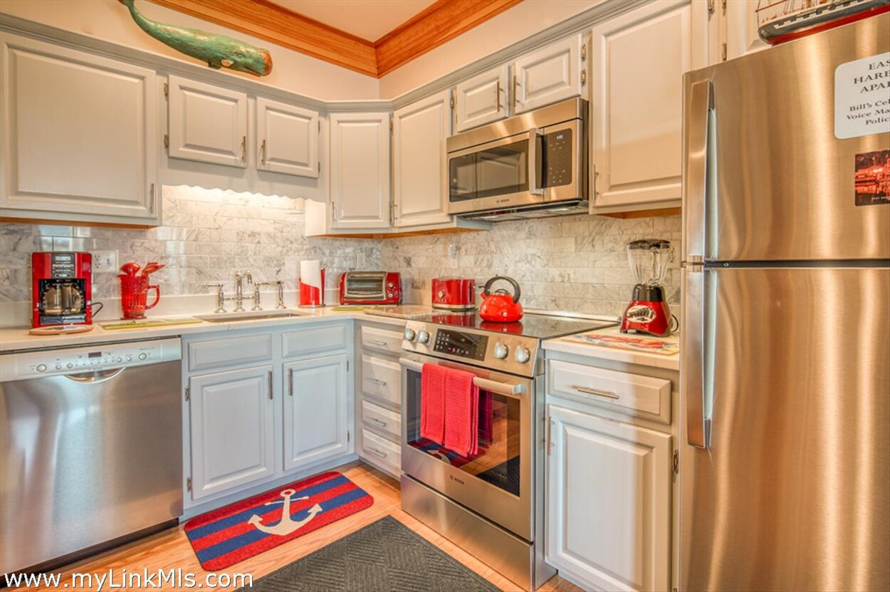 East Chop Water Front Luxury Condominium -- This 1-bedroom, 1st floor, waterfront condominium, "Oak Bluffs", features outstanding water views of the harbor and sound beyond. Located just steps from the tennis club, beaches, restaurants, ferries to the mainland and downtown, this unit includes new kitchen with Bosch appliances, living room, dining area and a private covered front porch over-looking the water. The unit has electric baseboard heat plus mini-split heat/AC. Common areas include private outdoor shower with dressing area, and outdoor patio/grill area. Condominium owners have first option to rent a slip at the 106 ft dock with water/electric for 8 slips and a 40’ T at the end for a 9th boat; Each condo unit includes a designated parking space for one vehicle. Built in 1952, and operated as East Chop Harborfront Apartments since then, the property has had extensive top to bottom renovations including new wiring, plumbing, insulation, heating/AC, exterior security cameras and dredged dockage. Features include crown molding and attention to detail, new kitchen and bathroom with Italian Carrara subway tile, classic and timeless, as well as beautifully landscaped grounds. Laundry service available. Occupancy available beginning Nov. 1st, 2025. New condominium pending buyer approval of final condominium documents. House keeping available at owners discretion. Hot water on 80-gal. tank, metered and prorated. Sold with furniture depending on price. Available for showing with 24-hour notice until June 15th, thereafter Saturday's 10-12.