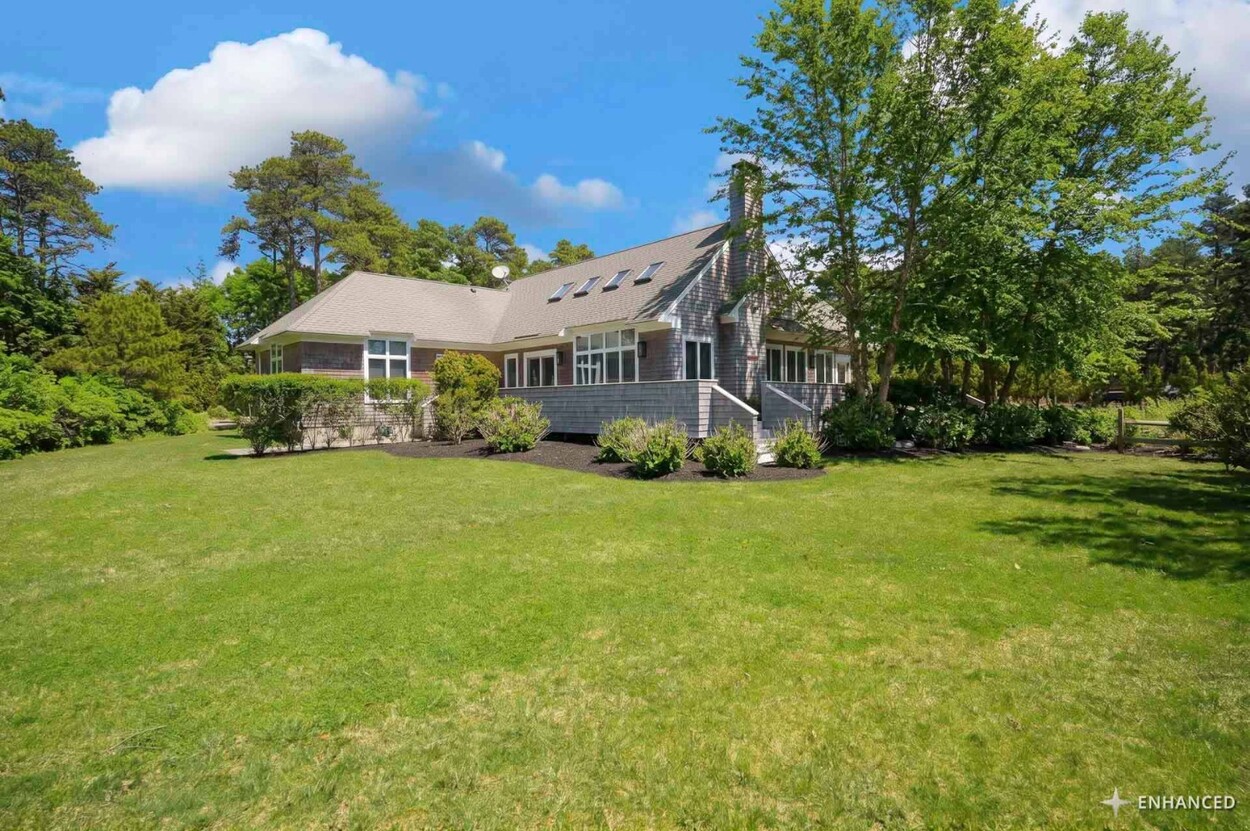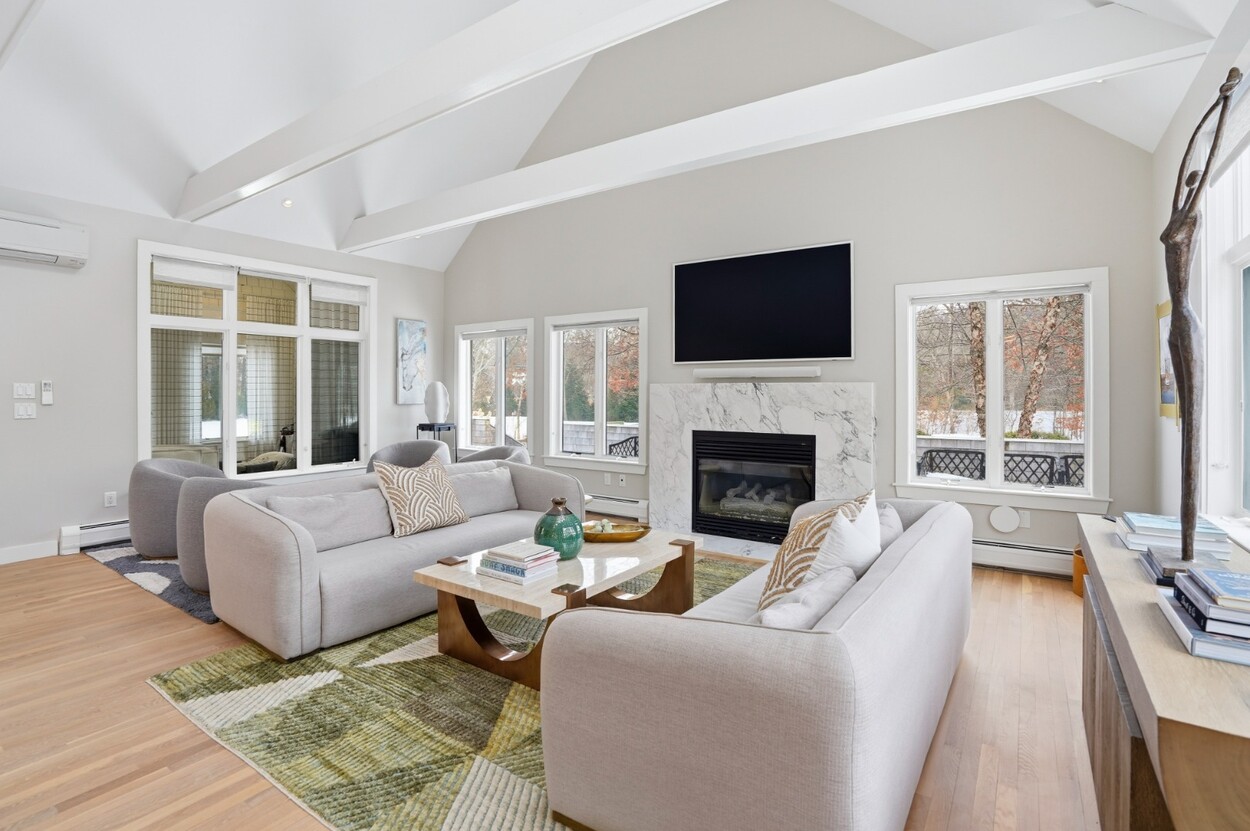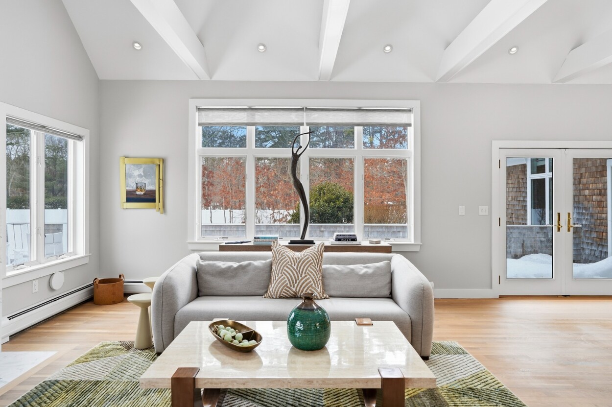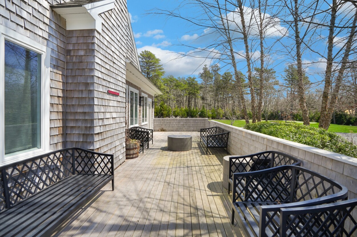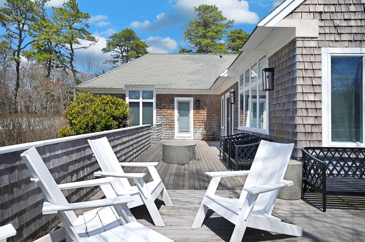 COASTAL-STYLE CONTEMPORARY. Ideally located in central Edgartown, the property offers convenient access to the bicycle path, Morning Glory Farm, Edgartown Village and Katama/South Beach by way of Meetinghouse Way. This attractive contemporary style home has been tastefully renovated and is a perfect island retreat for year-round and summer living. The open layout features vaulted ceilings, gorgeous hardwood floors and three walls of glass windows. French doors that open onto a three-season porch and an expansive wraparound mahogany deck, perfect for indoor-outdoor living and entertaining. The living area is anchored by an attractive gas fireplace and the beautiful kitchen, which features stainless appliances, custom tile, countertops, wine cooler/beverage center and a center prep island/breakfast bar with counter seating. Mini split dual AC/heat units are located in every room and also in the basement. This property can be enjoyed as-is or expanded for up to seven bedrooms. The outdoor space is built for entertaining with a newly installed putting green yet there is also plenty of room to install a pool and hot tub in addition. Extensive landscaping work has been done.
