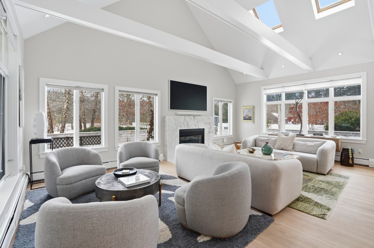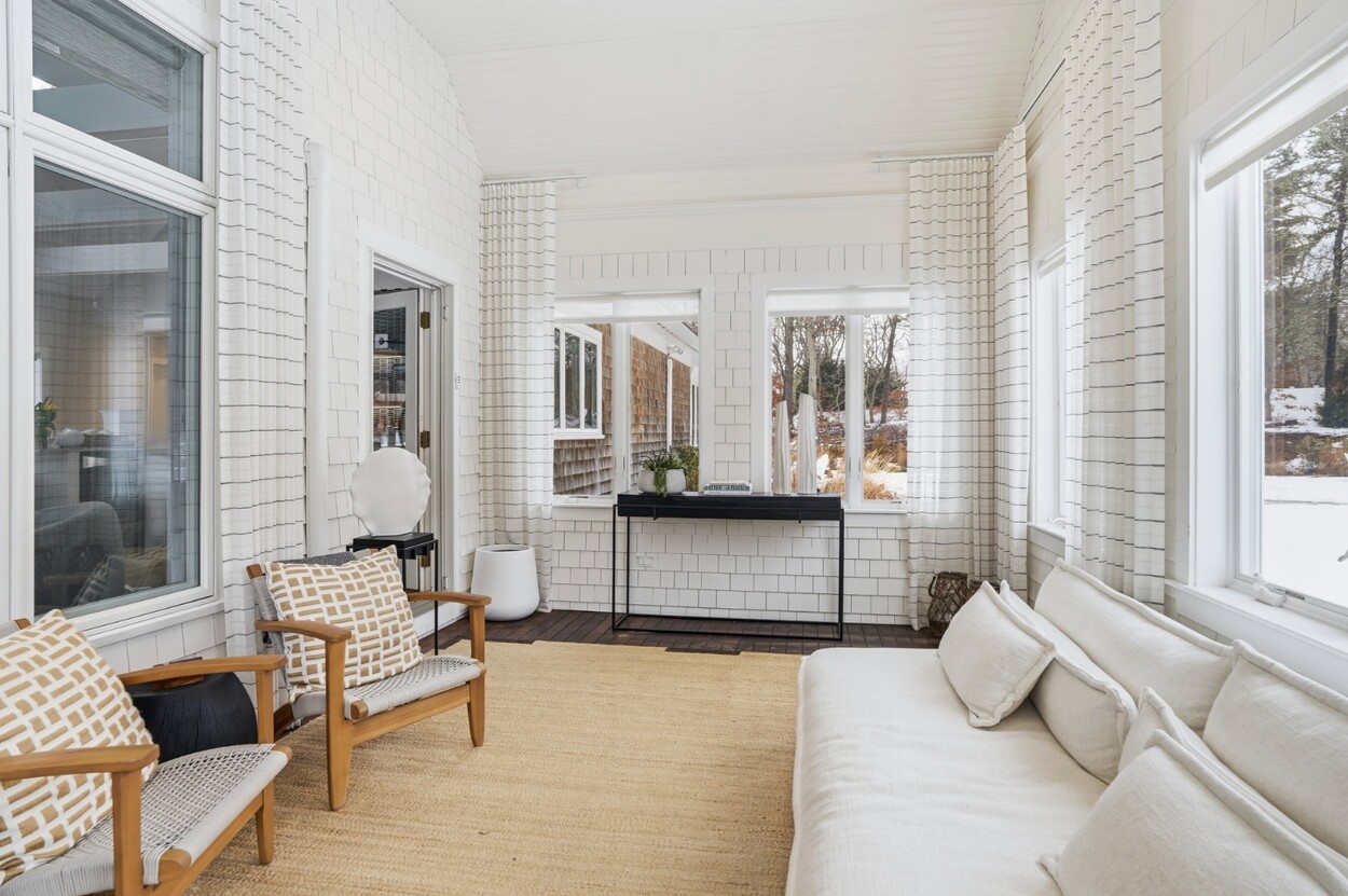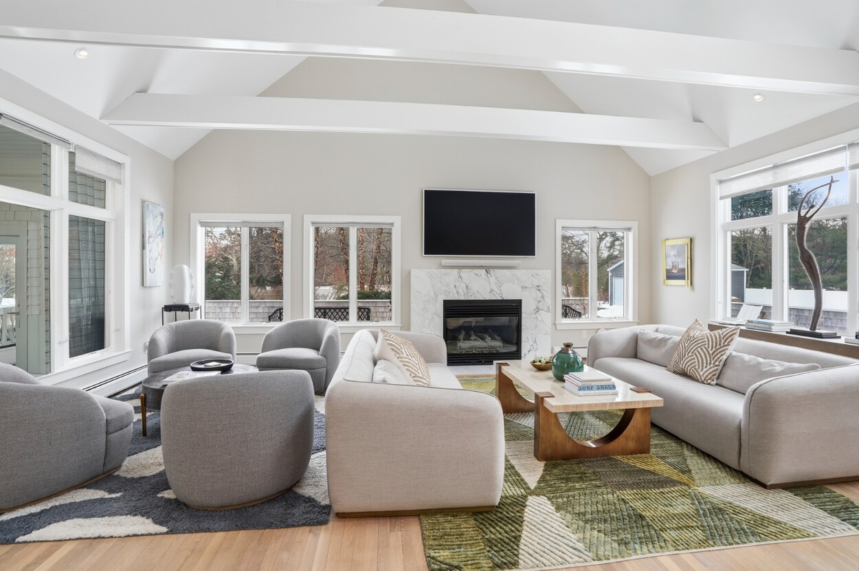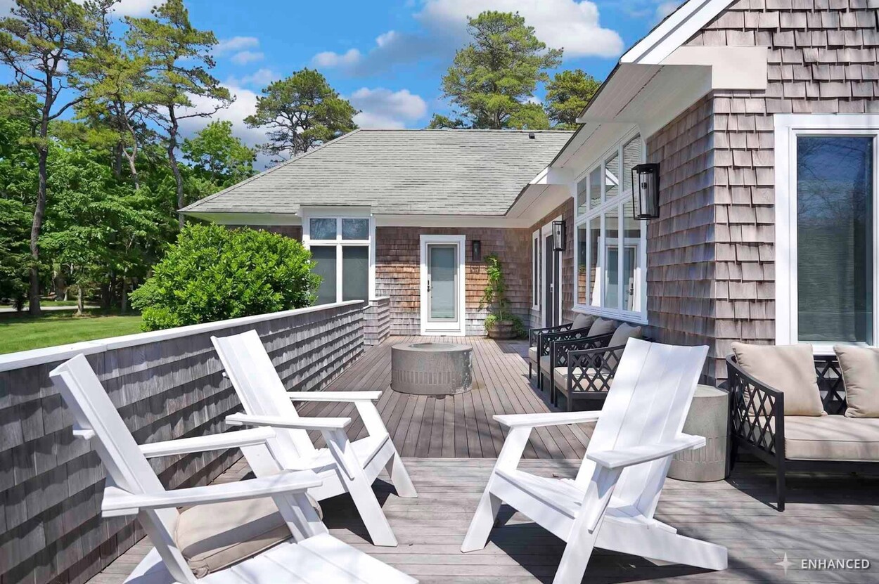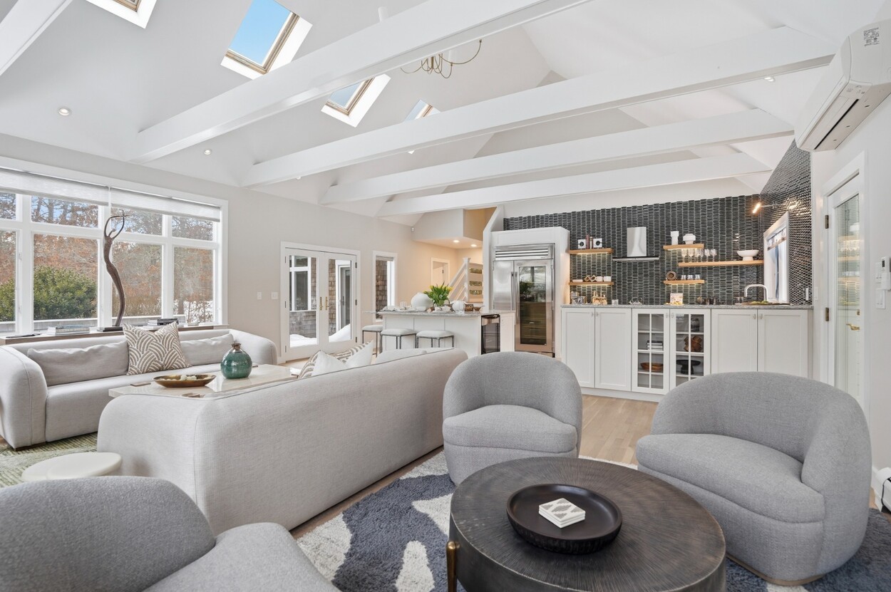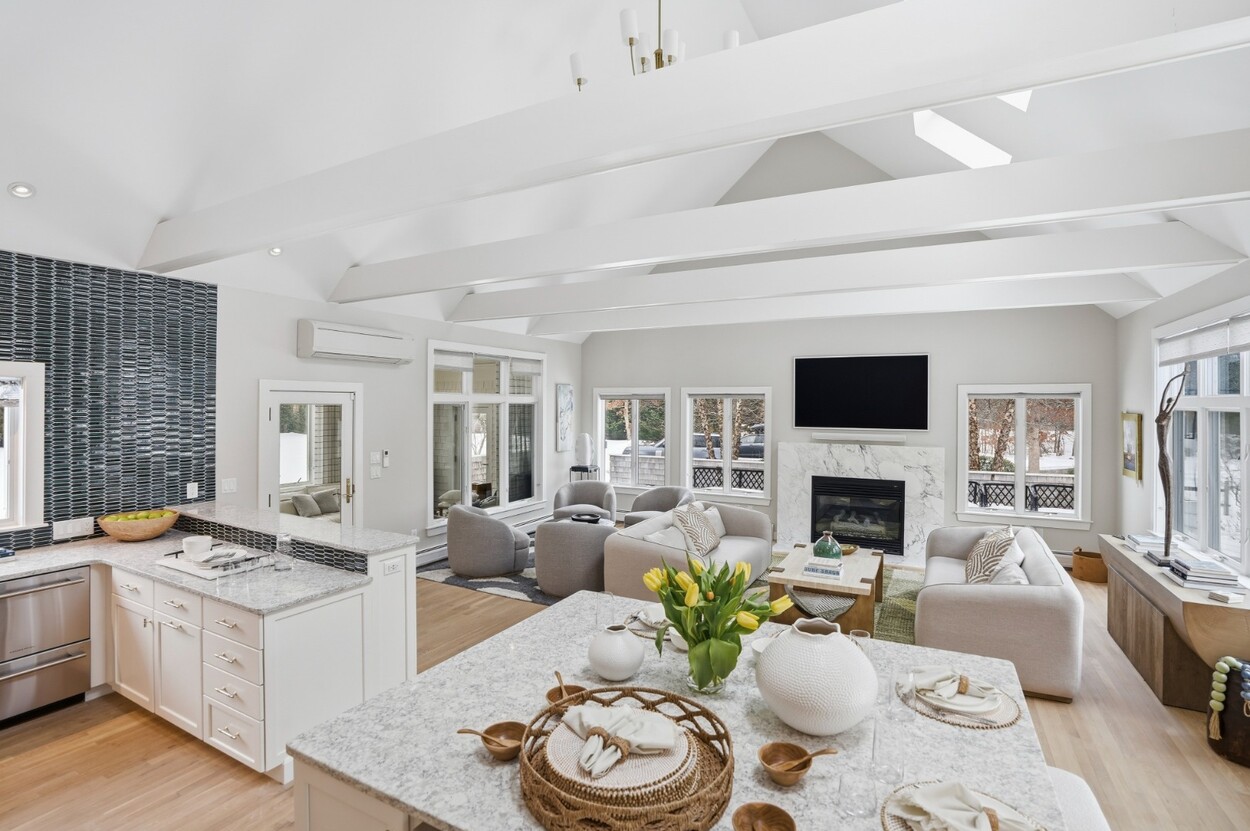 COASTAL-STYLE CONTEMPORARY. Ideally located in central Edgartown, the property offers convenient access to the bicycle path, Morning Glory Farm, Edgartown Village and Katama/South Beach by way of Meetinghouse Way. This attractive contemporary style home has been tastefully renovated and is a perfect island retreat for year-round and summer living. The open layout features vaulted ceilings, gorgeous hardwood floors and three walls of glass windows. French doors that open onto a three-season porch and an expansive wraparound mahogany deck, perfect for indoor-outdoor living and entertaining. The living area is anchored by an attractive gas fireplace and the beautiful kitchen, which features stainless appliances, custom tile, countertops, wine cooler/beverage center and a center prep island/breakfast bar with counter seating. Mini split dual AC/heat units are located in every room and also in the basement. This property can be enjoyed as-is or expanded for up to seven bedrooms. The outdoor space is built for entertaining with a newly installed putting green yet there is also plenty of room to install a pool and hot tub in addition. Extensive landscaping work has been done.