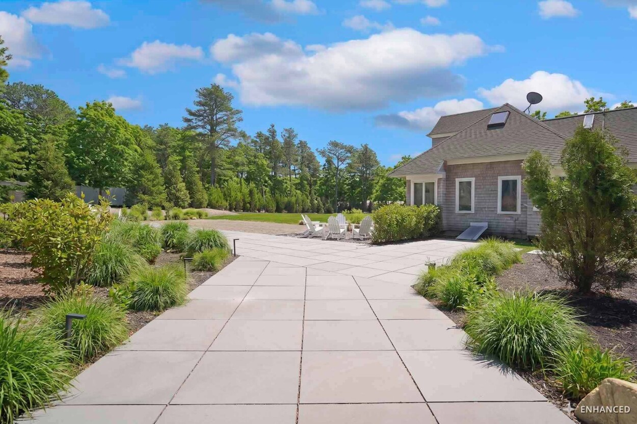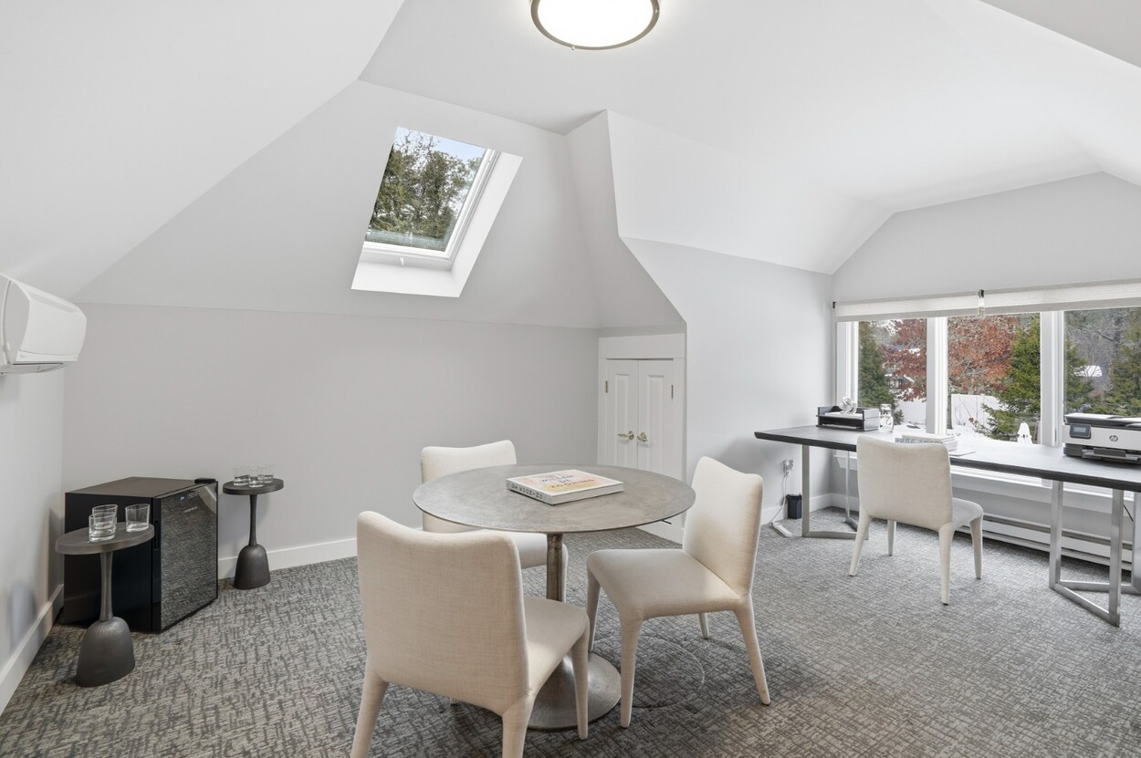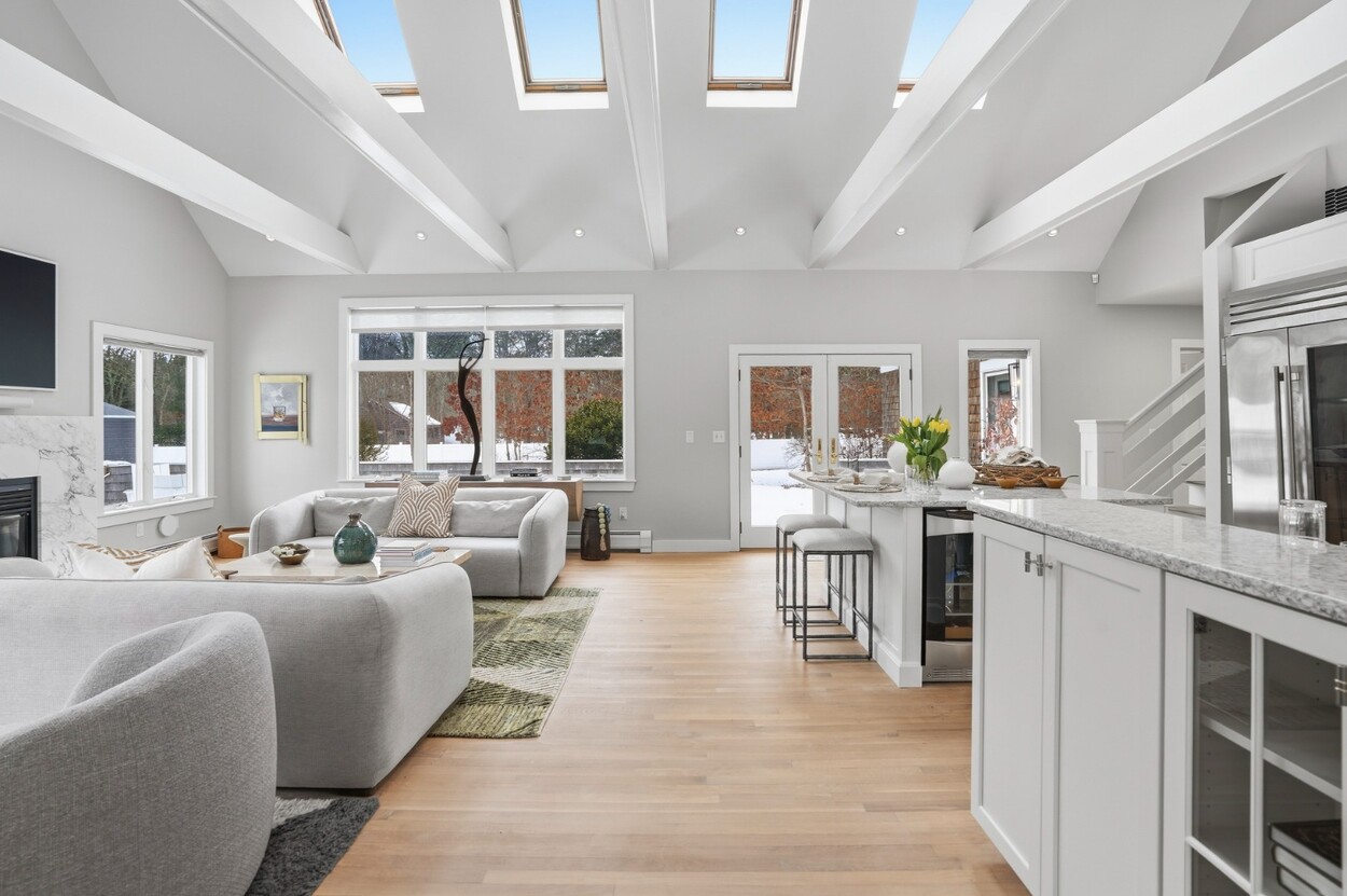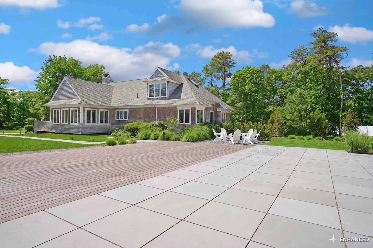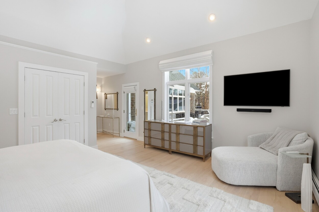 COASTAL-STYLE CONTEMPORARY. Ideally located in central Edgartown, the property offers convenient access to the bicycle path, Morning Glory Farm, Edgartown Village and Katama/South Beach by way of Meetinghouse Way. This attractive contemporary style home has been tastefully renovated and is a perfect island retreat for year-round and summer living. The open layout features vaulted ceilings, gorgeous hardwood floors and three walls of glass windows. French doors that open onto a three-season porch and an expansive wraparound mahogany deck, perfect for indoor-outdoor living and entertaining. The living area is anchored by an attractive gas fireplace and the beautiful kitchen, which features stainless appliances, custom tile, countertops, wine cooler/beverage center and a center prep island/breakfast bar with counter seating. Mini split dual AC/heat units are located in every room and also in the basement. This property can be enjoyed as-is or expanded for up to seven bedrooms. The outdoor space is built for entertaining with a newly installed putting green yet there is also plenty of room to install a pool and hot tub in addition. Extensive landscaping work has been done.