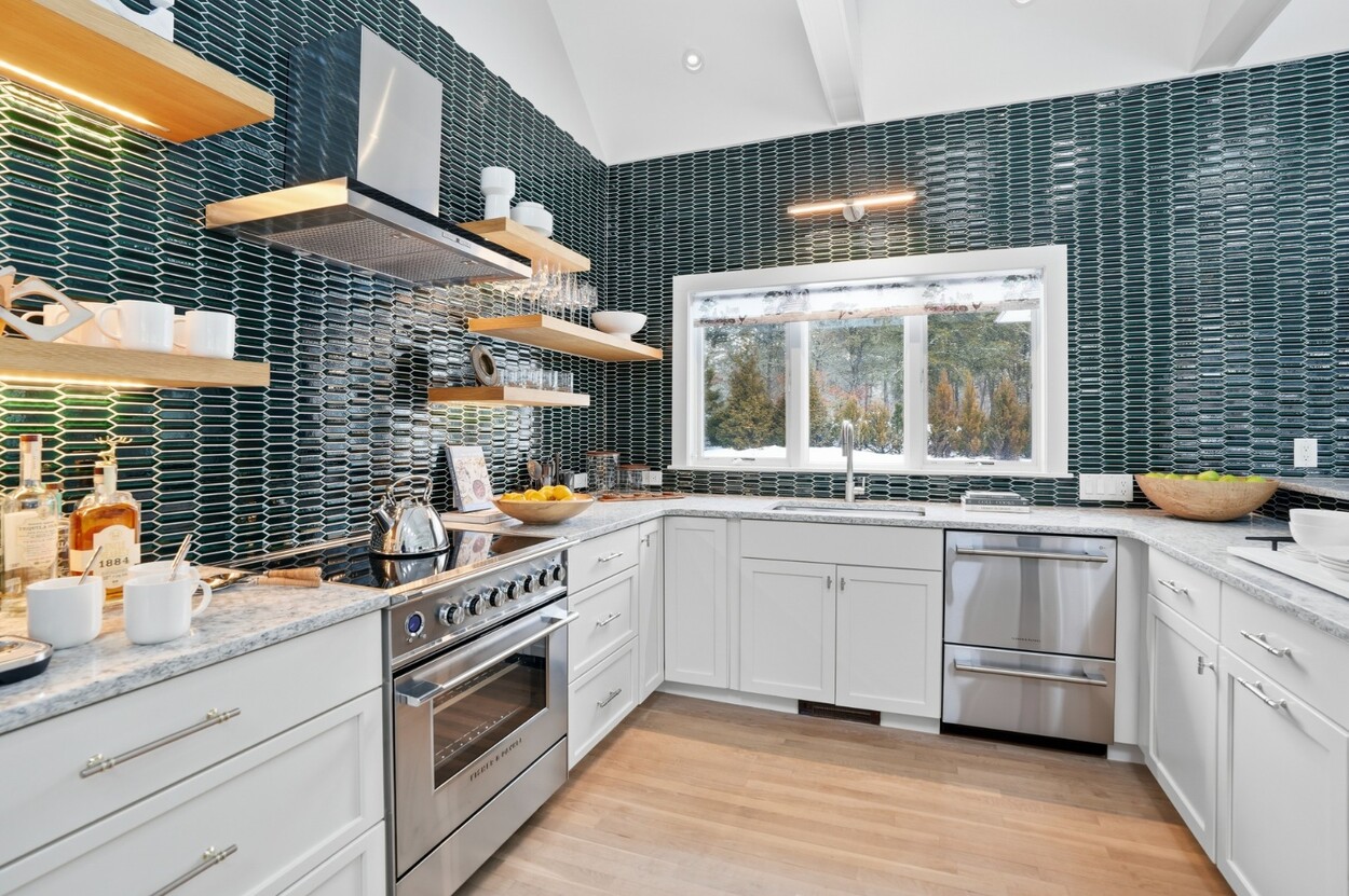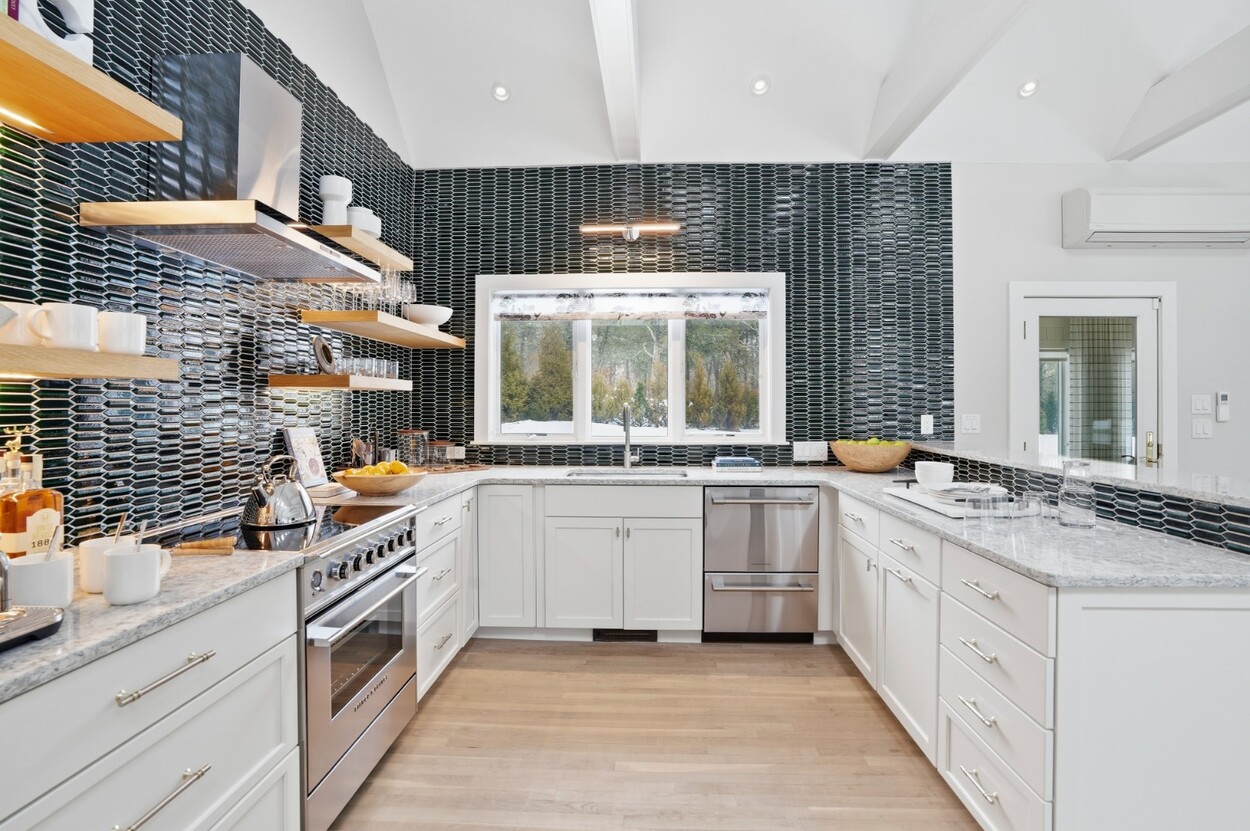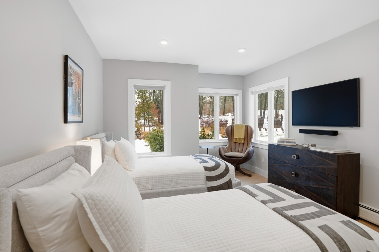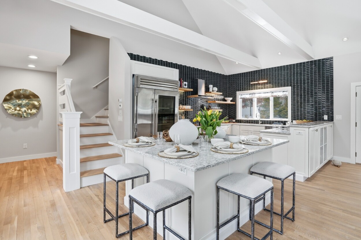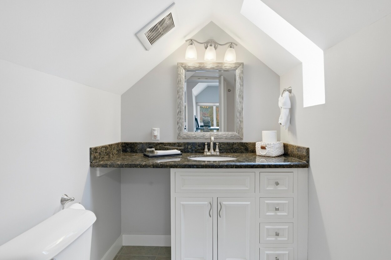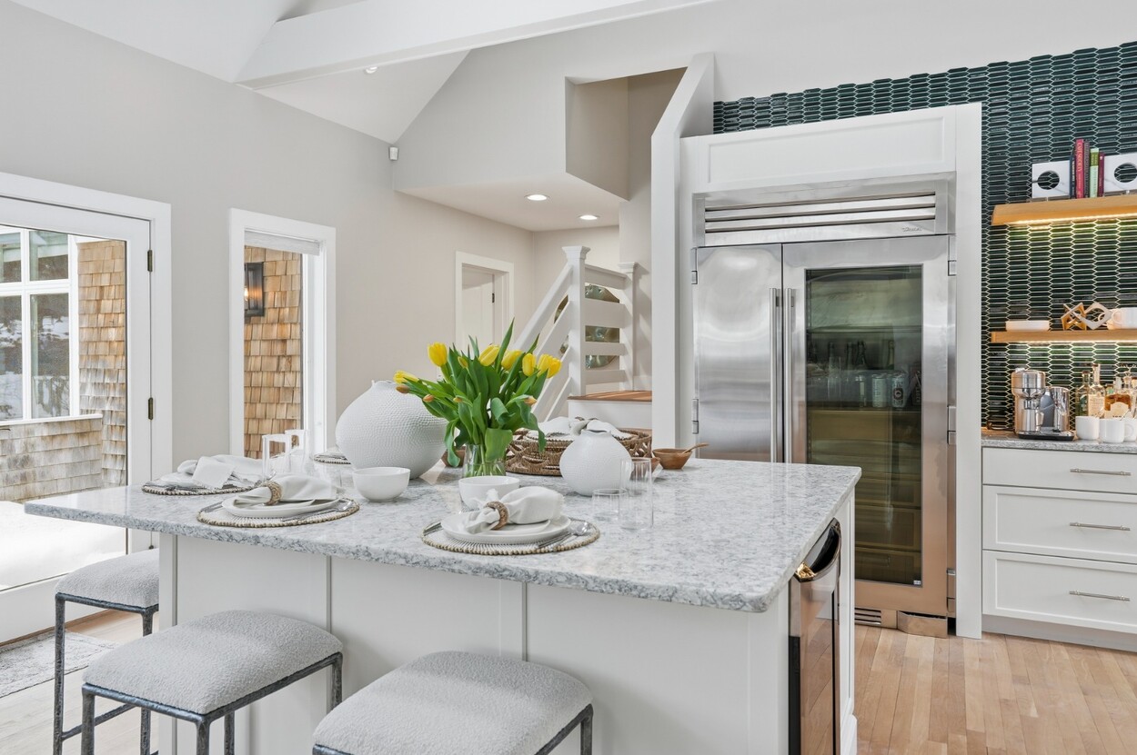 COASTAL-STYLE CONTEMPORARY. Ideally located in central Edgartown, the property offers convenient access to the bicycle path, Morning Glory Farm, Edgartown Village and Katama/South Beach by way of Meetinghouse Way. This attractive contemporary style home has been tastefully renovated and is a perfect island retreat for year-round and summer living. The open layout features vaulted ceilings, gorgeous hardwood floors and three walls of glass windows. French doors that open onto a three-season porch and an expansive wraparound mahogany deck, perfect for indoor-outdoor living and entertaining. The living area is anchored by an attractive gas fireplace and the beautiful kitchen, which features stainless appliances, custom tile, countertops, wine cooler/beverage center and a center prep island/breakfast bar with counter seating. Mini split dual AC/heat units are located in every room and also in the basement. This property can be enjoyed as-is or expanded for up to seven bedrooms. The outdoor space is built for entertaining with a newly installed putting green yet there is also plenty of room to install a pool and hot tub in addition. Extensive landscaping work has been done.