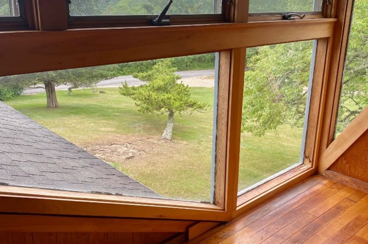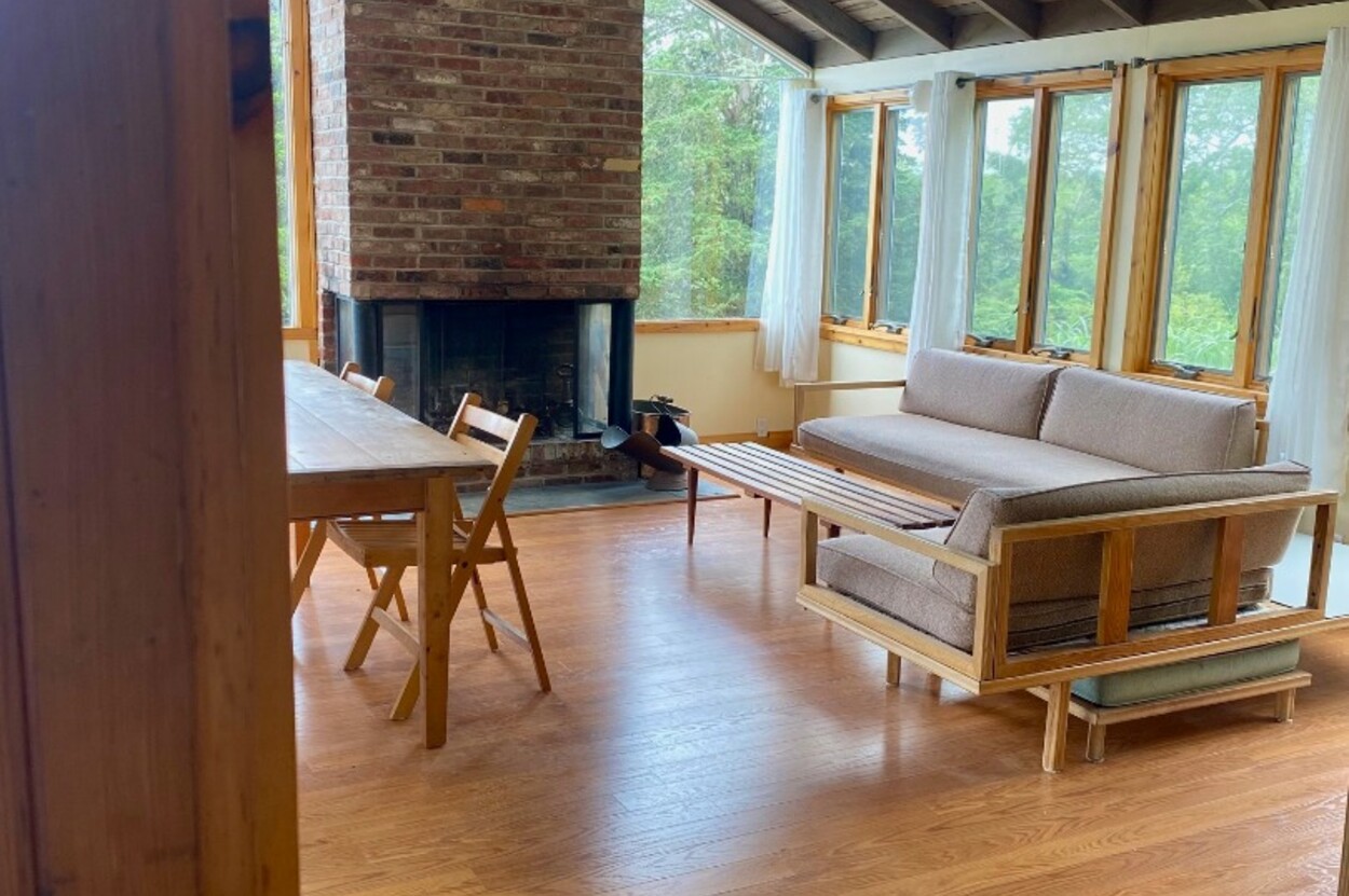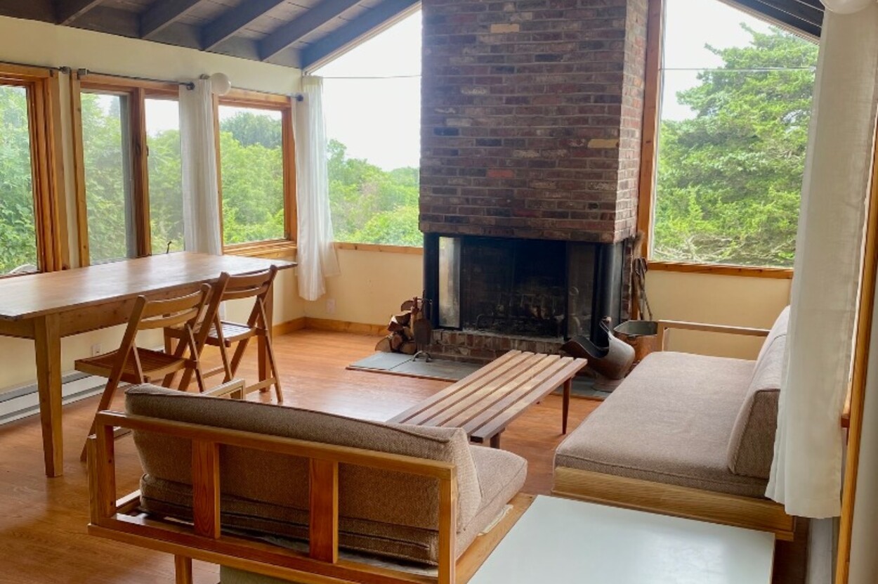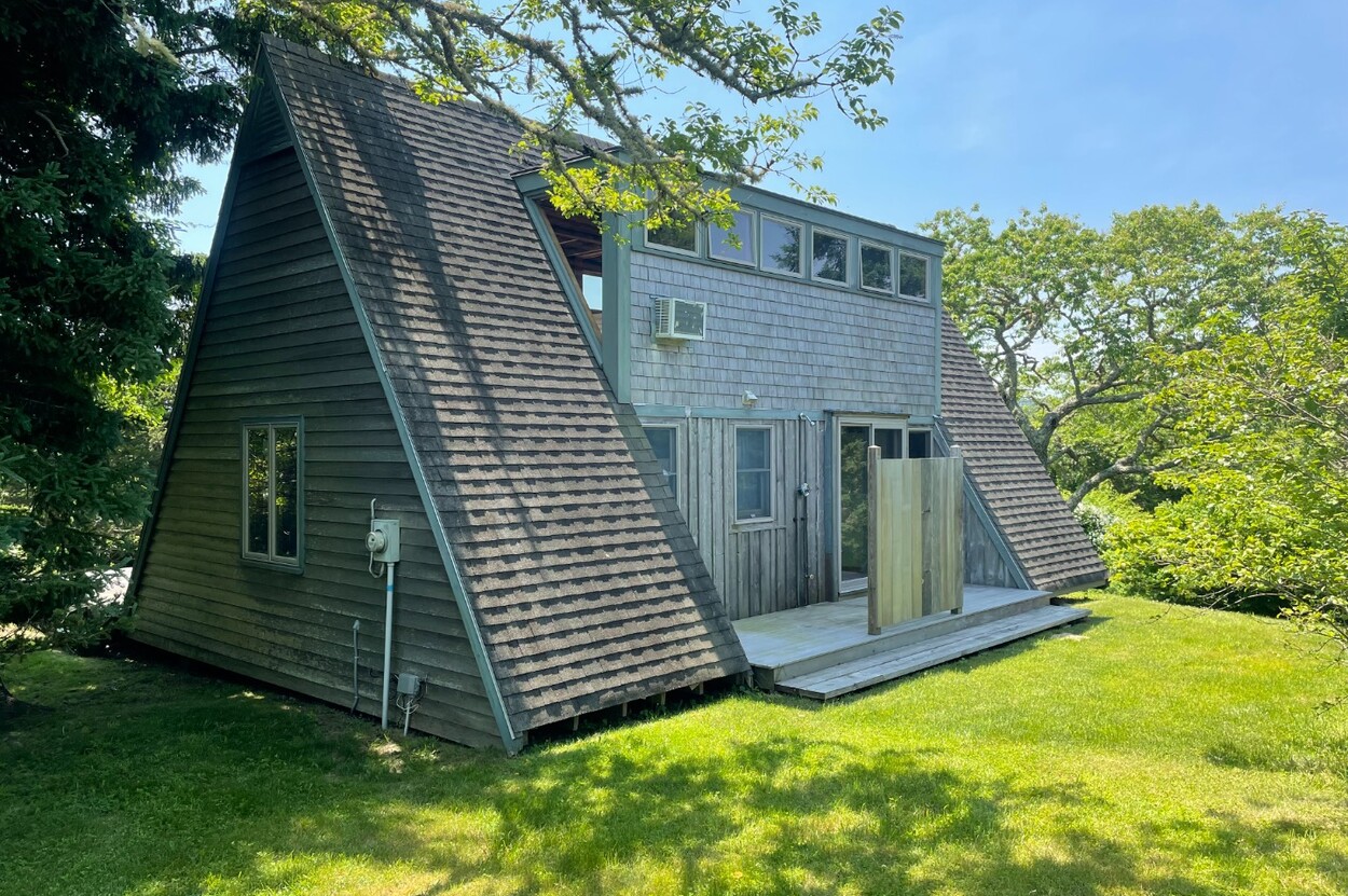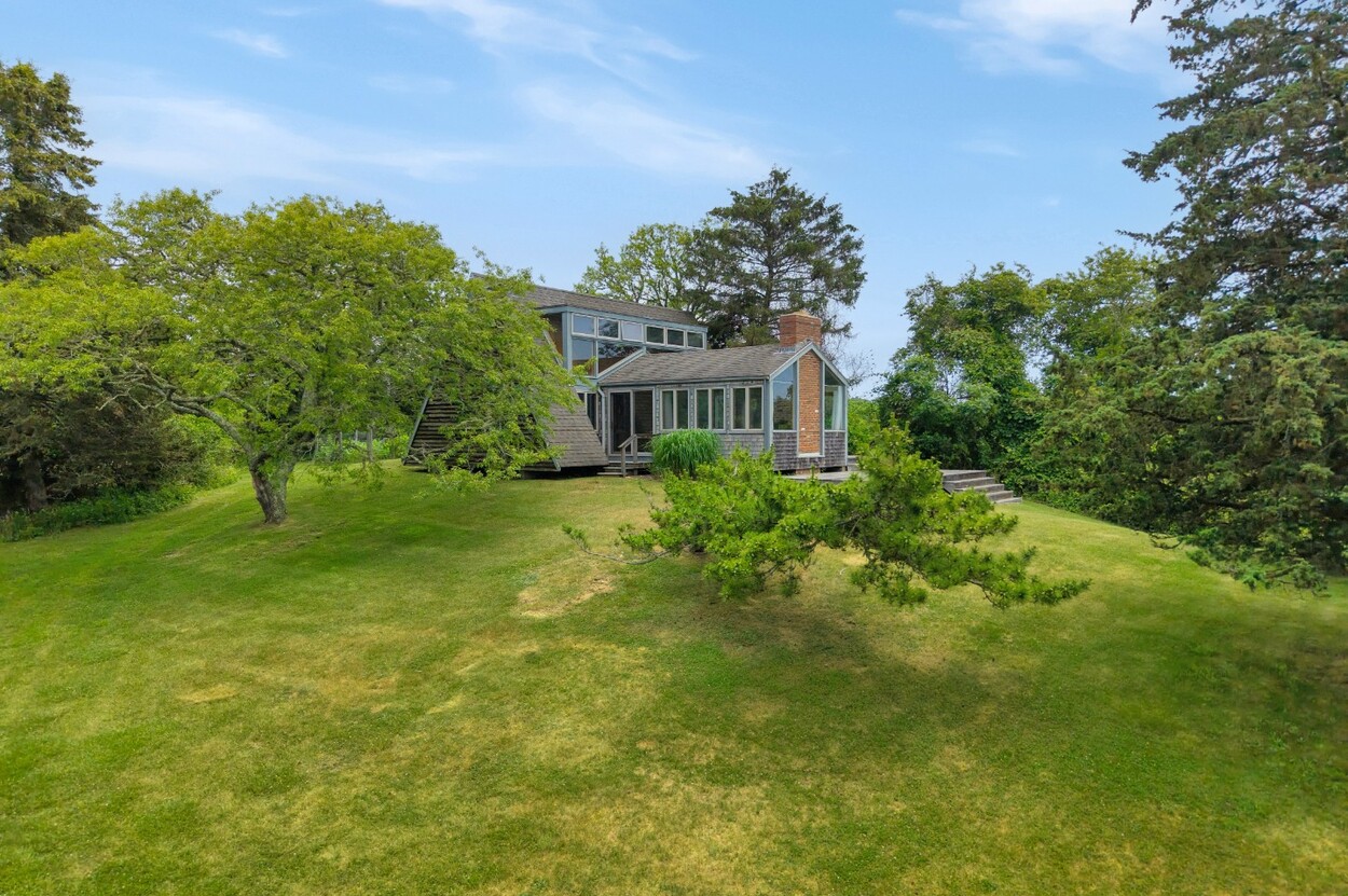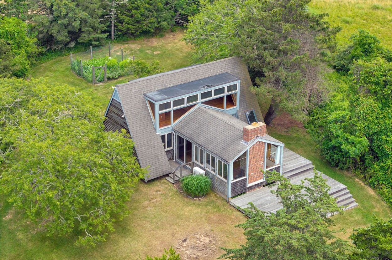 Designed by the famous mid century architect Andrew Geller, this contemporary home is situated at the top of the parcel with ocean views and a glimpse of Chilmark pond. There is ample open space to accommodate family and friends and overlooks the large meadow which follows the stone wall to South Road. Access to walking trails, and Lucy Vincent Beach is a short distance away.