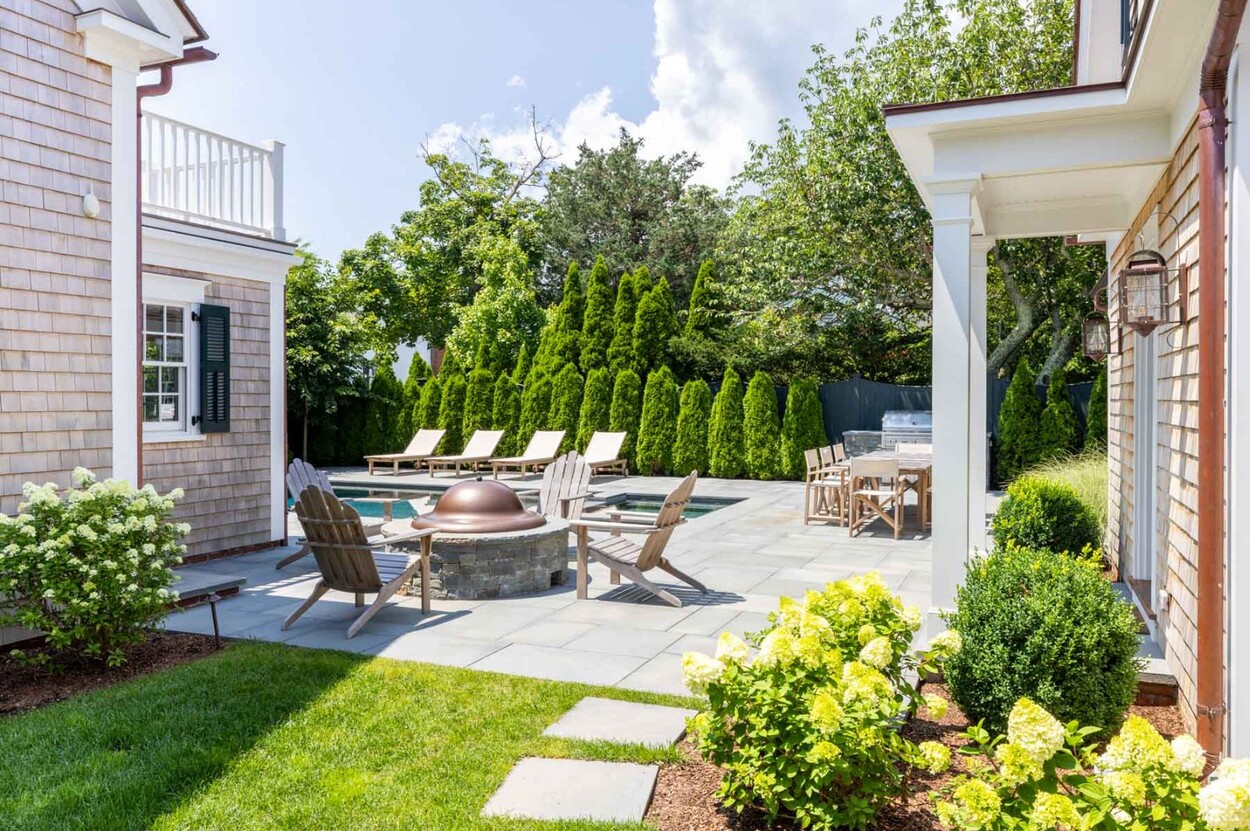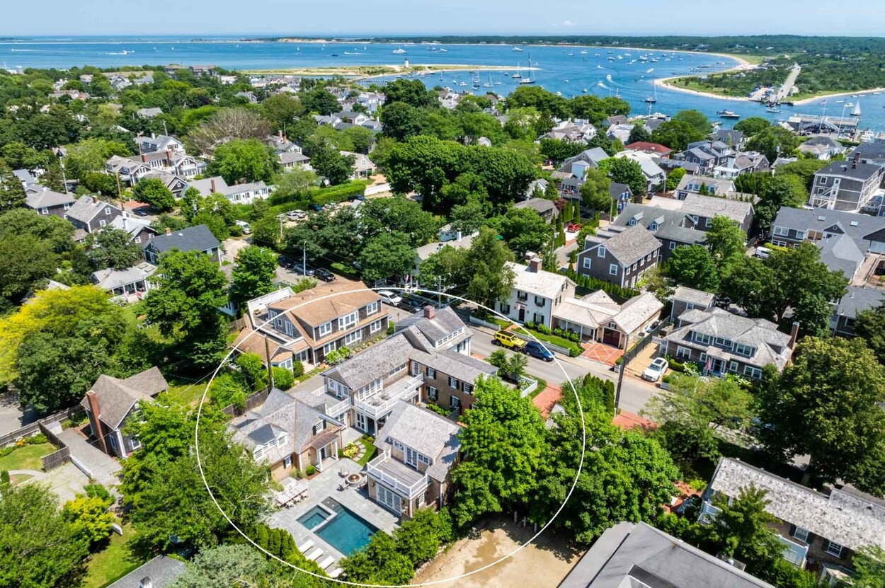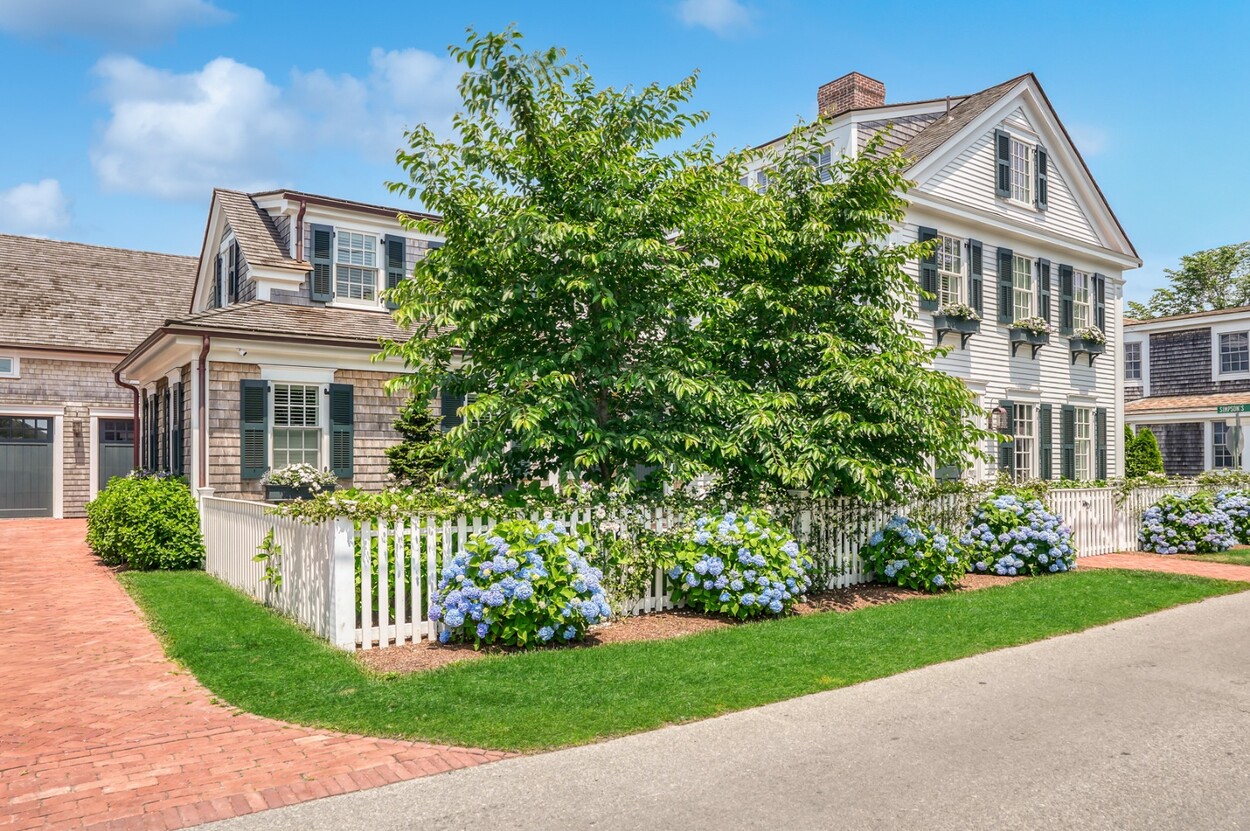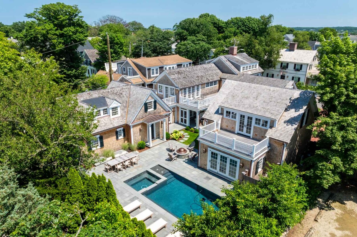 A rare legacy offering in the heart of Edgartown Village, this extraordinary in-town compound is among the largest of its kind on Martha’s Vineyard. Originally built in 1835 and masterfully renovated by renowned architect Patrick Ahearn, the estate seamlessly blends historic character with refined modern luxury. Just moments from Edgartown Harbor and the island’s premier dining and shopping, the property spans two lots and features an exceptional compound with 10 bedrooms and 14 baths. Designed for both elegant entertaining and comfortable everyday living, the main residence showcases refined architectural details and modern technology throughout. Beautiful oak floors run across the home, complemented by sophisticated hardware, premium appliances, and walls finished in classic nickel board. A gracious living room with fireplace opens to a patio with retractable screens, creating effortless indoor-outdoor flow. The chef’s kitchen is impeccably appointed with dual dishwashers, a plumbed Miele coffee bar, refrigerator drawers, and a wine refrigerator. A custom brass and glass bar, complete with an ice maker and refrigerated drawers, can easily convert into a secondary kitchen. Two private bedrooms with en-suite tile baths anchor opposite wings of the main level, offering privacy and balance. The main floor also includes a secondary living room with a gas fireplace, an elegant dining room wrapped in seagrass wallpaper, a generous walk-in pantry, and a spacious mudroom. Upstairs, a spectacular primary suite serves as a retreat with a private balcony and two spa-inspired full baths. Three additional en-suite guest rooms and a spacious laundry room complete the second floor. The third level features a charming nautical-themed bunk room with four built-in beds and a full bath. The finished lower level includes two bedrooms with en-suite baths, a media room, wine cellar, and additional laundry. Beyond the main house is a beautifully finished two-car garage with brick floors and wood-paneled walls. The carriage house above offers a private guest suite with a balcony overlooking the pool. Lush hydrangeas surround a resort-style pool and spa, complemented by a built-in grill, firepit, and a fully equipped cabana with kitchenette, half bath, laundry, and climate control. This Edgartown estate offers rare privacy, scale, and sophistication just steps from Main Street. An iconic Martha’s Vineyard property reimagined for modern coastal living.