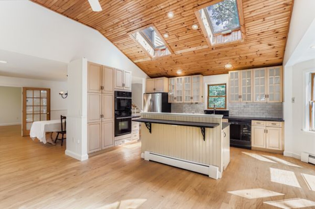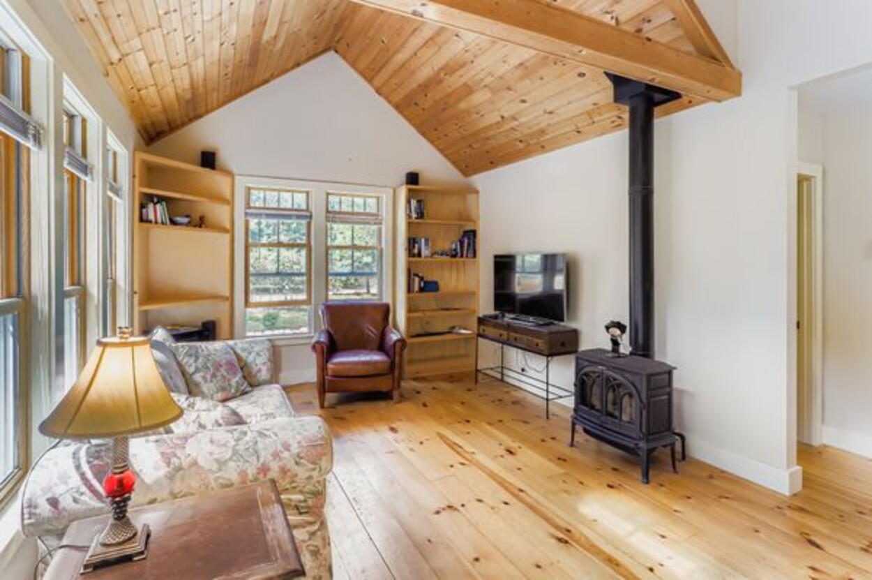 The welcoming, farm-style front porch on the main house looks out onto a large yard. Inside, the heart of the home consists of an open plan kitchen/living room with vaulted wood ceilings and a beautiful beach-stone fireplace. Step out the French doors onto a slate stone patio bordered by a fresh herb garden and butterfly bushes. The easy flow of the first floor provides a versatile dining room, den, a half bath, plus an ensuite bedroom, ideal for accessibility and privacy. Upstairs there are three sunny bedrooms with a full bathroom. Offering endless possibilities for customization, expansion, and storage, the house has a large semi-finished attic, an unfinished basement, and an attached one-car garage. Updates have been made to the main house, including a new roof. Multiple outdoor entertaining spaces, like the private back deck with an enclosed outdoor shower, make this a wonderful home for family and friends to gather.