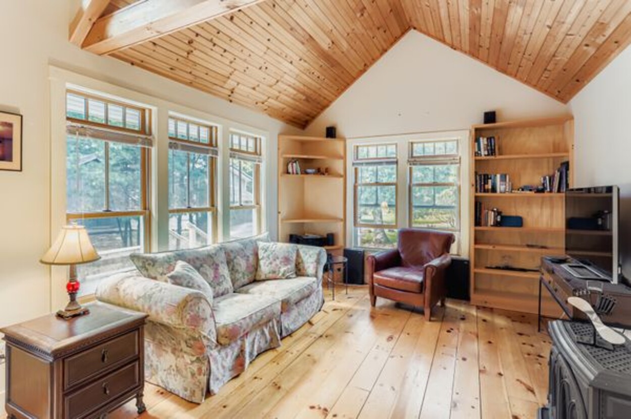Situated away from the main house, the charming guest house was built in 2004. It is a cozy retreat with warm wood ceilings throughout the two bedrooms, plus one bathroom. The full kitchen/living area has vaulted wood ceilings making it feel even more spacious. Below the house, a large workshop provides an additional area for hobbies, projects, or whatever you wish. A composite deck and private outdoor shower make the guest house completely independent from the main house. The solar panels on the guest house roof were added in 2014 and service both homes. Between the homes, you’ll find a sizable storage shed/carport, ideal for outdoor equipment, and a smaller shed designed to store firewood.