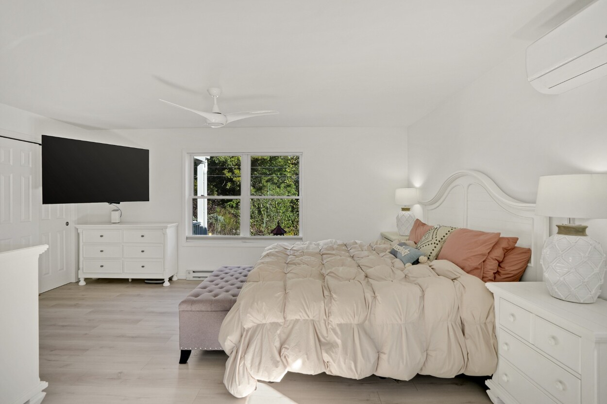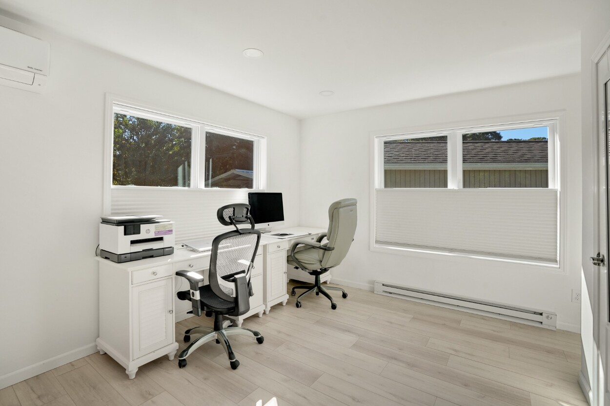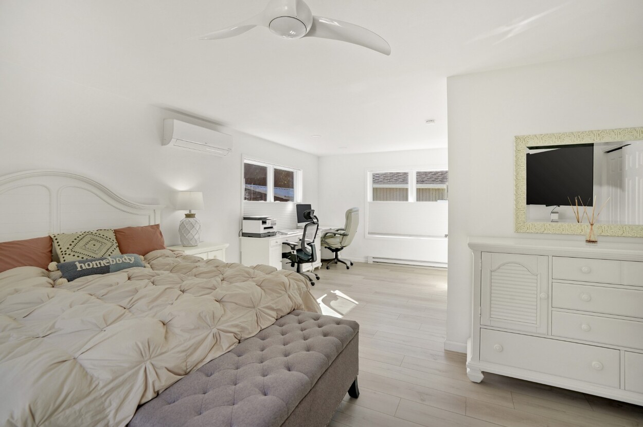 Primary Bedroom is XL and en-suite with full bathroom and shares room with an office, a walk-in closet as well as a wall-to-wall closet on the opposite side of the room.
