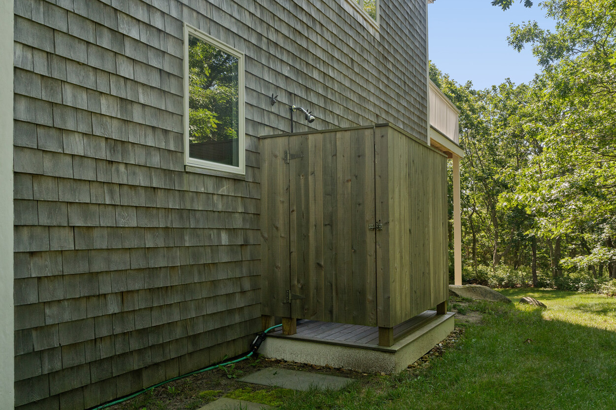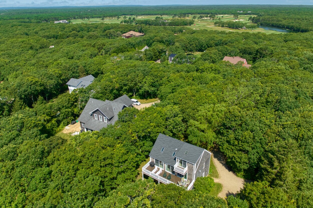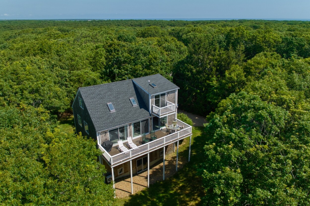 Nestled in a tranquil residential neighborhood, at the top of a curved drive through beautiful trees, this well-maintained home in move-in condition offers an idyllic Martha's Vineyard lifestyle. Custom-built for quality and convenience by a prestigious Island builder, every detail was thoughtfully planned for exclusive use by the family as a cherished year-round vacation home. The open floor plan centers around the bright second-floor great room illuminated by skylights in the cathedral ceiling, and a wall of sliding doors leading to a large deck overlooking lush green treetops with grill and dining areas for al fresco entertaining. A third-floor loft provides overflow for guests or a lounge area with its own balcony for sunbathing or stargazing. The entry level includes a large primary bedroom with en-suite bath, a convenient laundry alcove, and two additional bedrooms with a shared bath and soundproof insulation. New mahogany outdoor shower and shingles, recent rugs, roof and skylights are just a few of the improvements.