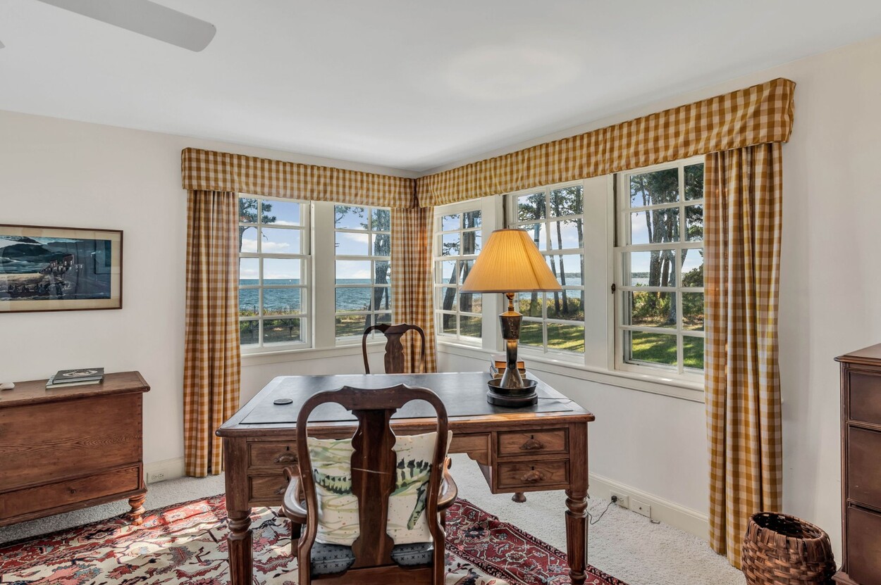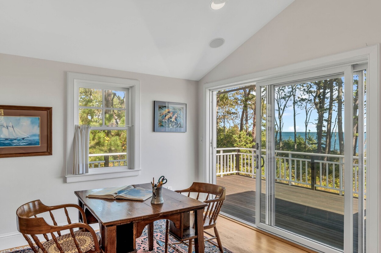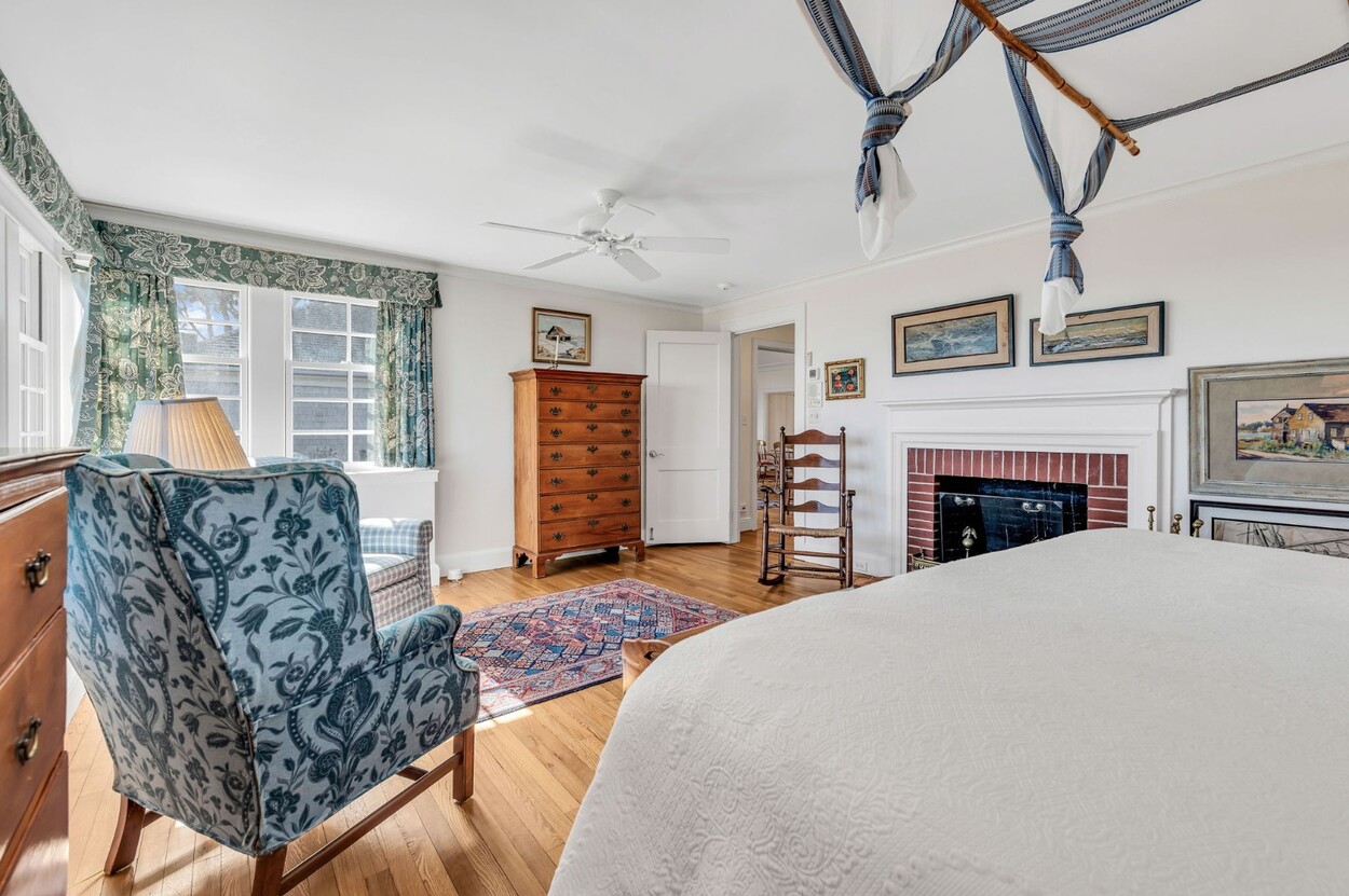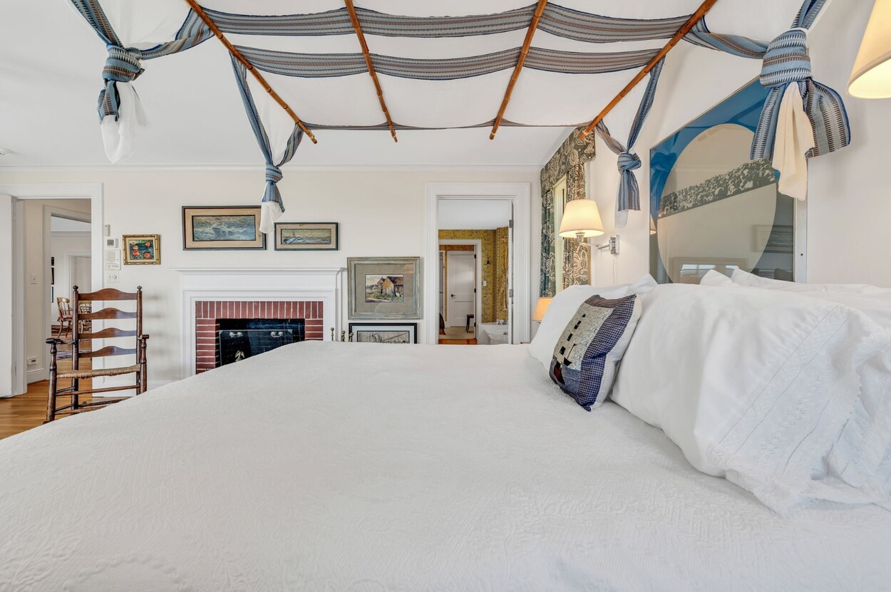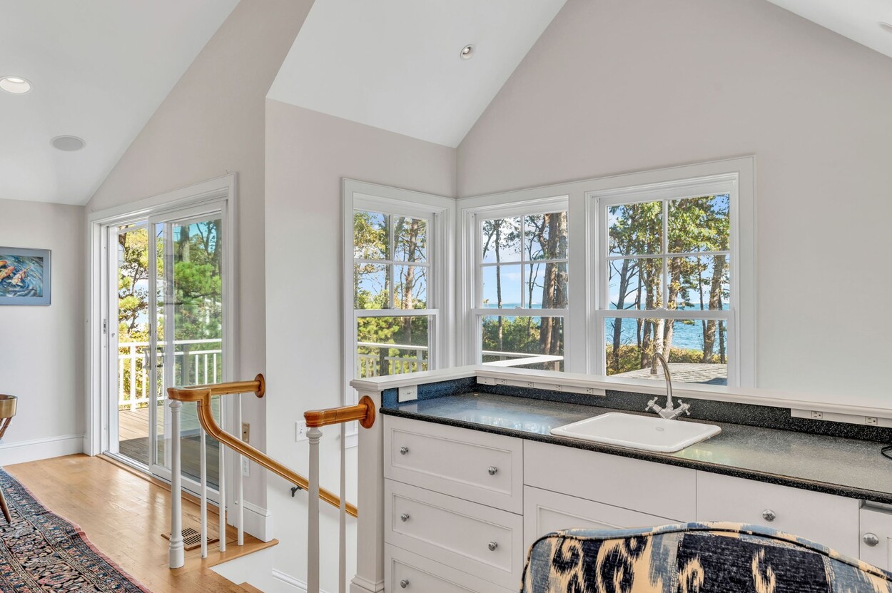 Set on 1.75 acres this waterfront home features 200+/- feet of sandy beach on the outer harbor in the community of West Chop. Upon entering the home, the stunning view of the outer harbor and Nantucket Sound is breathtakingly beautiful. Perfect for hosting large parties or intimate family gatherings the spacious living room spills onto the large deck through two sets of French doors. Gleaming hardwood floors and a fireplace surrounded by built in bookcases add to the charm of this inviting center of the home. The kitchen includes a breakfast nook complete with a raised hearth fireplace and opens to the screen porch and barbecue deck. The cooks in the family will enjoy gathering around the large center island for meal preparation. An abundance of cabinets and counters plus a large butler's pantry completes this well-designed space. Every room enjoys a view of the water, especially the master suite featuring a sitting area with its own fireplace and a corner framed by a cluster of windows looking out to Nantucket Sound. The luxurious bath and double walk-in closets add to the comfort of this private retreat. Three additional bedrooms, one with an en-suite bath and two with a shared bath, are tucked in a separate wing on the opposite side of the house. Over the attached three-car garage, a delightful guest suite offers two bedrooms, a full bath, sitting area, kitchenette and private deck with views of the Sound. Central air conditioning and forced hot air heat. Title 5 septic system designed for six bedrooms. Portable generator.